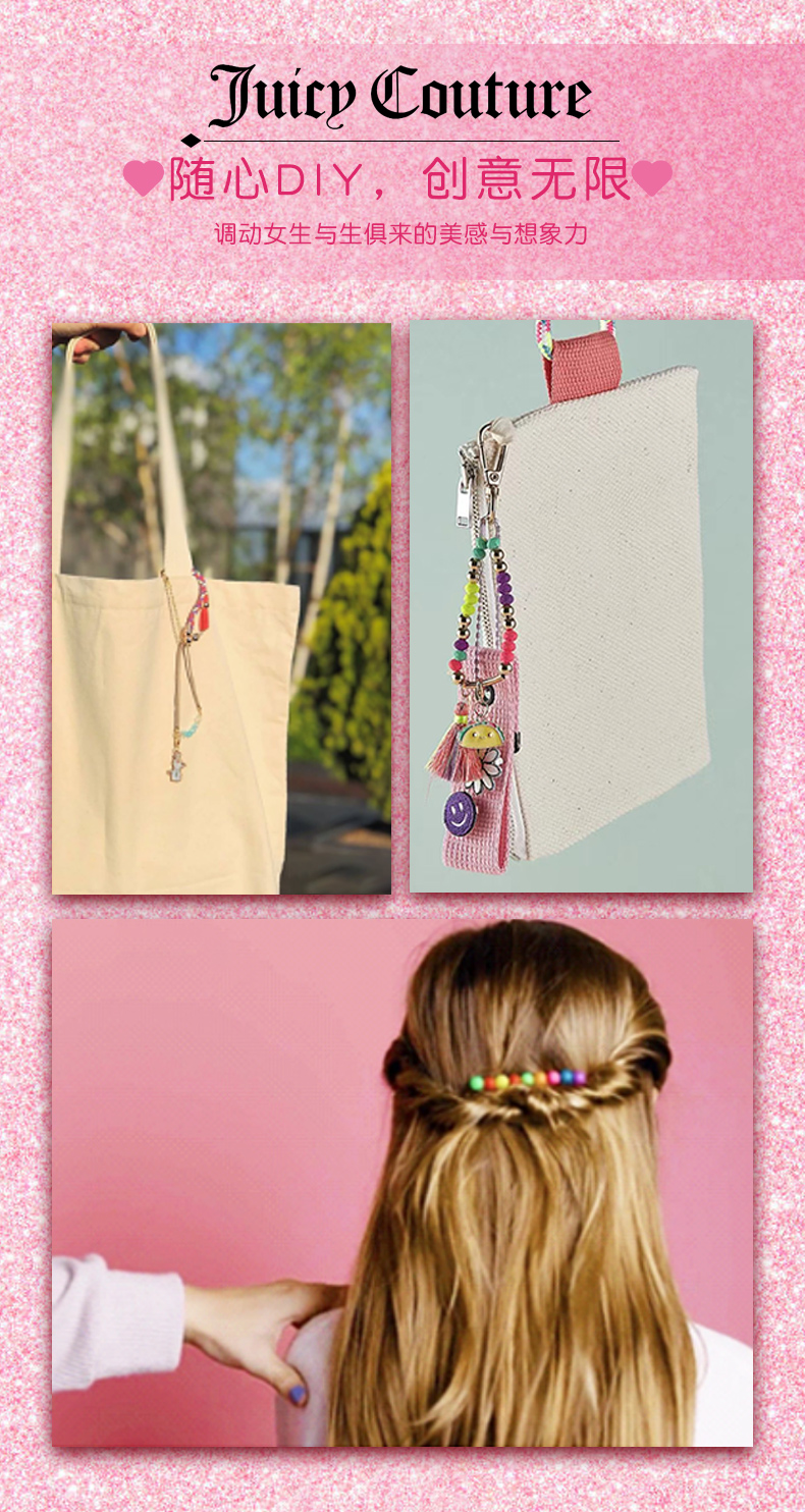 盲盒2:1根透明弹力绳,1根粉色绸缎绳,3个挂饰,1个金属串珠,彩色珠珠若干
