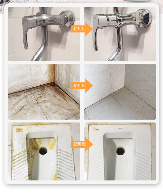 3.由于清洗力原因,本品可能会造成个别材质表面的褪色或色差,建议只使用在陶瓷、搪瓷、铁、不锈钢、玻璃表面。