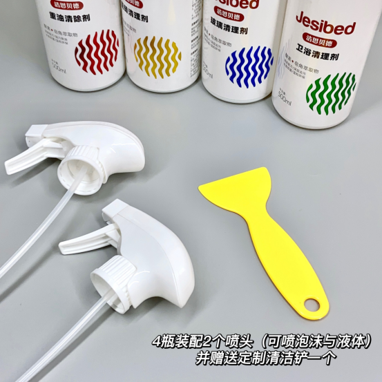 【套装内容】:(重油清除剂+卫浴清理剂+瓷砖清理剂+玻璃清理剂)各一瓶+配2个喷头(可喷泡沫与液体),并赠送定制清洁铲一个。