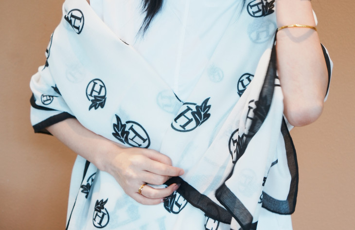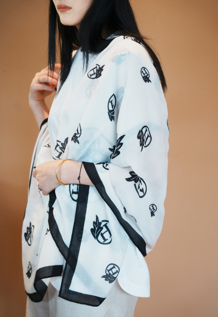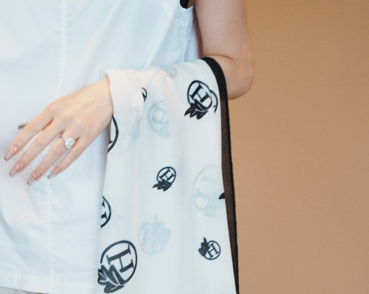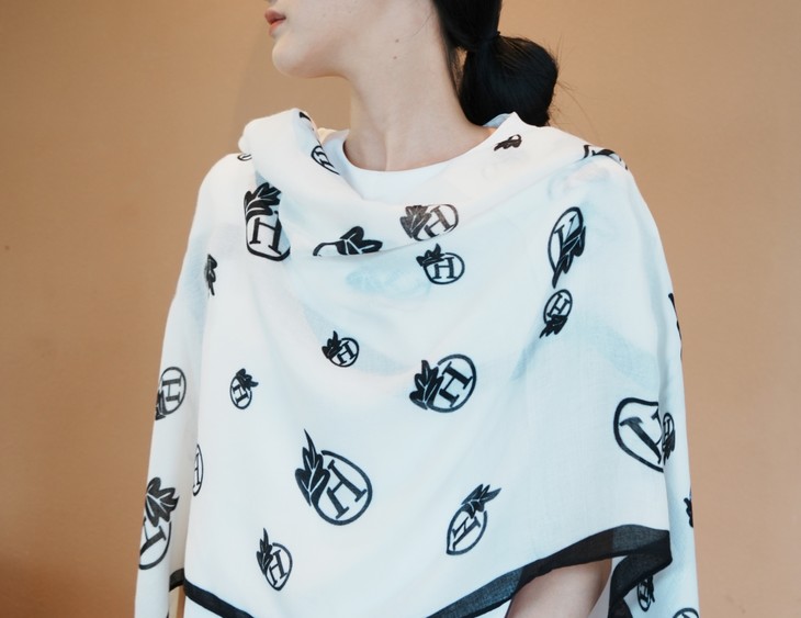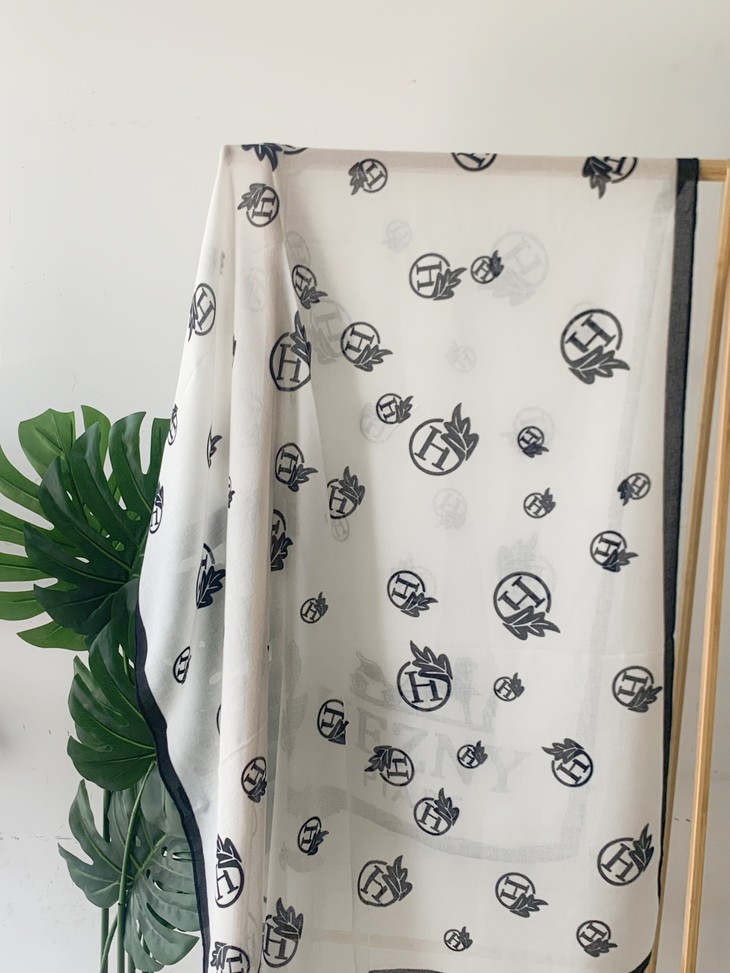 第二款,H叶影梦境 以纯净的白色为底,宛如一片无暇的画布 黑色的 H 字母与精致的树叶图案相互交织, 宛如一幅艺术画作🎨 材质轻柔顺滑,触感极佳 当它轻轻拂过肌肤,仿佛是微风的轻抚😌