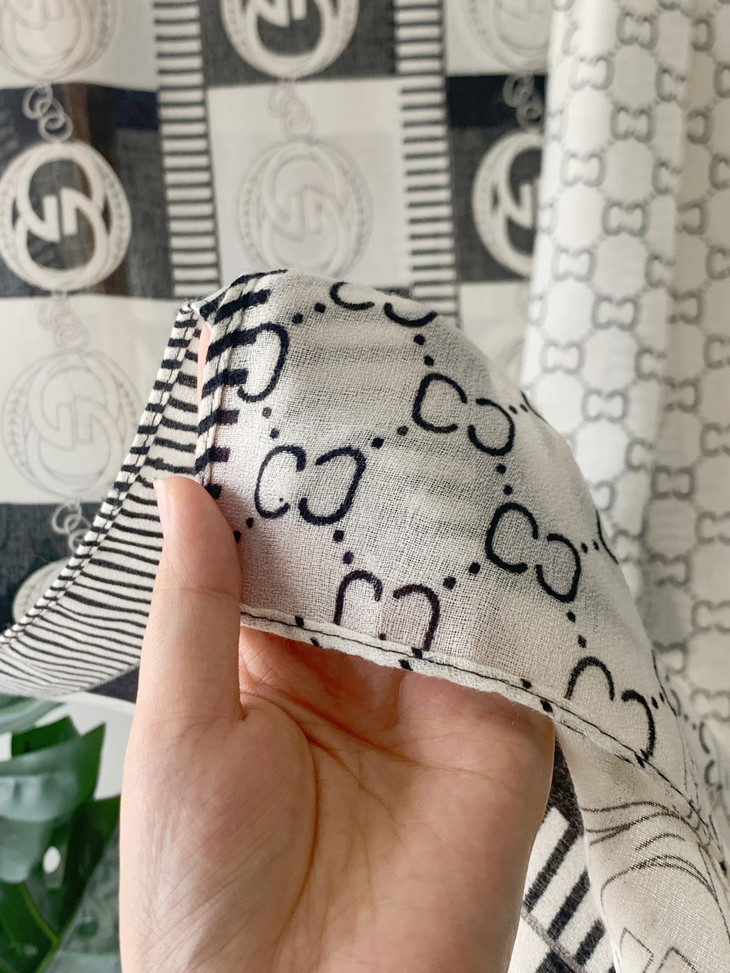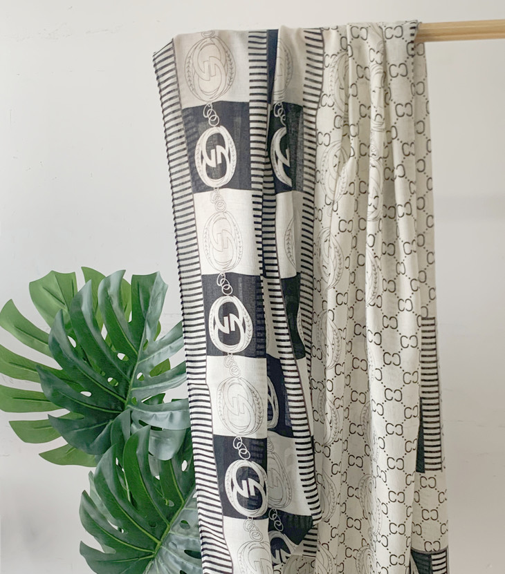 面料:人造丝 成分:100%的Viscose(粘胶纤维) 第一款,CC 香榭丽 黑白条纹虚实明暗对比 展现出奔放和自由 CC字母的点缀 为丝巾增添了一份动感和活力。 90*180CM的大尺寸, 不仅可以当丝巾,还能当作披肩使用 无论是在室内还是室外 都是绝佳的时尚伴侣