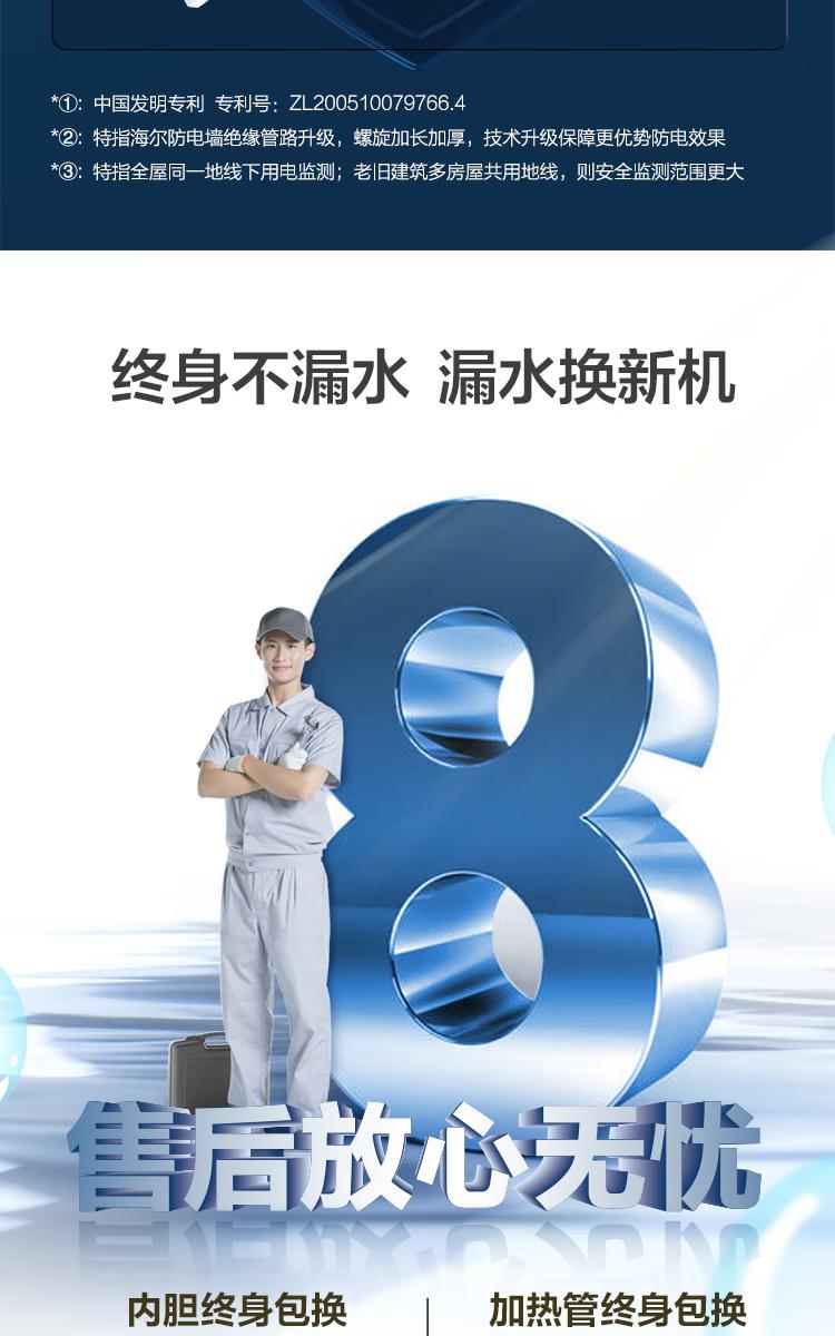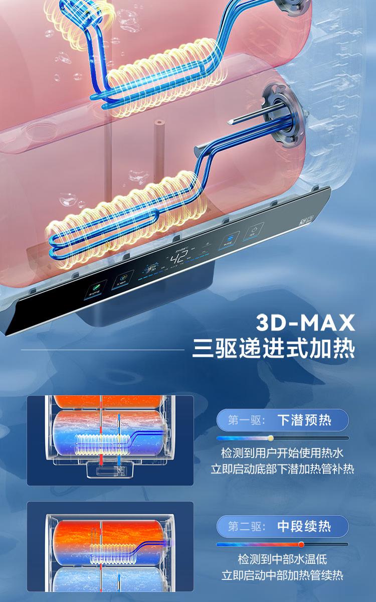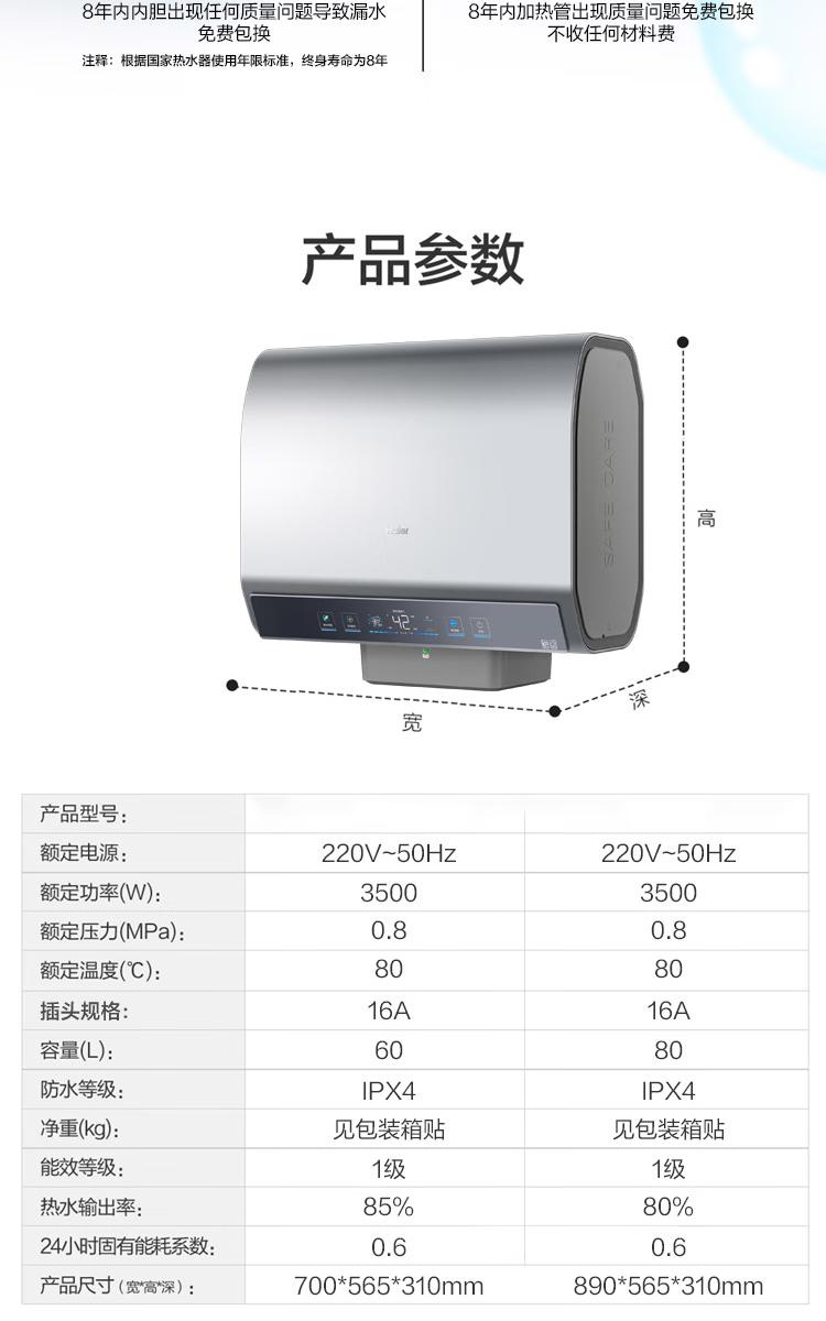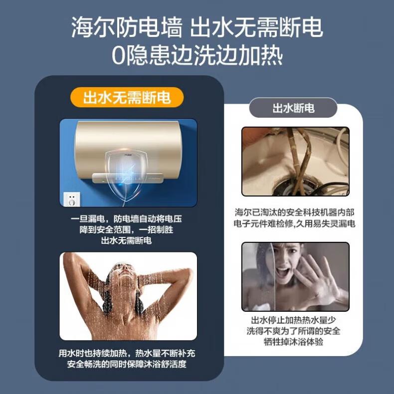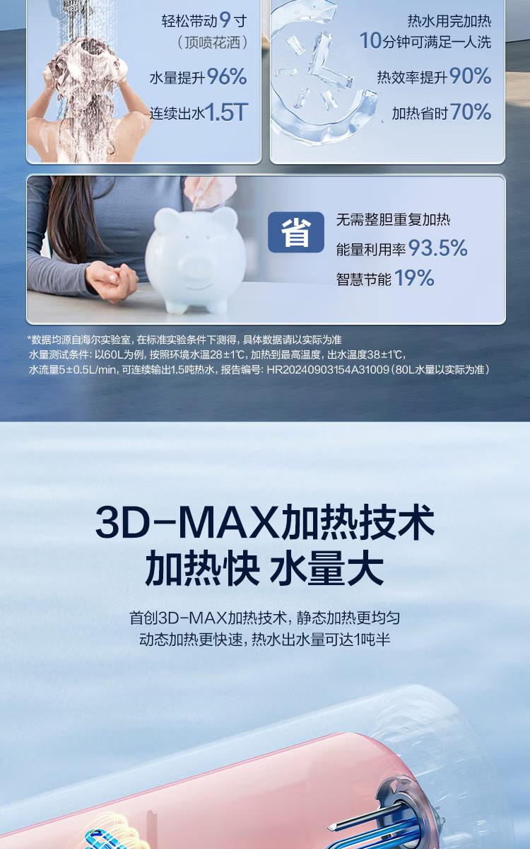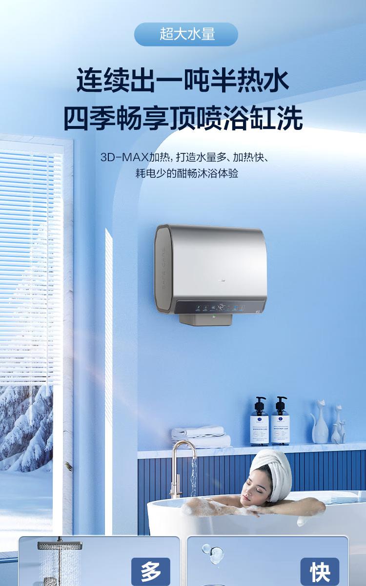 海尔(Haier)3D MAX巨能洗薄双胆电热水器扁桶变频3500W速热净水洗VIP保温 一级能效 60L 升级锆金全瓷科技 内胆免清洗