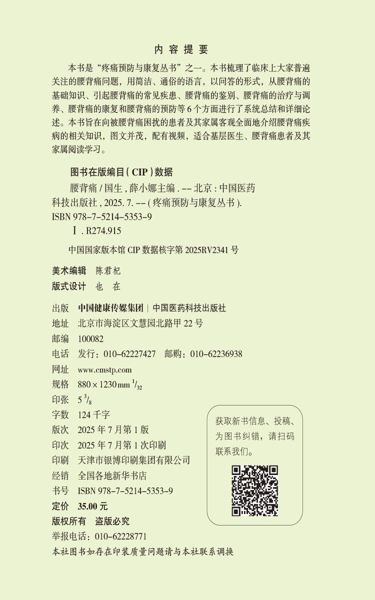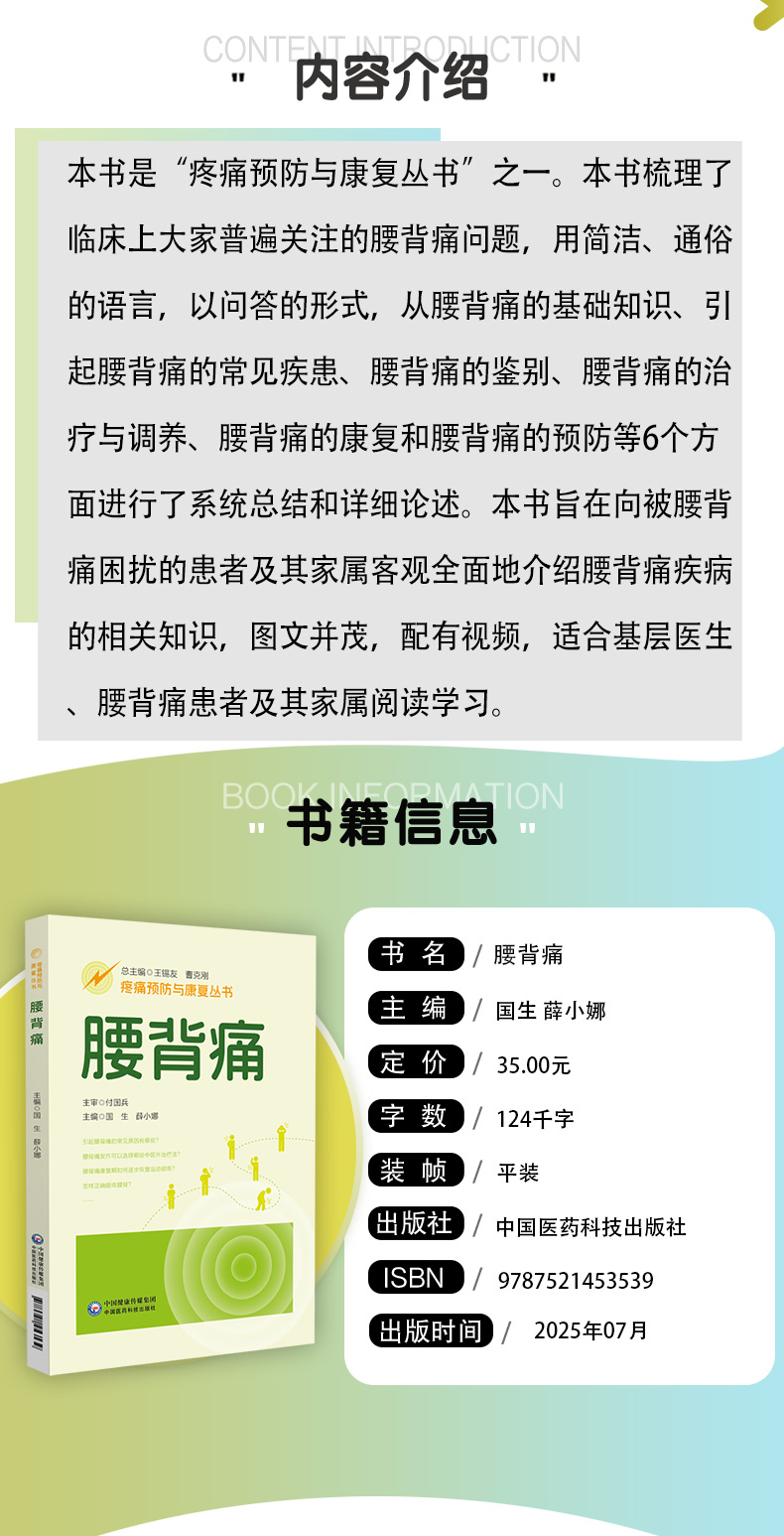 腰背痛(疼痛预防与康复丛书)国生 薛小娜 主编 全面地介绍腰背痛疾病的相关知识 配有视频 9787521453539中国医药科技出版社