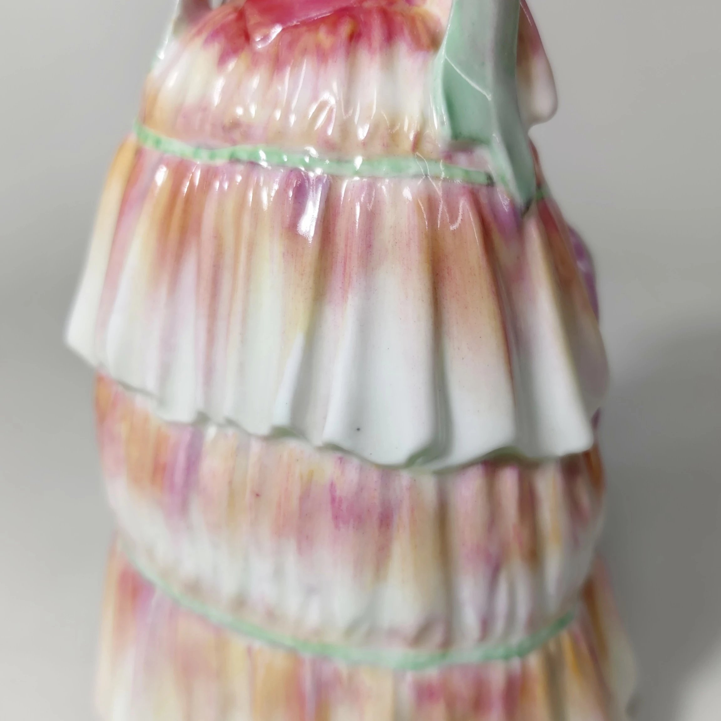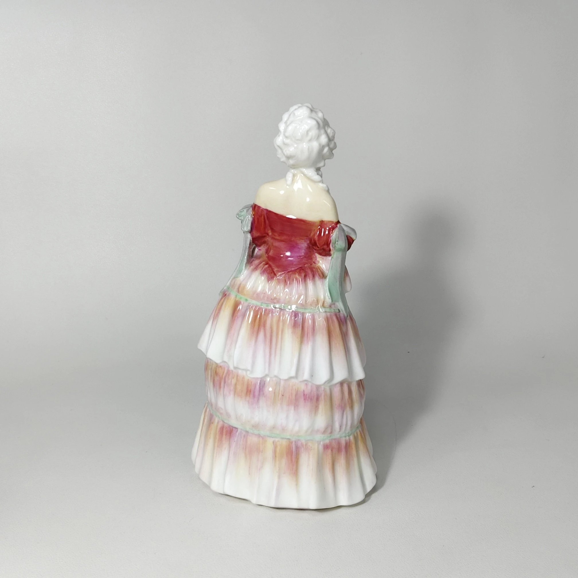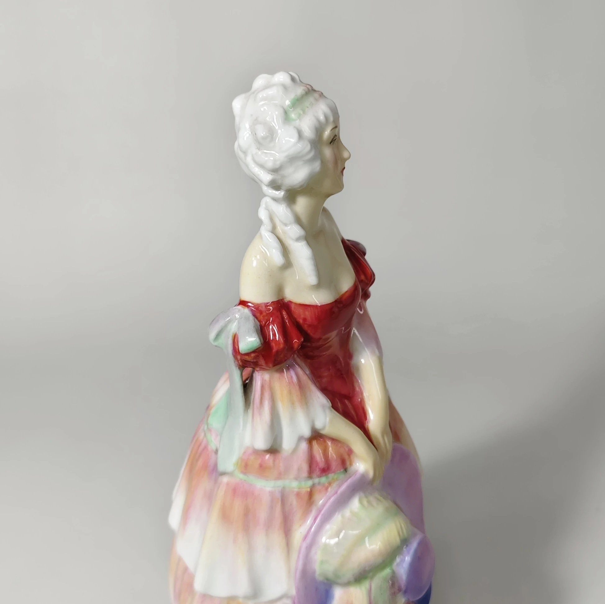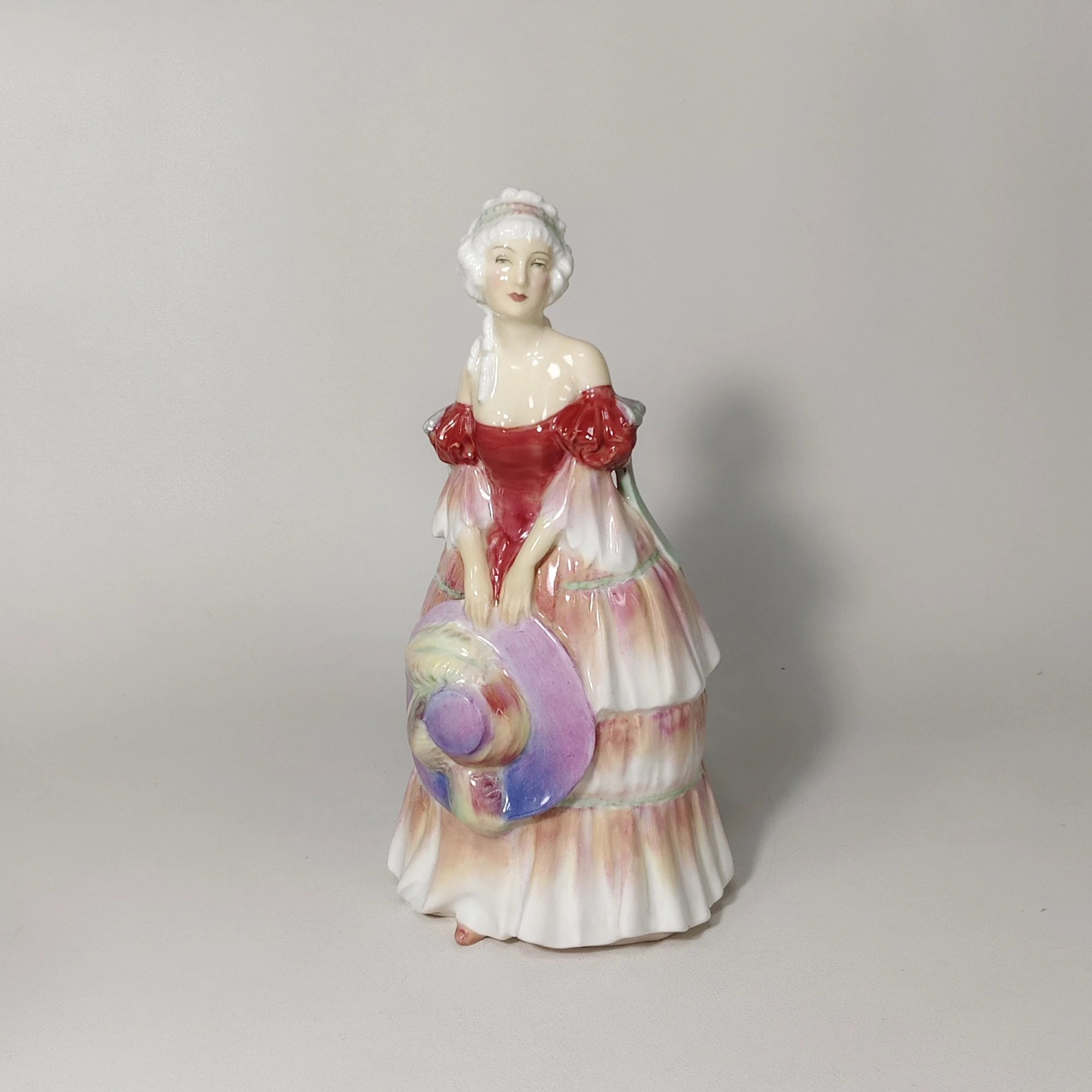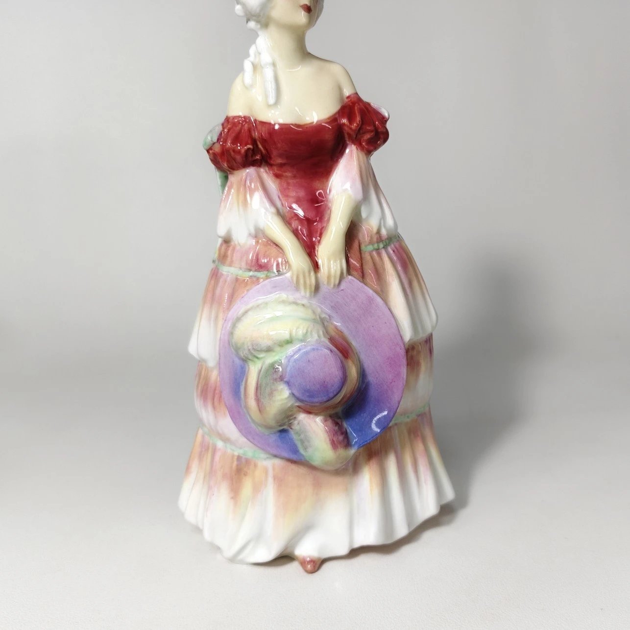 色彩渐变很梦幻的一只瓷偶,女子双手拿着帽子,姿态柔美娴静,自然流畅。