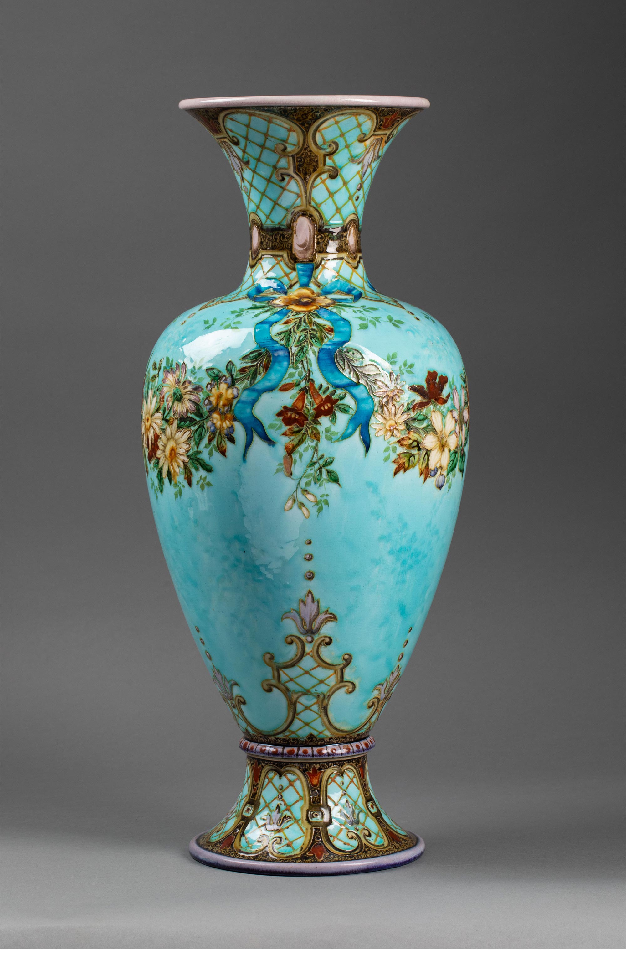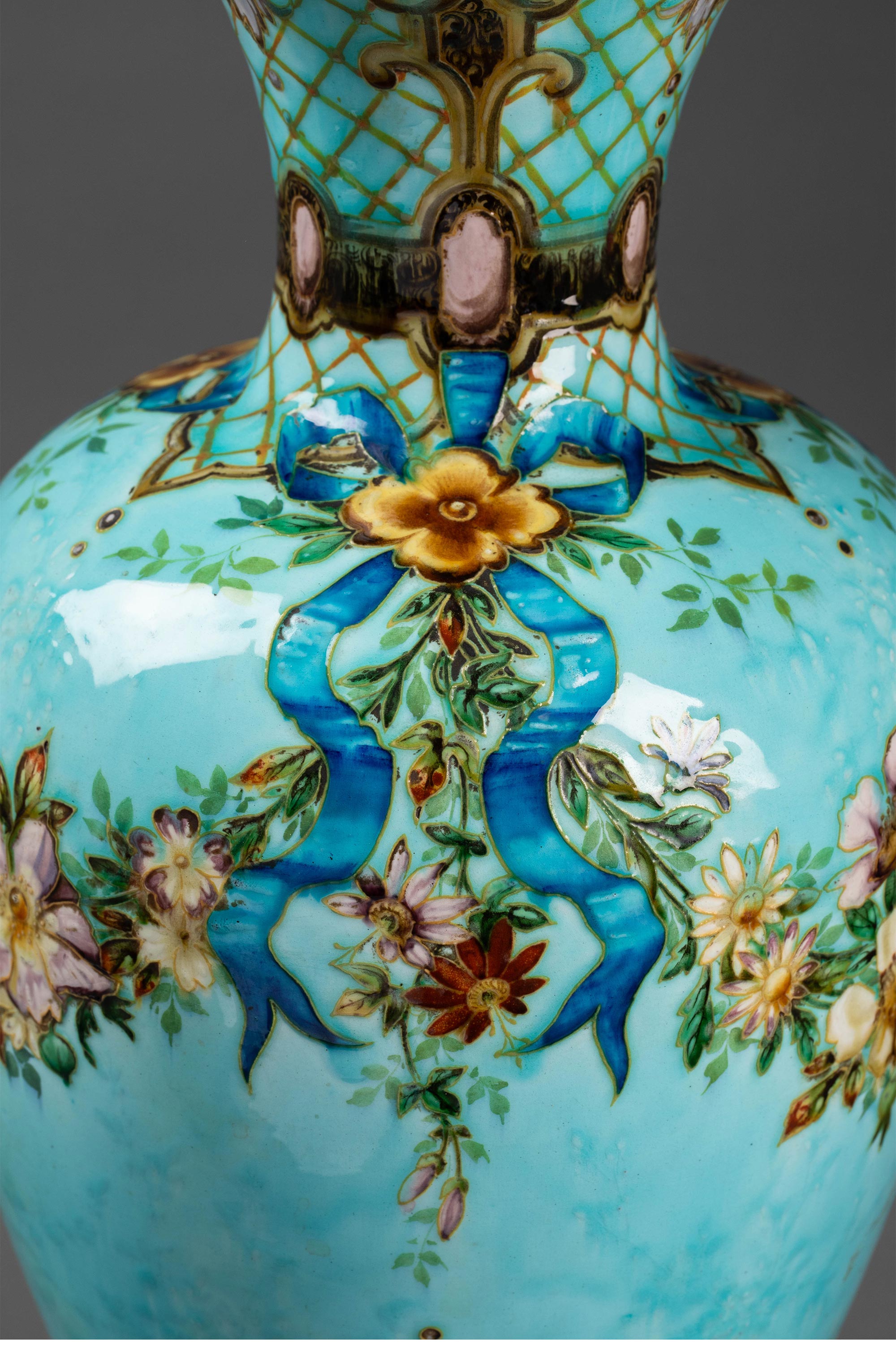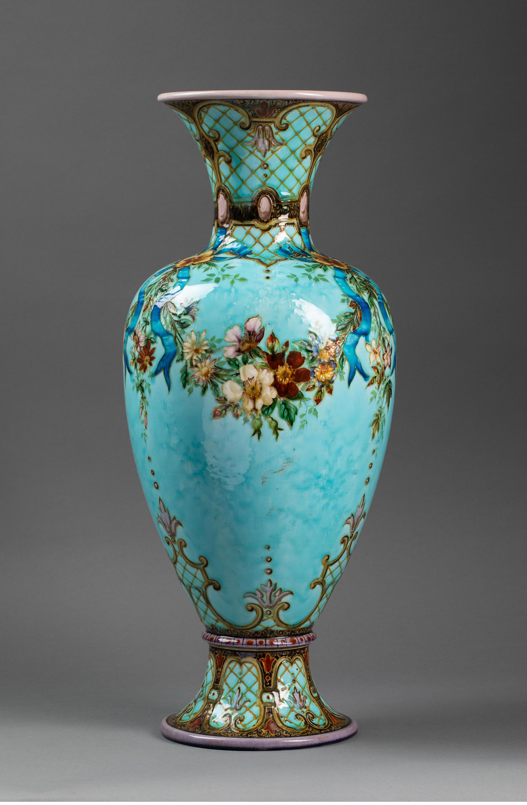 1870年代法国陶艺大师Théodore Deck签名出品花蔓飘带主题彩釉陶瓷花瓶一对