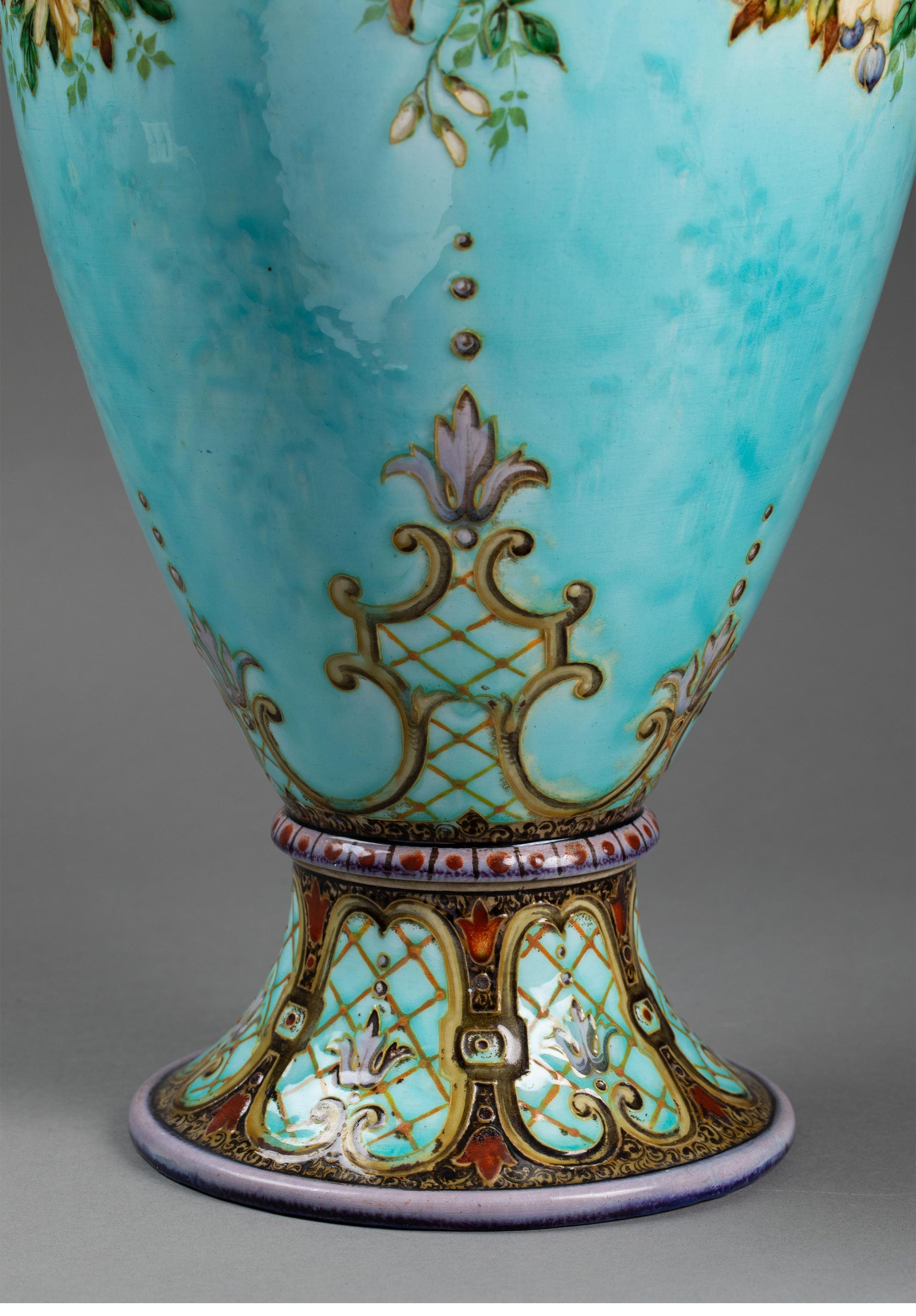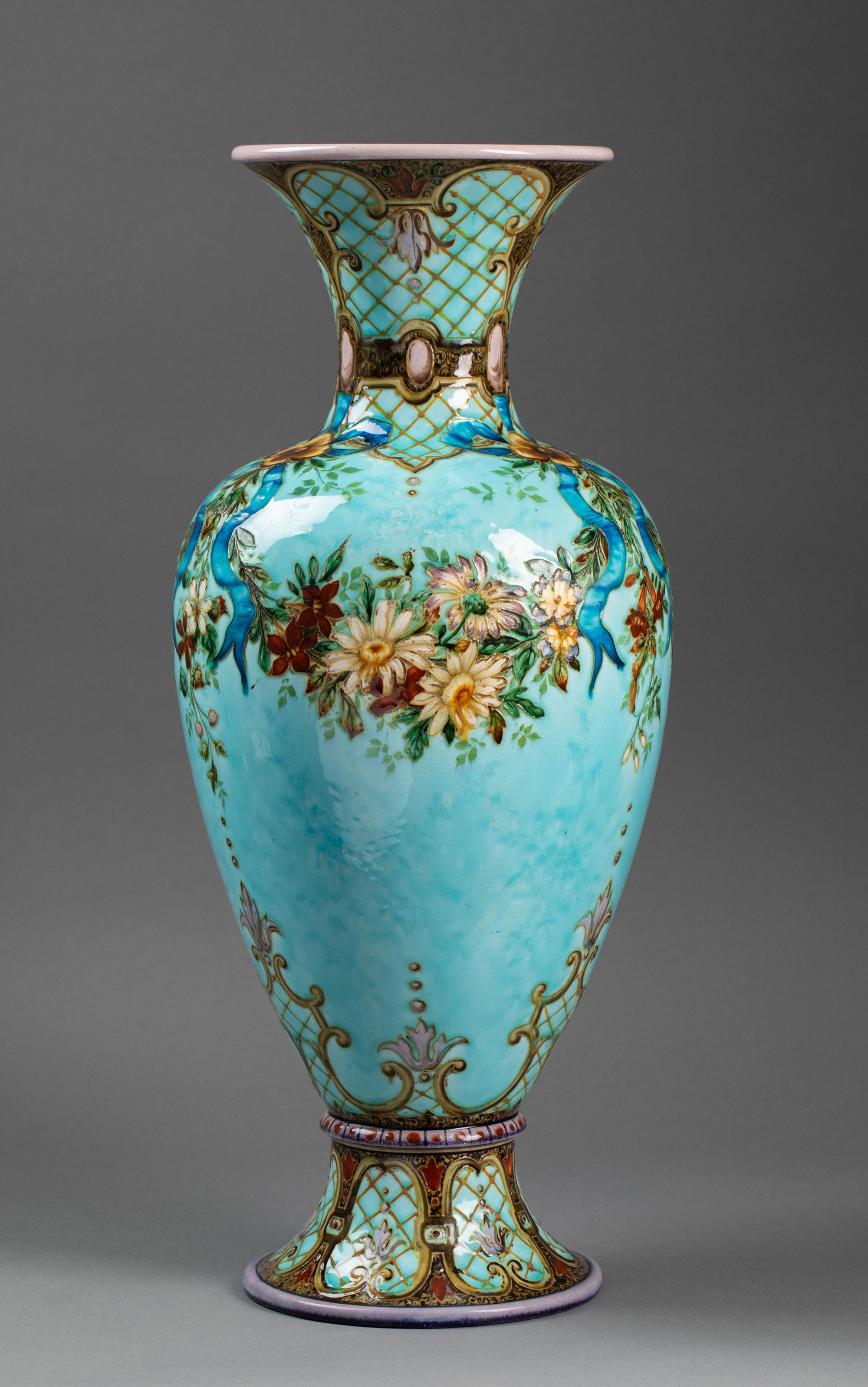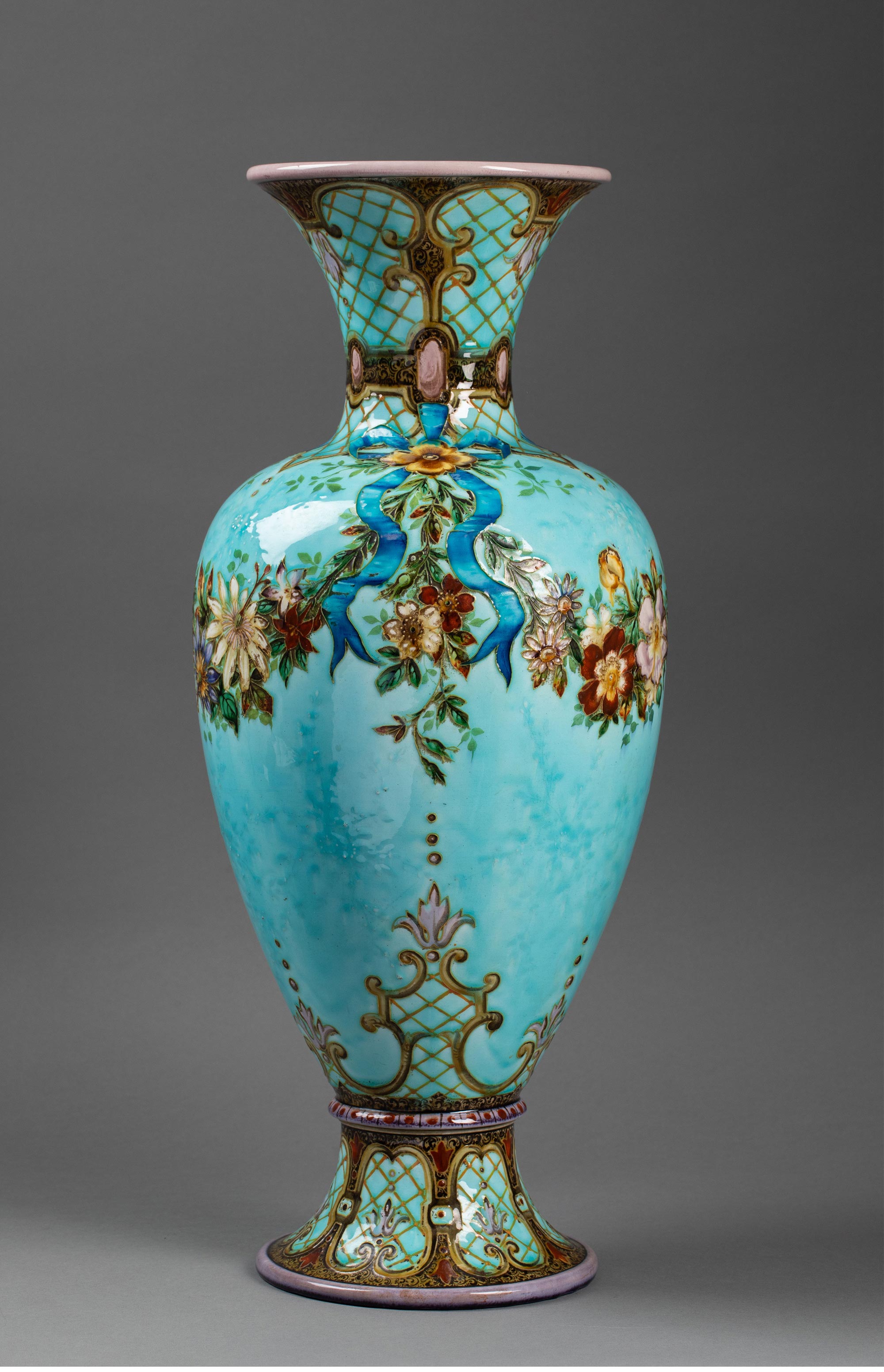 1870年代法国陶艺大师Théodore Deck签名出品花蔓飘带主题彩釉陶瓷花瓶一对