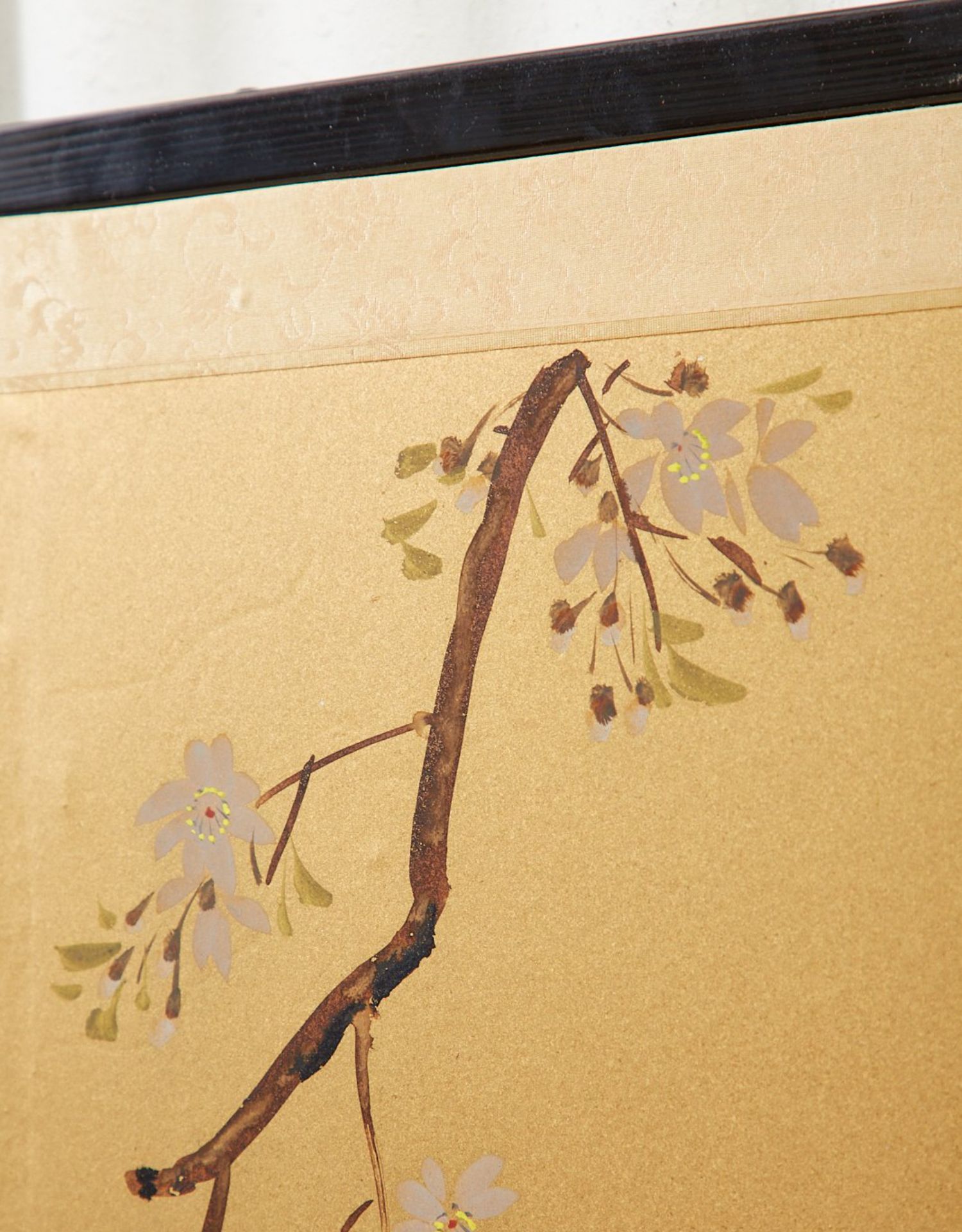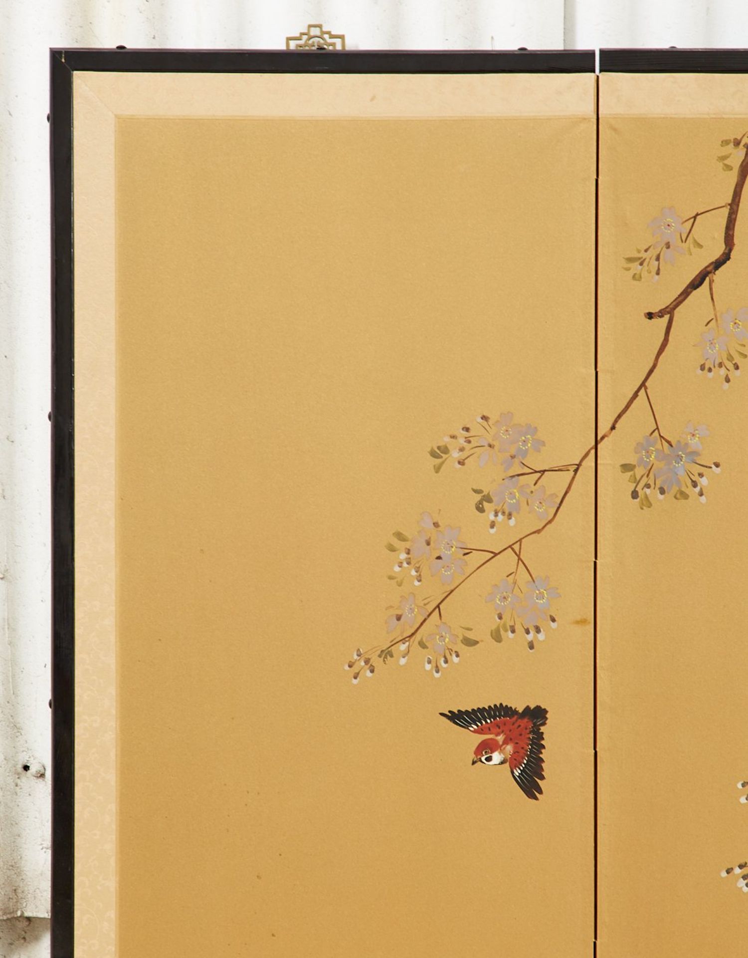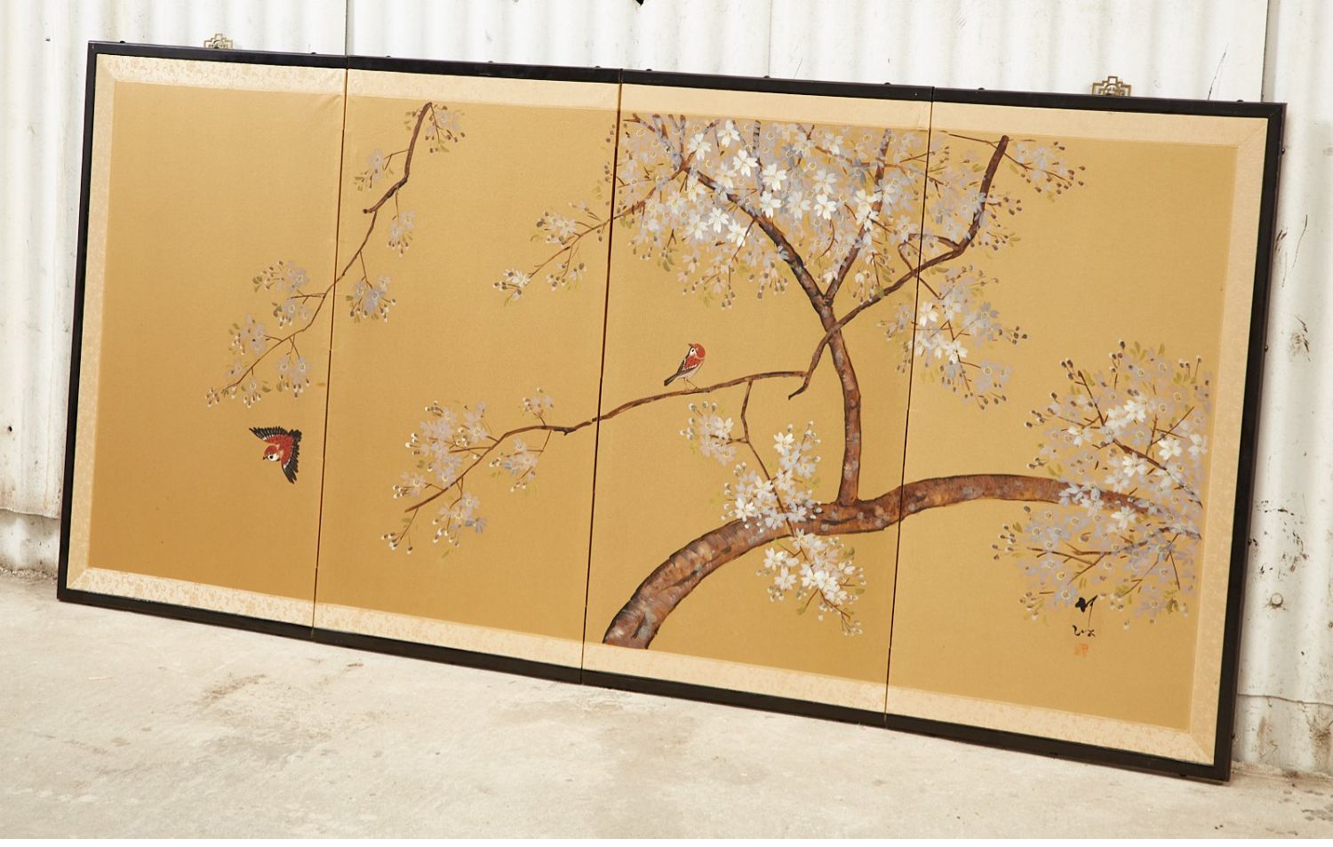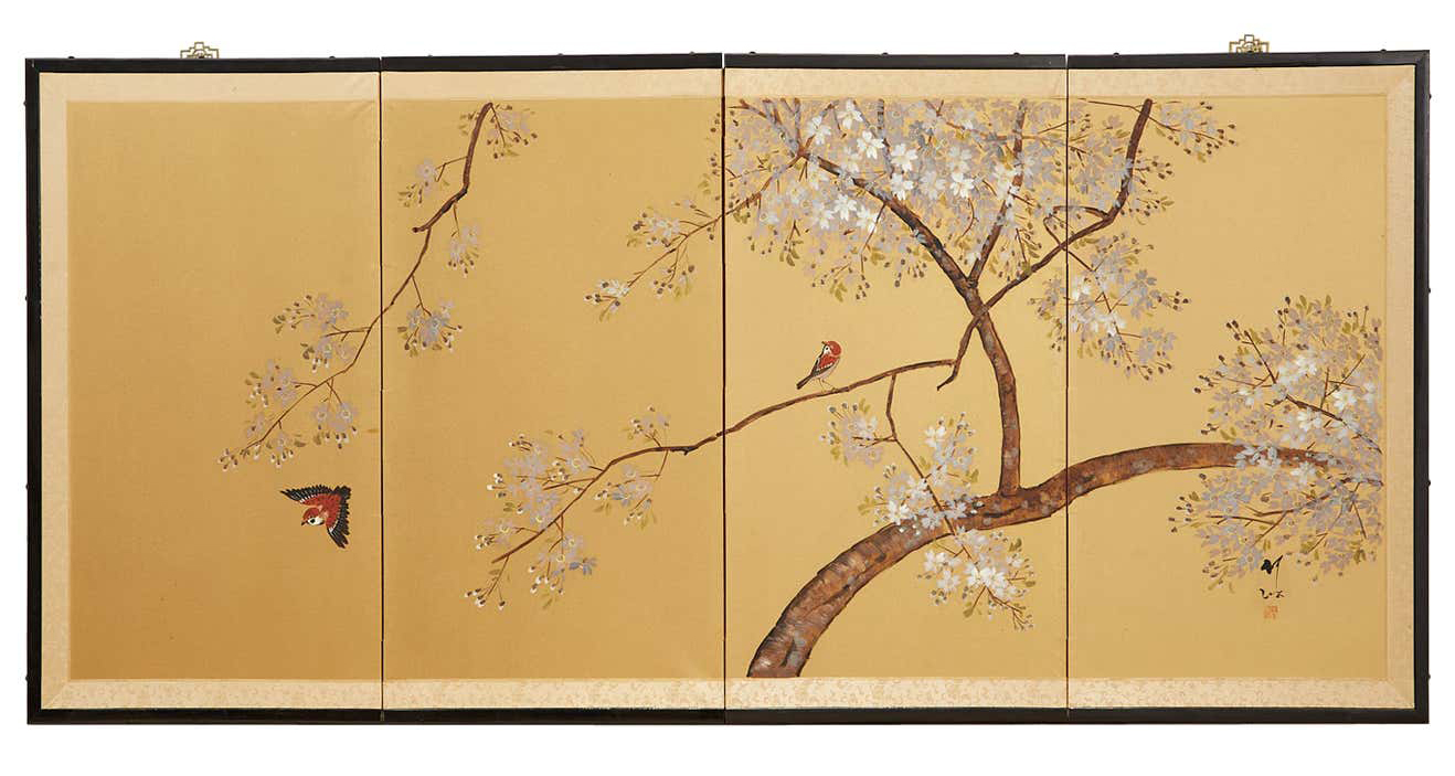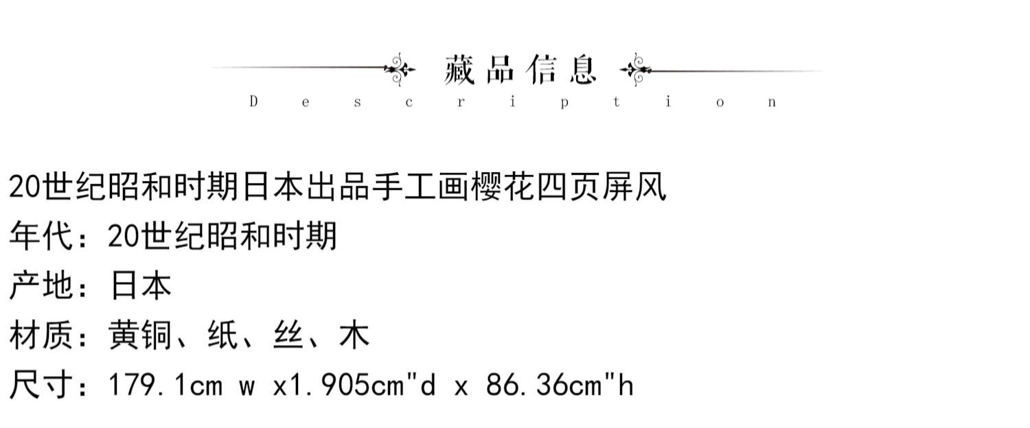 独角鹿西洋古董日本昭和时期手工画樱花四页屏风日式