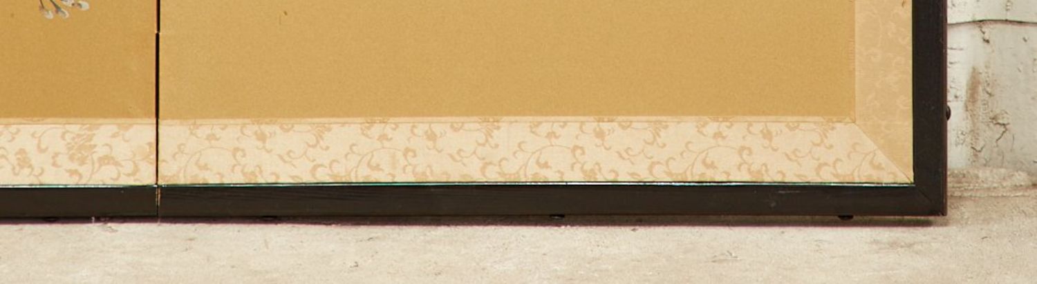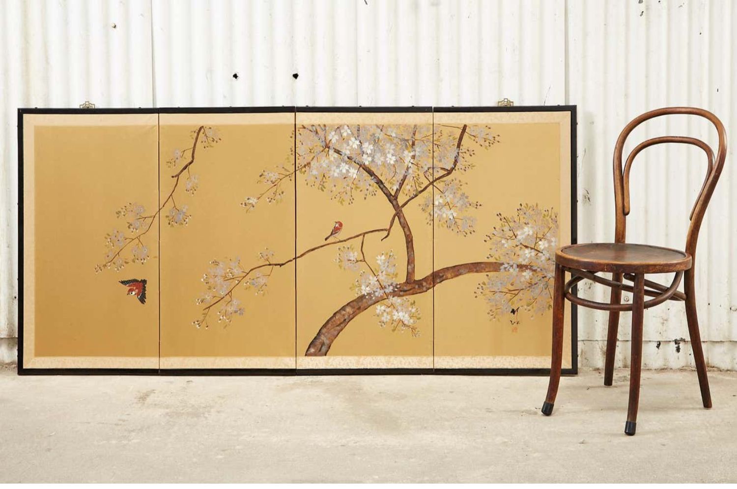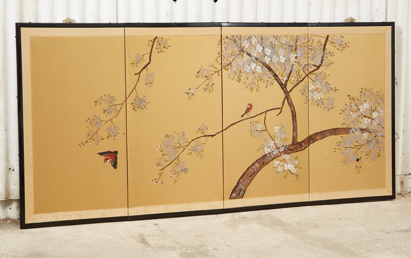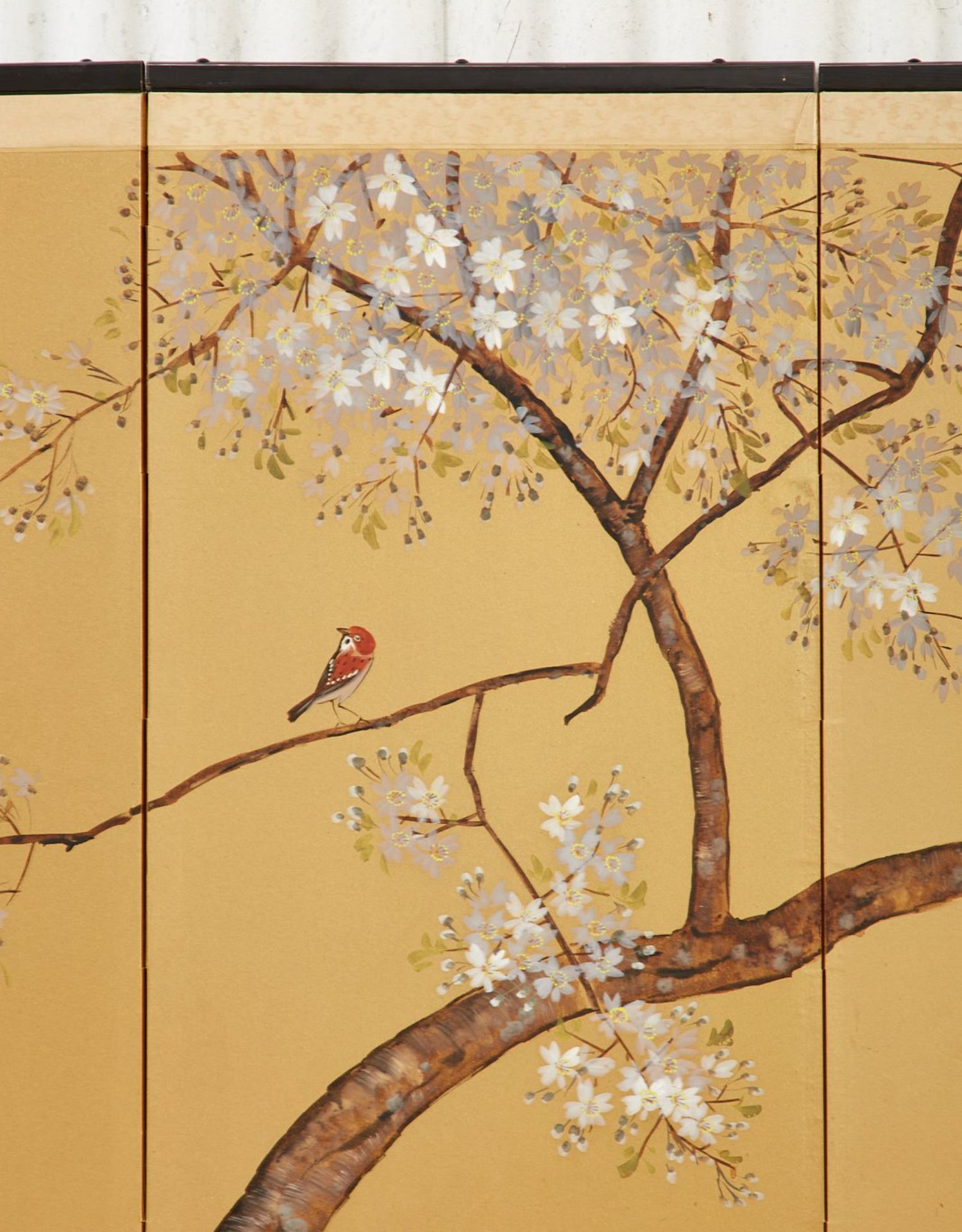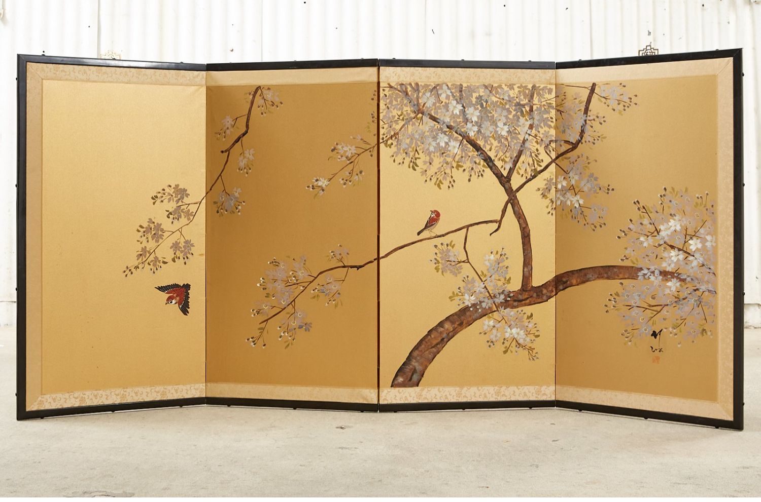独角鹿西洋古董日本昭和时期手工画樱花四页屏风日式