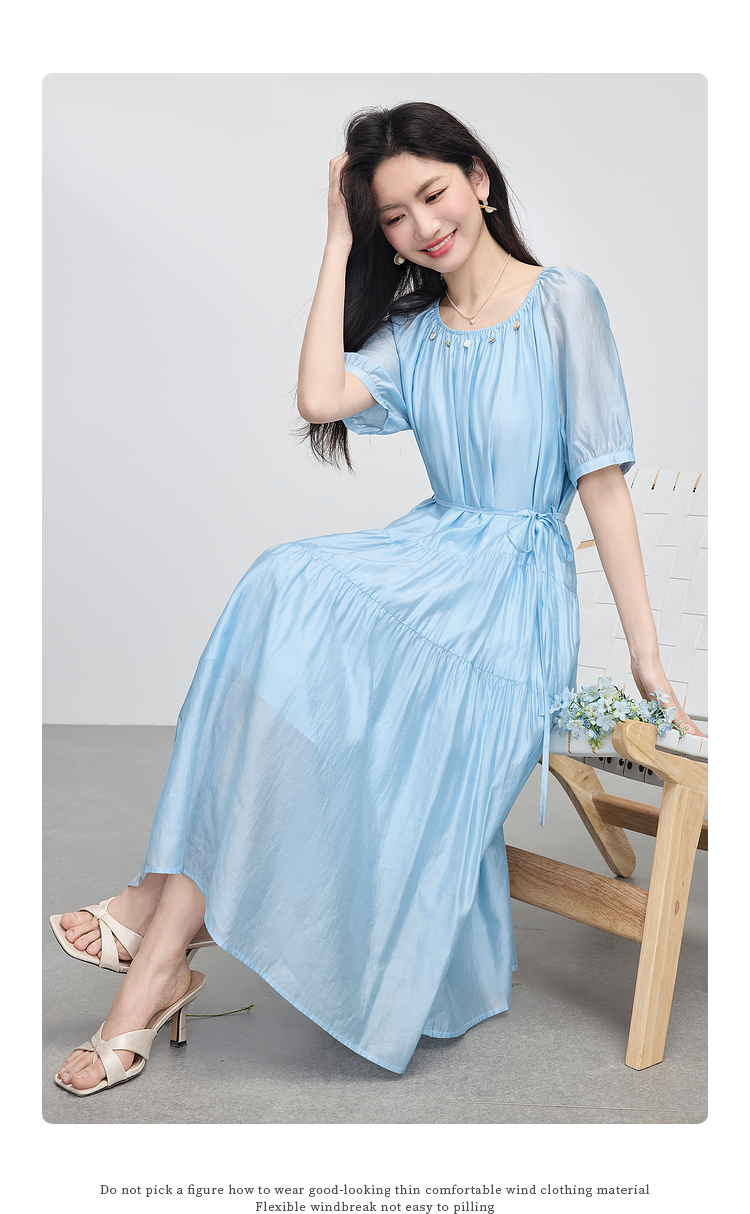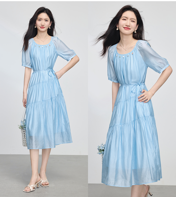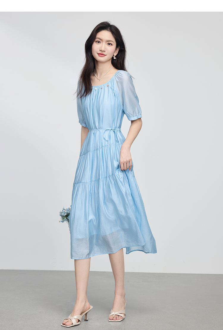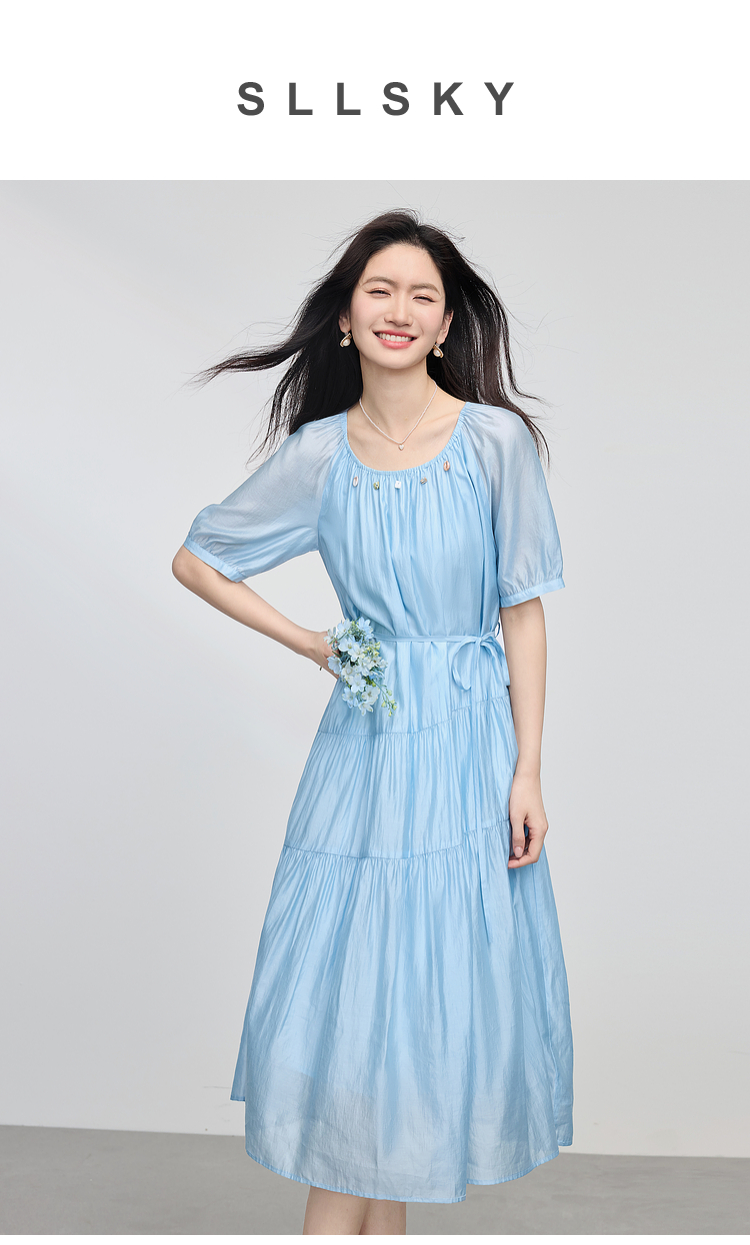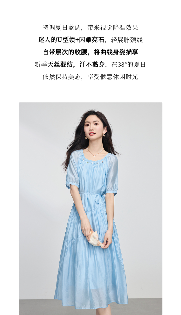 【专属特价】熙世界蓝色天丝连衣裙女夏日2025年新款法式莱赛尔大方得体的裙子