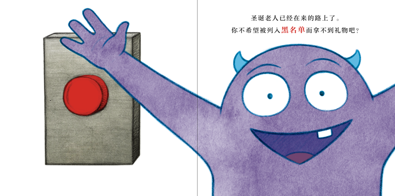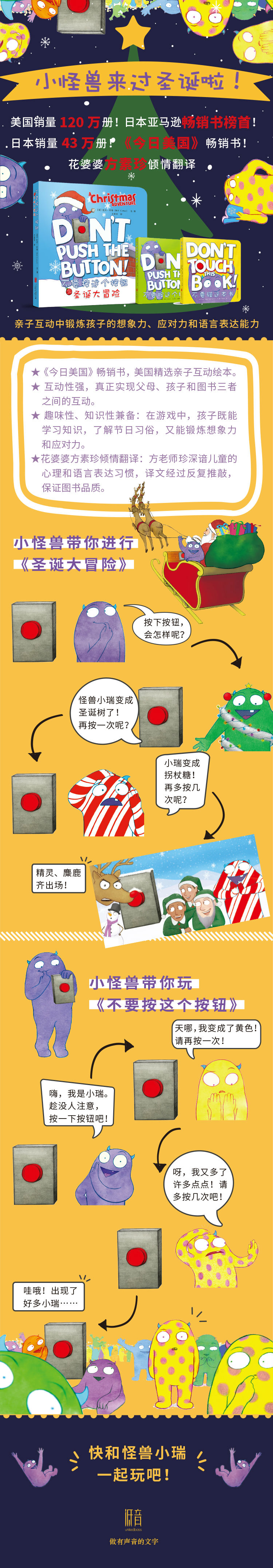 《不要按这个按钮》出圣诞节篇了,真是太惊喜了!《不要按这个按钮之圣诞大冒险》在观念和设计上保持了同系列图书的风格,互动性非常强,还加入了很多圣诞元素。我迫不及待地作为圣诞礼物买下来送给儿子,相信他会非常喜欢的。