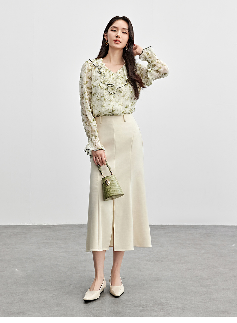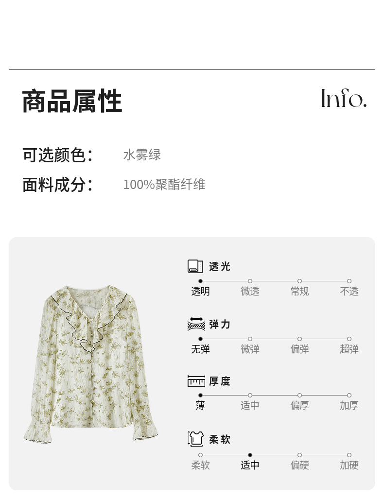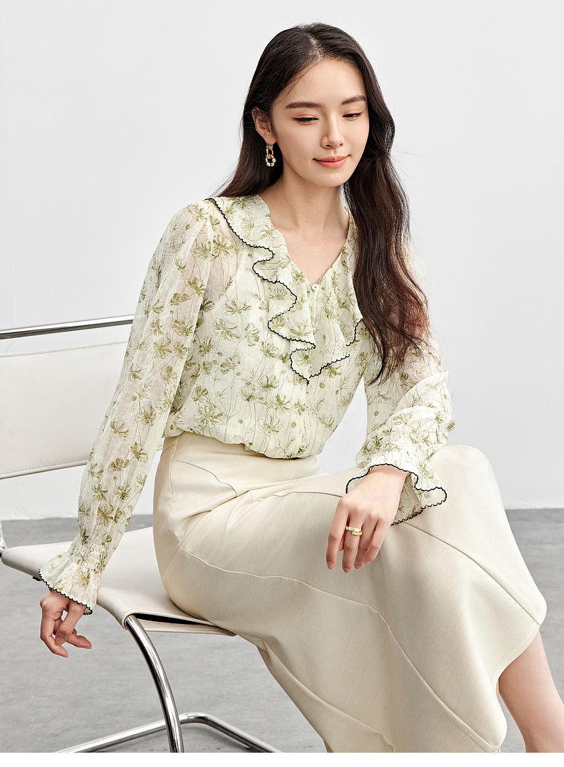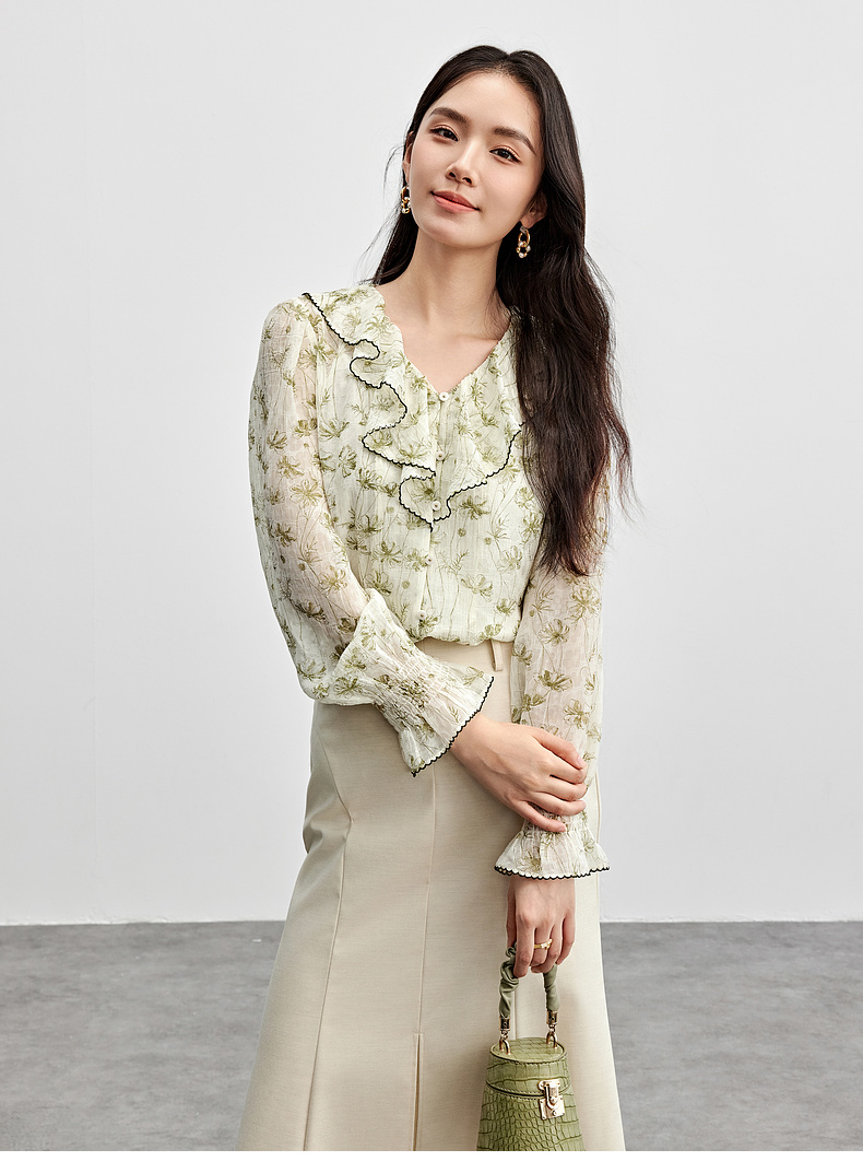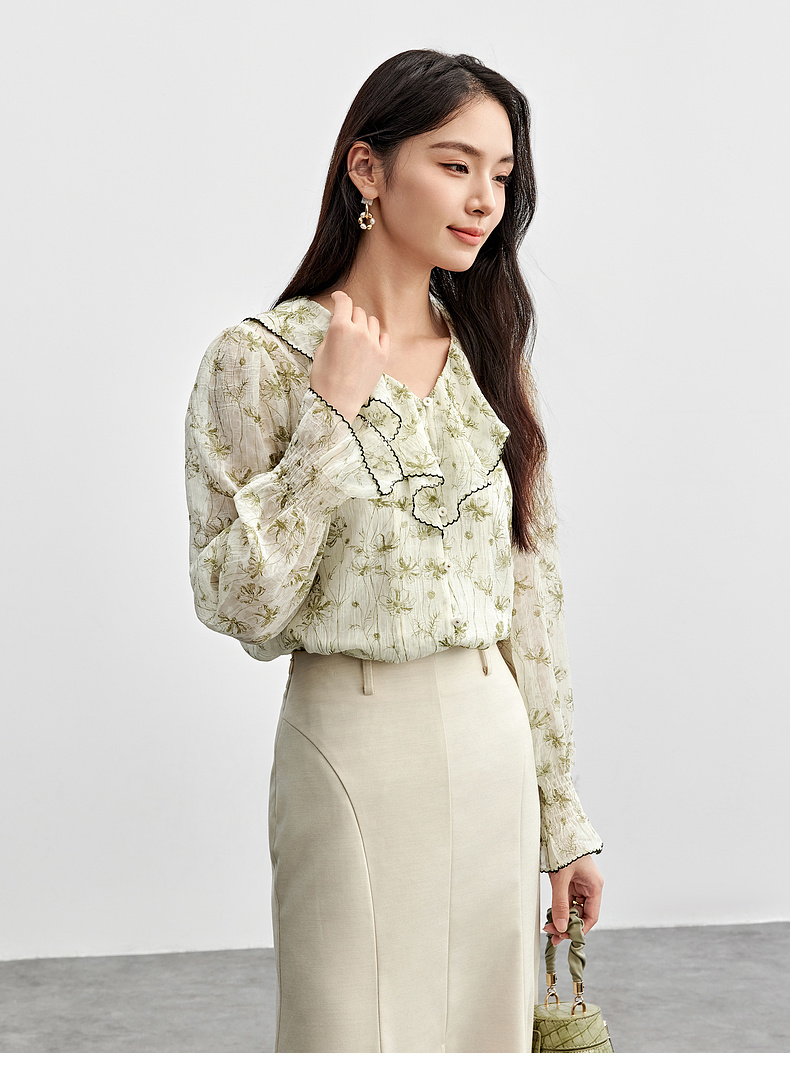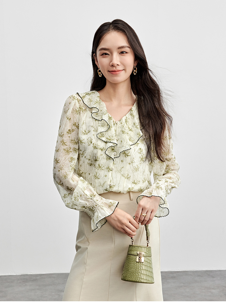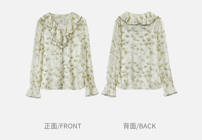 【内购】通勤浪漫撞色花边荷叶领泡泡袖印花衬衫&吊带背心-151C57888
