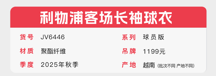 小李子:ADIDAS阿迪达斯25/26赛季利物浦球员版客场长袖球衣JV6446