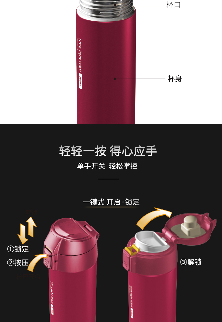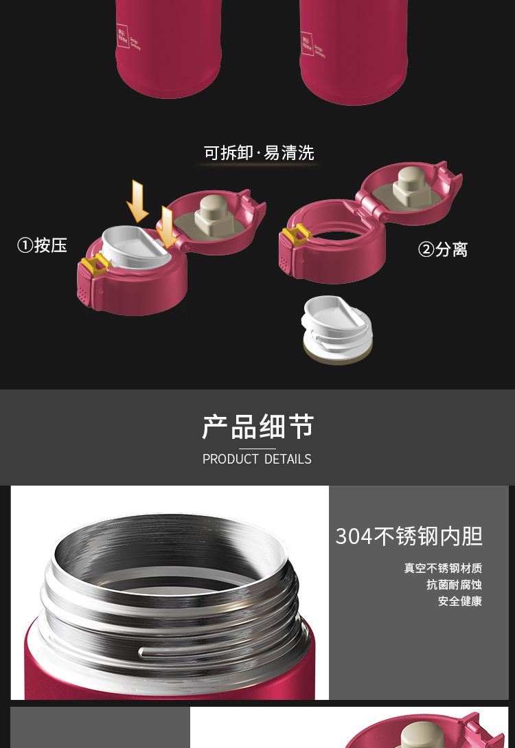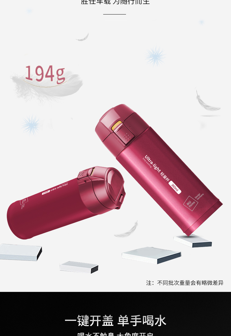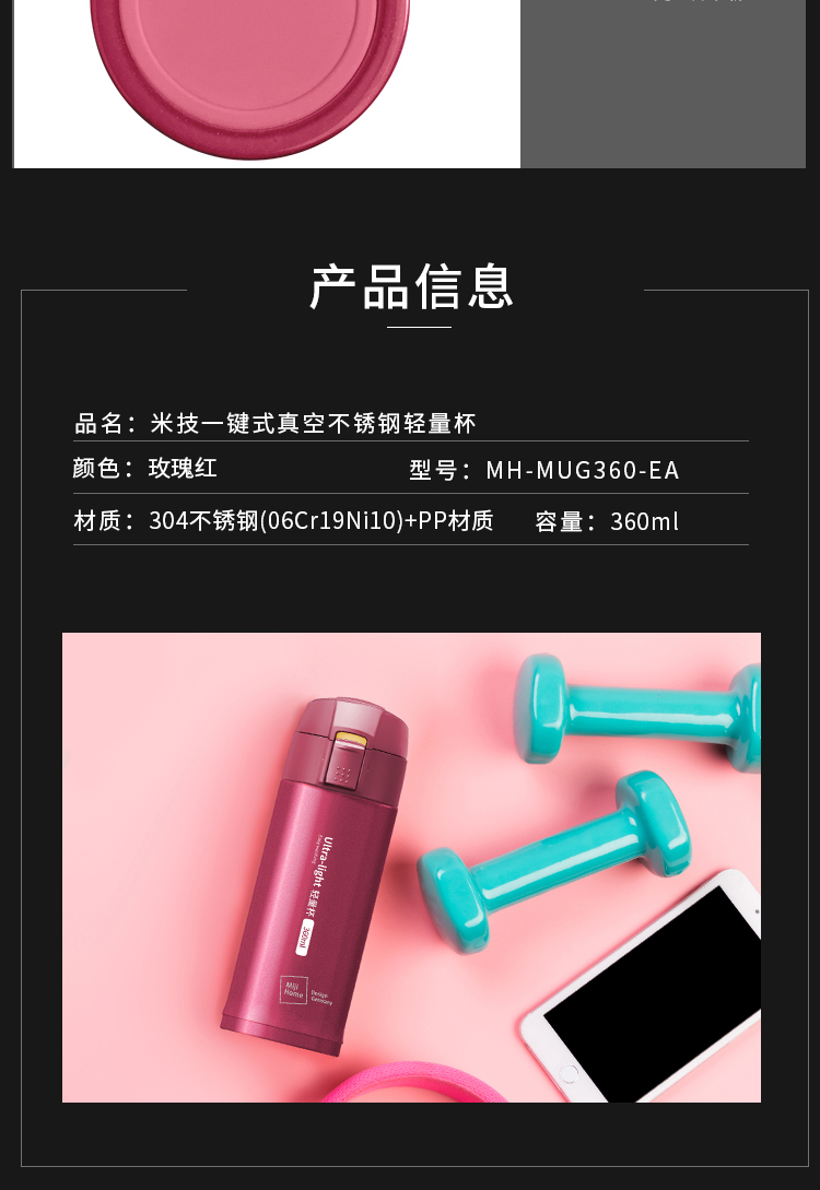 米技 一键式真空不锈钢轻量杯 360ml 玫瑰红 商品图4