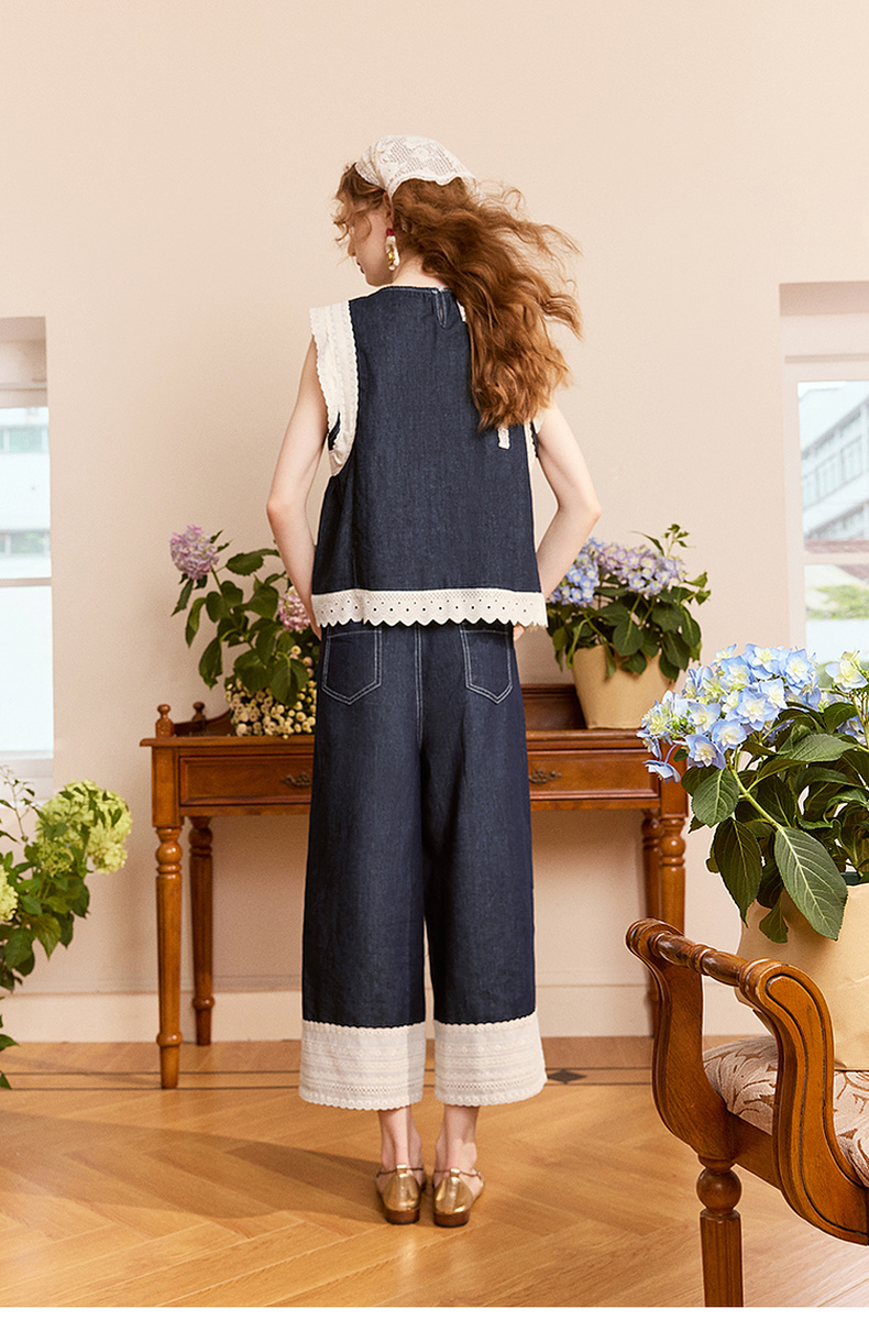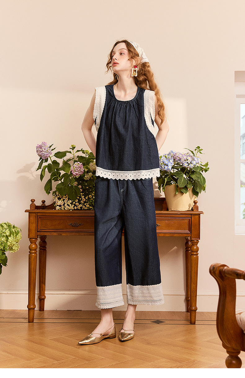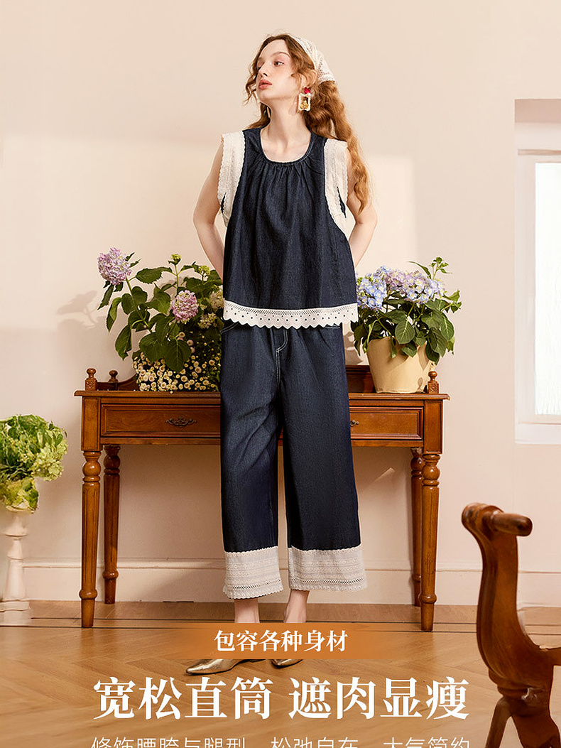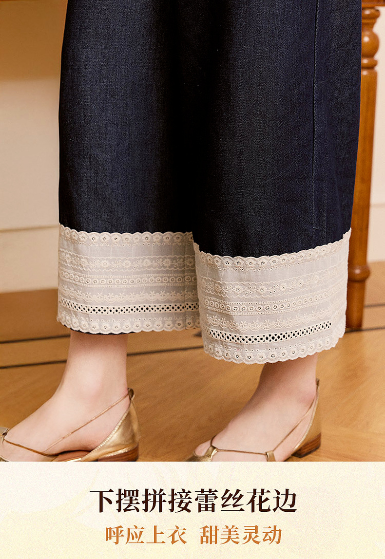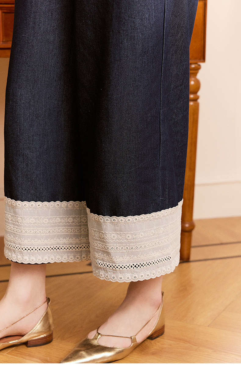两三事 山山而川 2024夏季新款复古蕾丝拼接高腰直筒休闲裤女