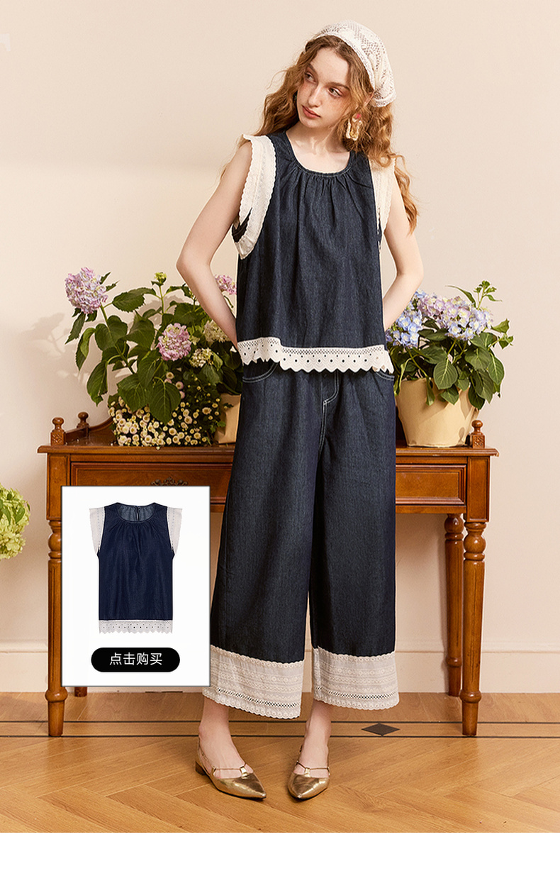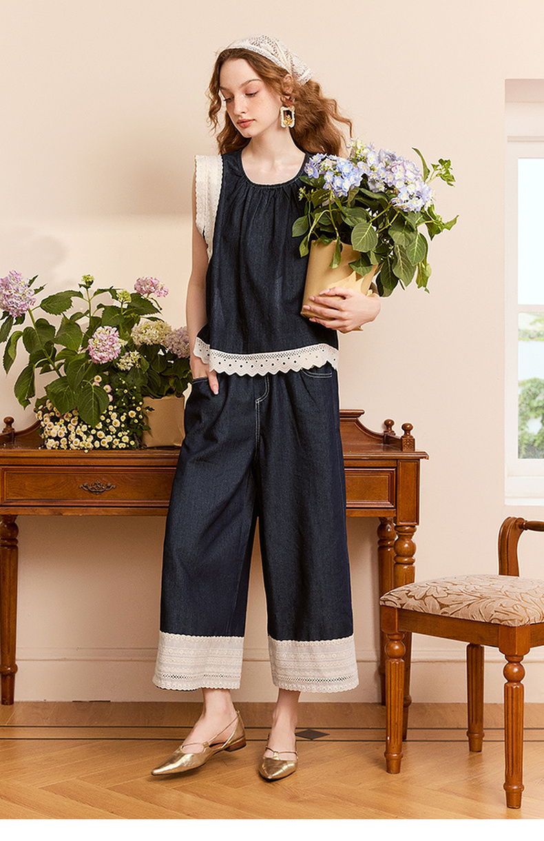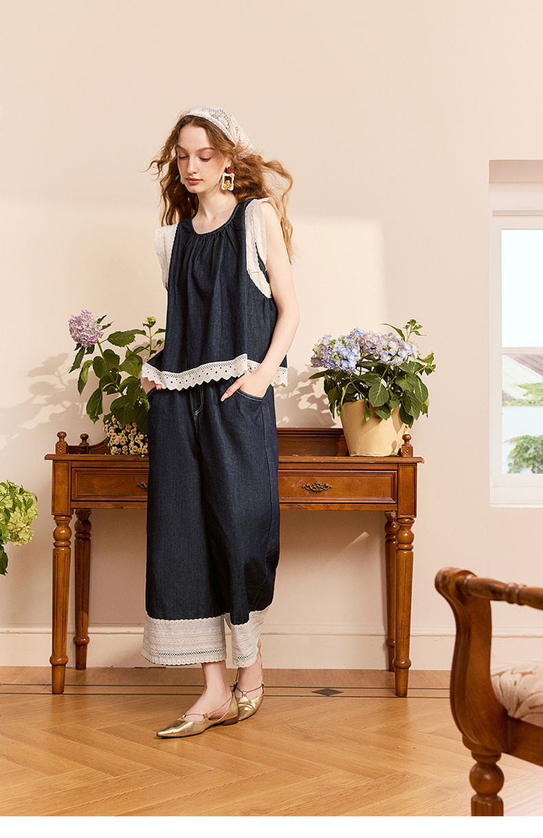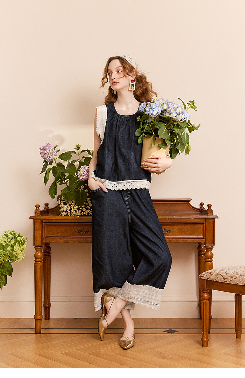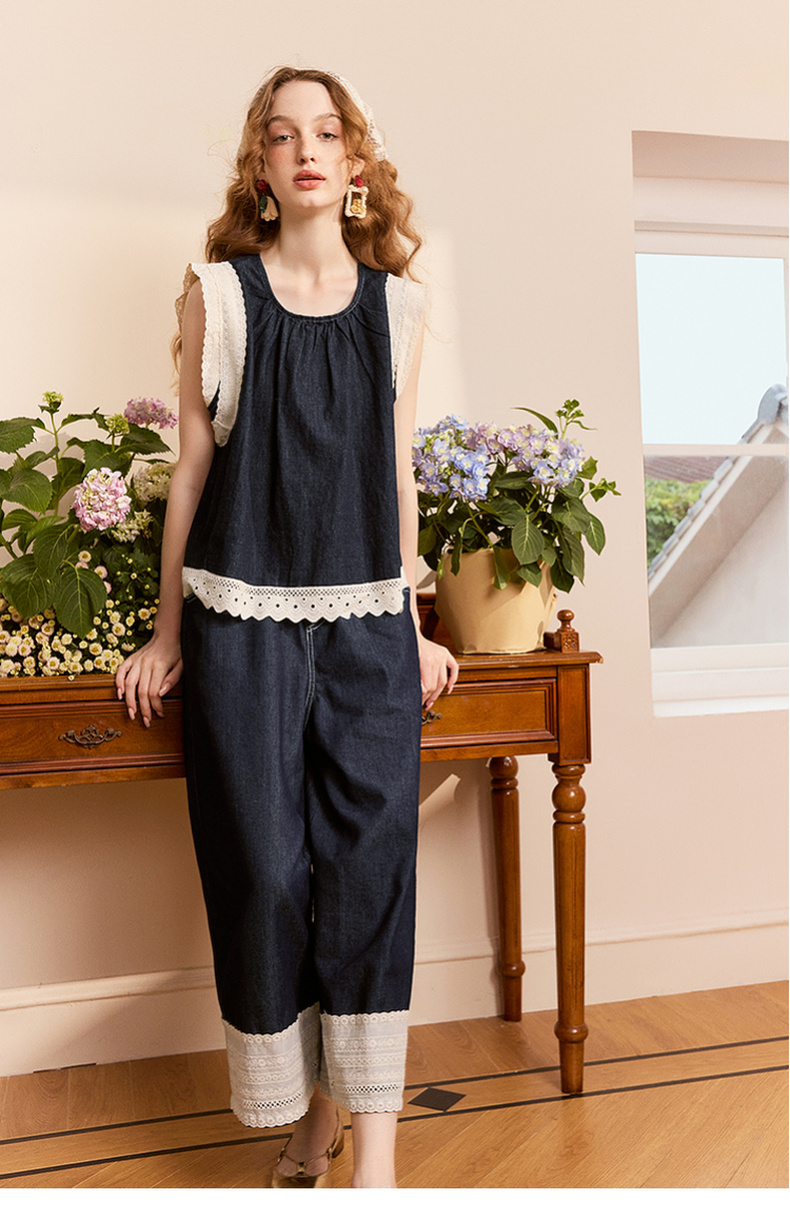 两三事 山山而川 2024夏季新款复古蕾丝拼接高腰直筒休闲裤女
