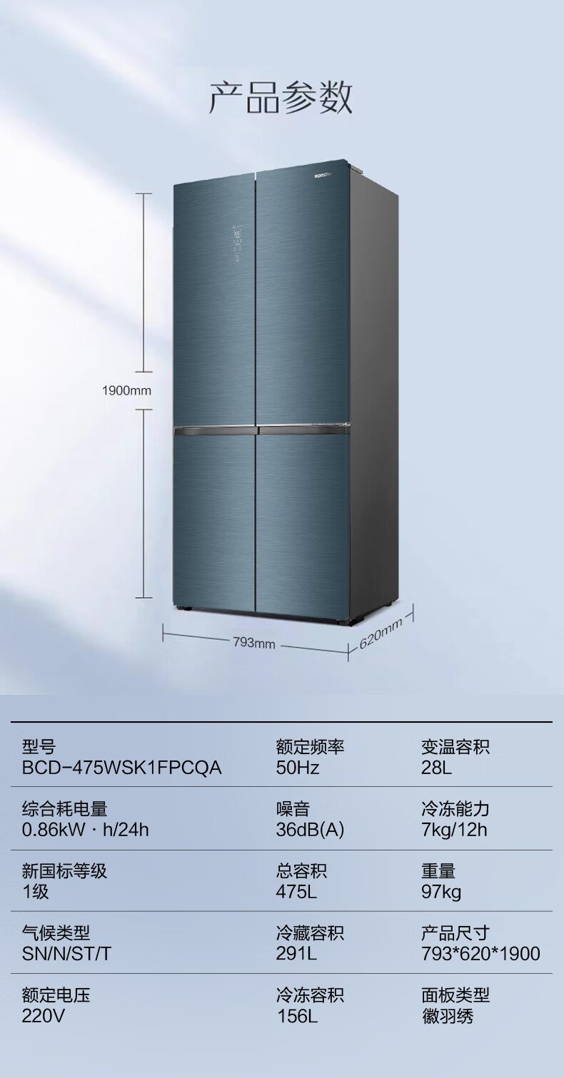 容声(Ronshen)475升十字对开四开门家用节能省电冰箱家用一级变频大容量电冰箱 BCD-475WSK1FPCQA徽羽绣