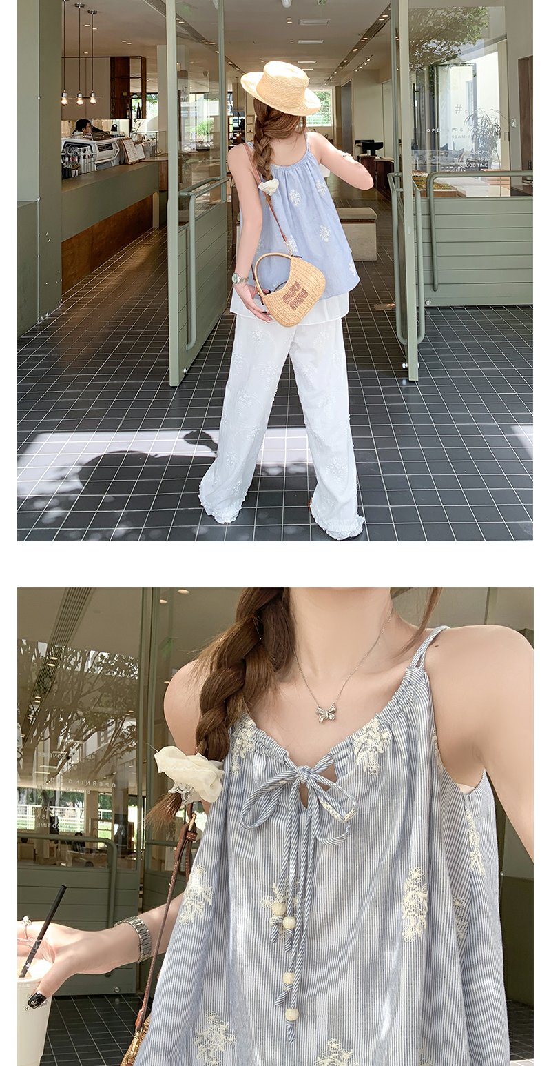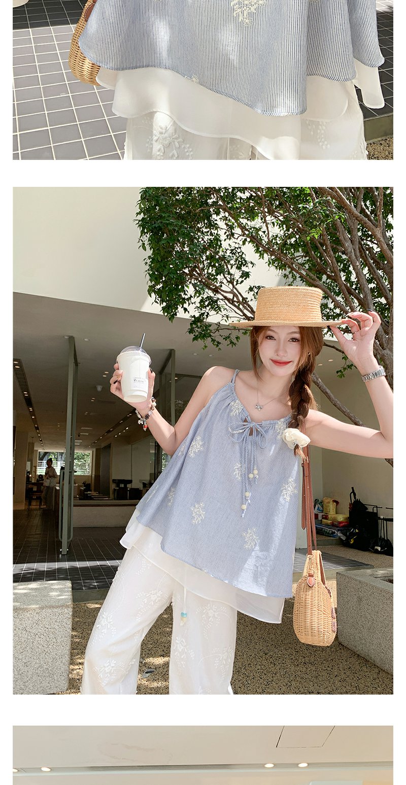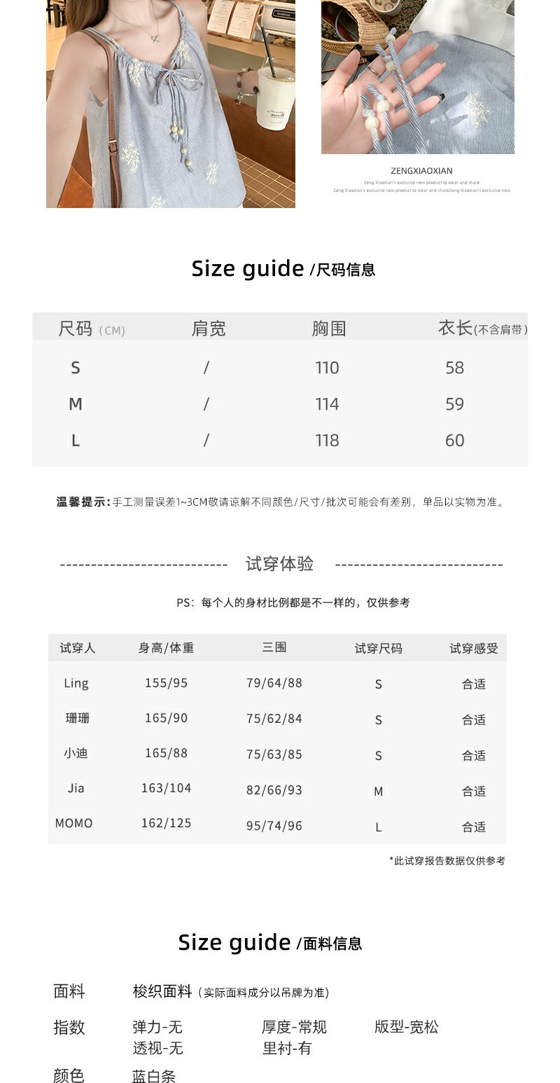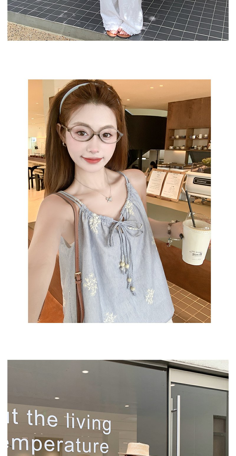 <曾小咸推荐>夏季蓝色竖条拼接蕾丝吊带背心