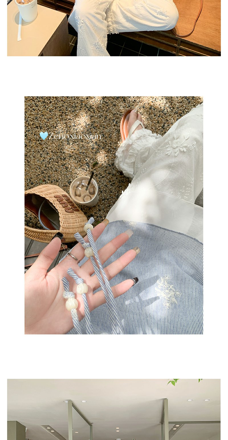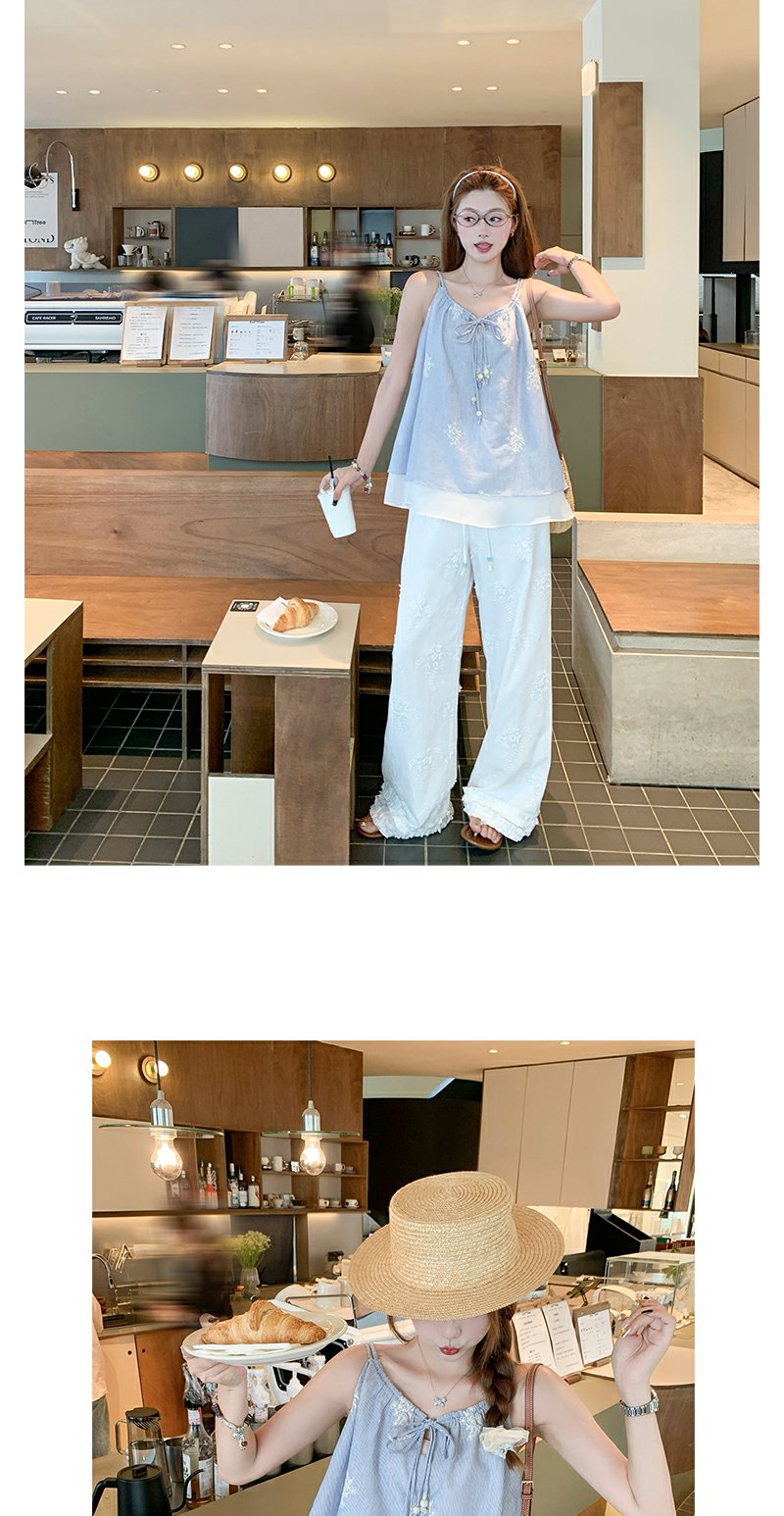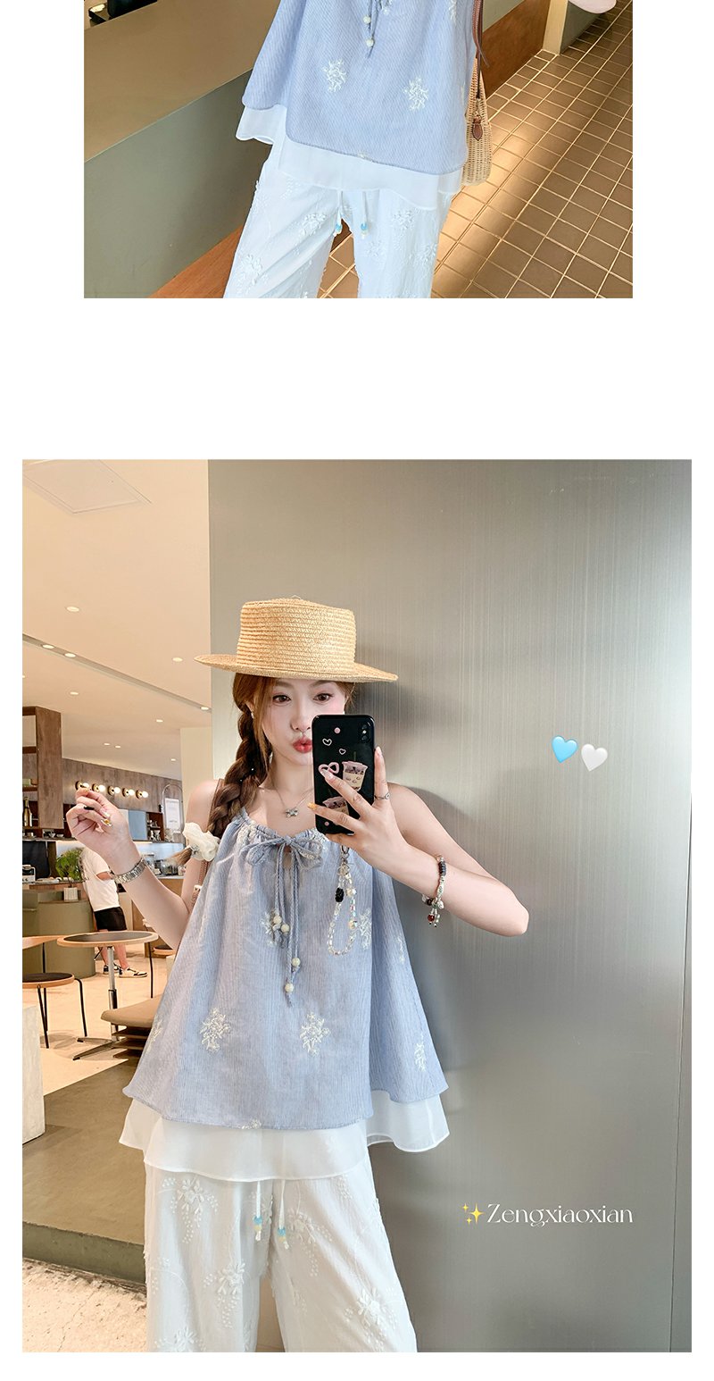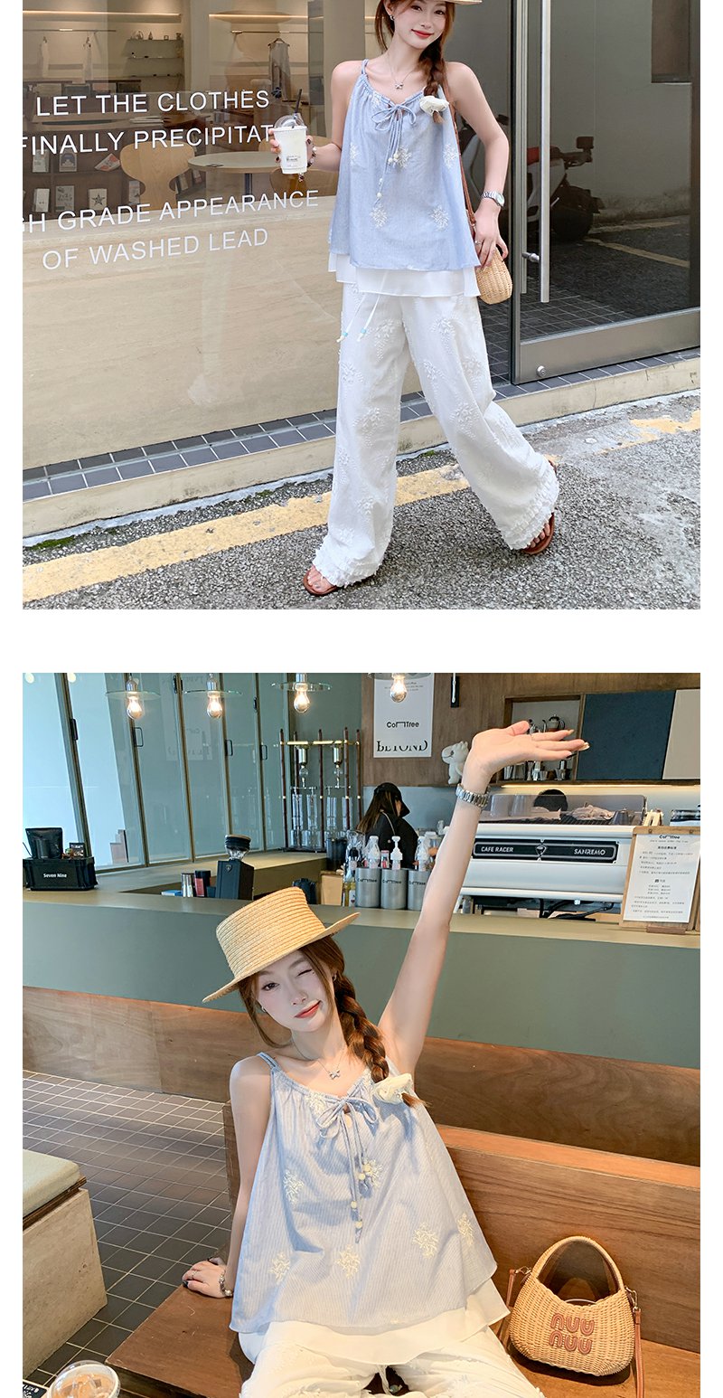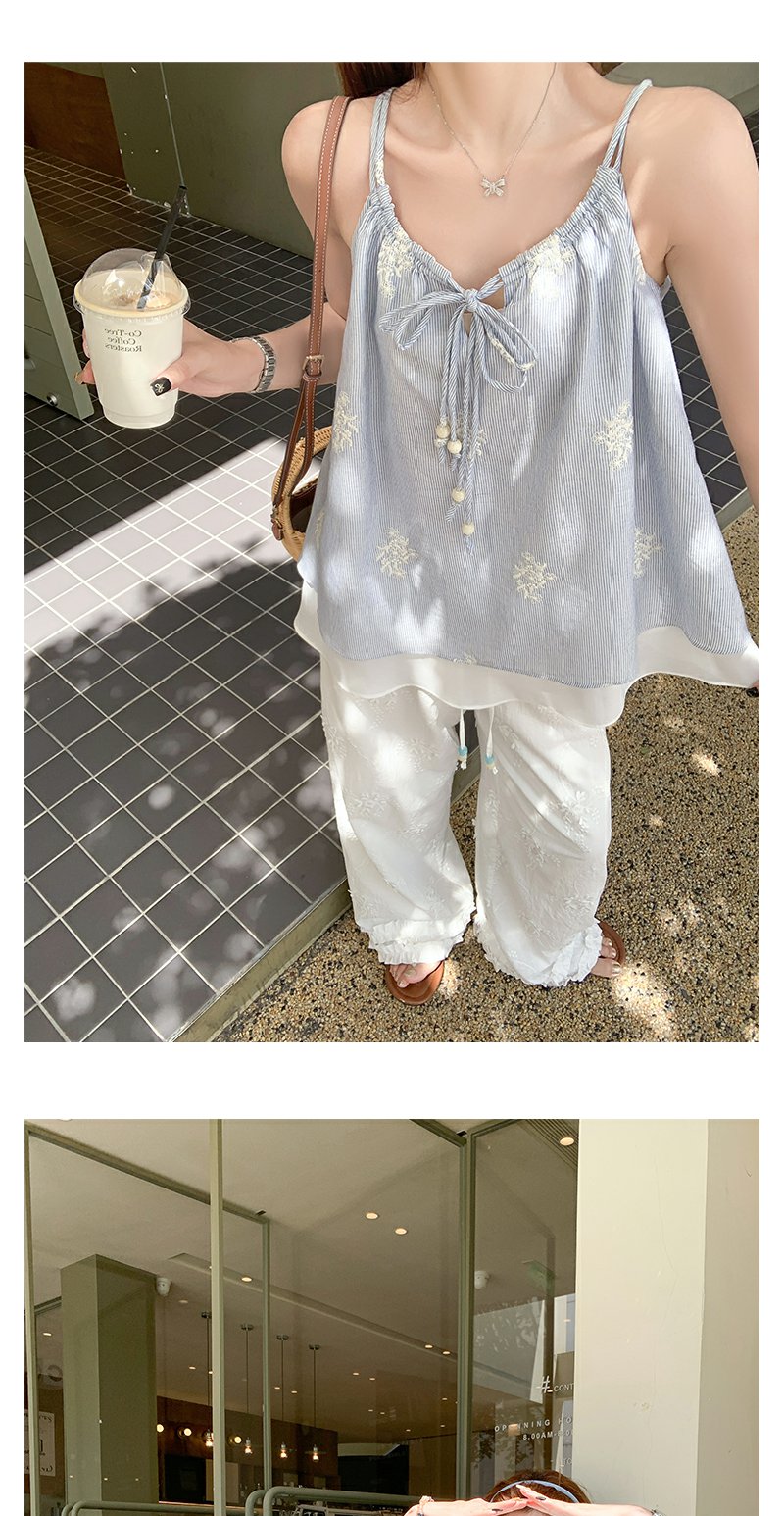 <曾小咸推荐>夏季蓝色竖条拼接蕾丝吊带背心