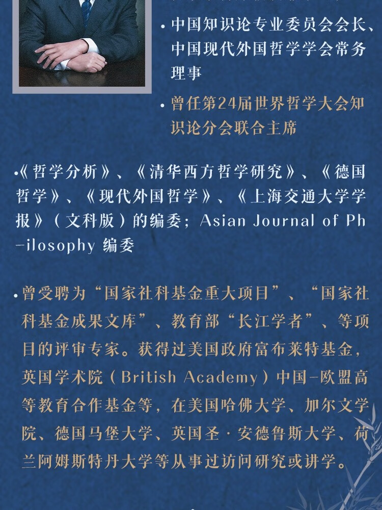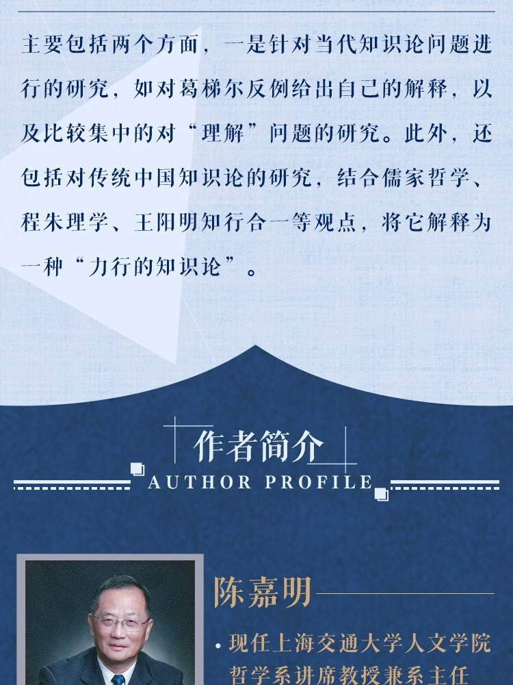 陈嘉明,现任上海交通大学人文学院哲学系讲席教授、系主任。中国知识论专业委员会会长、中国现代外国哲学学会常务理事。曾任第24届世界哲学大会知识论分会联合主席。《哲学分析》、《清华西方哲学研究》、《德国哲学》、《现代外国哲学》、《上海交通大学学报》(文科版)的编委;Asian Journal of Philosophy 编委。曾受聘为“国家社科基金重大项目”、“国家社科基金成果文库”、教育部“长江学者”、“思勉原创奖”、“全国优秀博士学位论文”、美国“富布赖特基金”等项目的评审专家。获得过美国政府富布莱特基金英国学术院(British Academy)王宽诚基金,中国—欧盟高等教育合作基金等,在美国哈佛大学、加尔文学院,德国马堡大学,英国圣•安德鲁斯大学,荷兰阿姆斯特丹大学等从事过访问研究或讲学。先后在《中国社会科学》、《哲学研究》、Philosophical Forum、China Perspectives等刊物发表过120多篇学术论文。论文在《新华文摘》等有较高的转载率以及被引用率,数次名列国内哲学学科“高被引作者榜”。获得过三次教育部优秀科研成果奖,四次省部级(上海市等)哲学社会科学优秀成果一等奖等,多次二等奖。是享受国务院颁发的政府特殊津贴专家、国家社科基金重大项目“当代知识论的系列研究”的首席专家等。