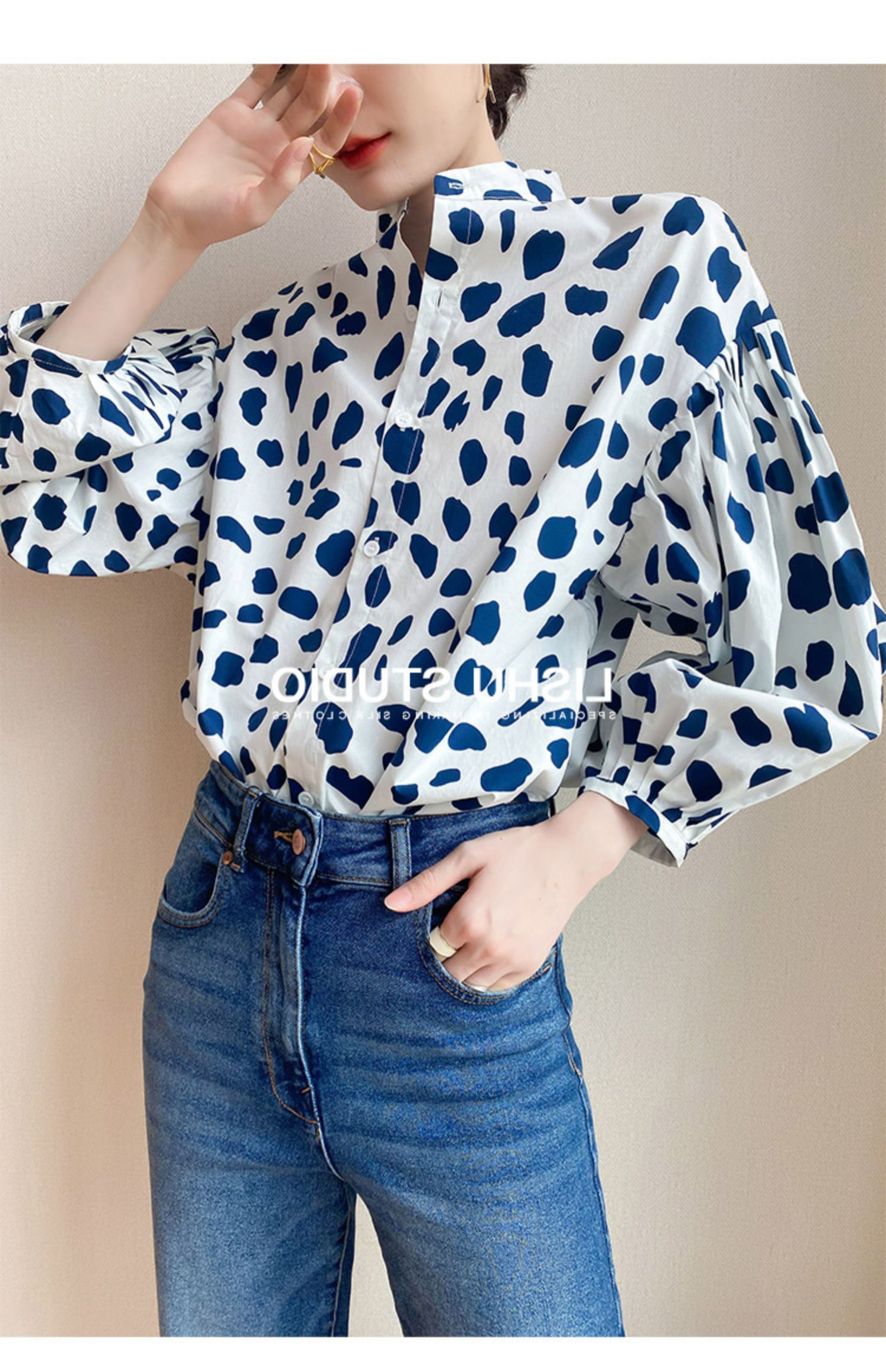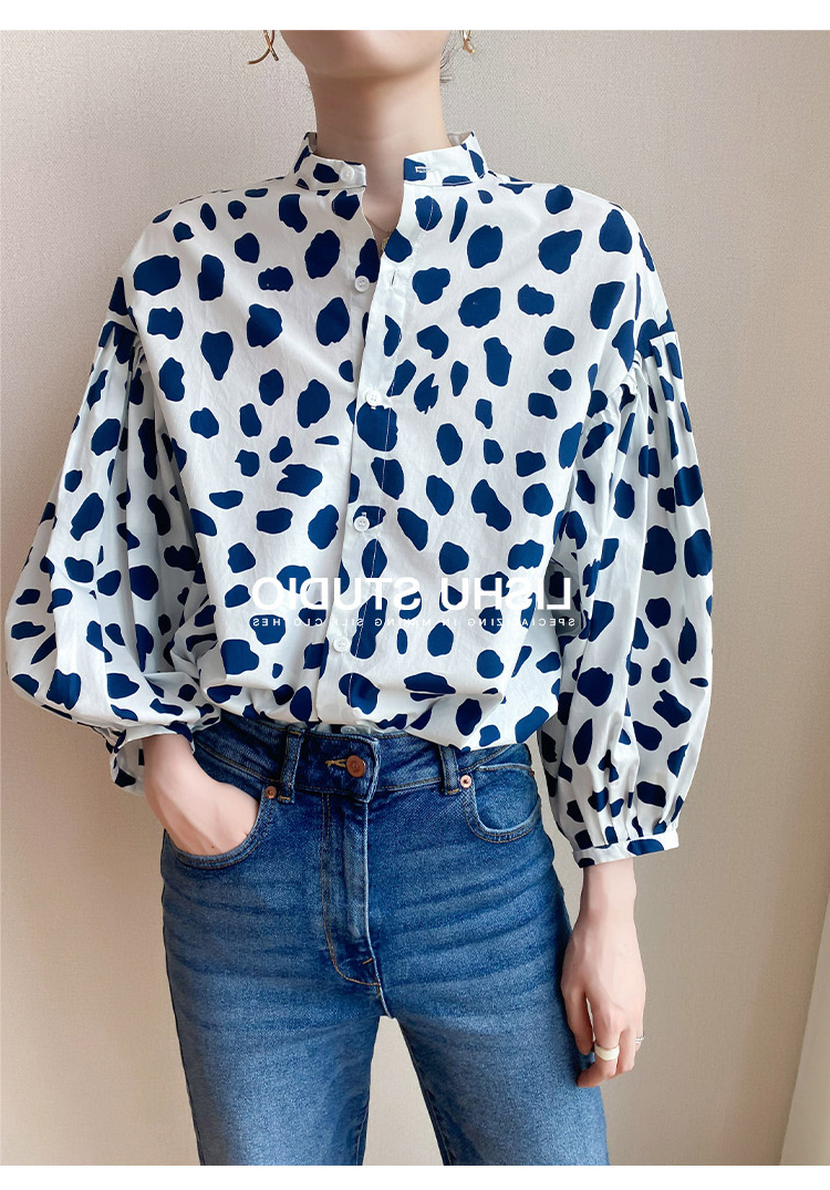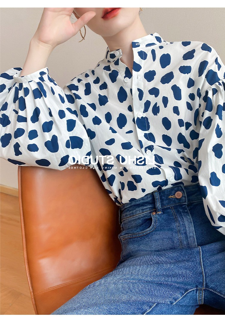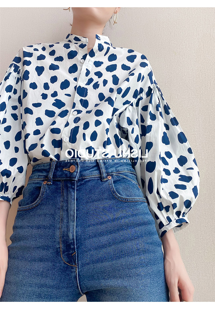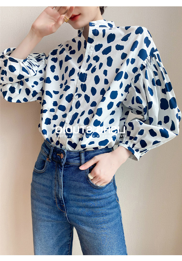 2023年早春复古不规则印花立领衬衫 女设计感灯笼袖时尚百搭上衣薄