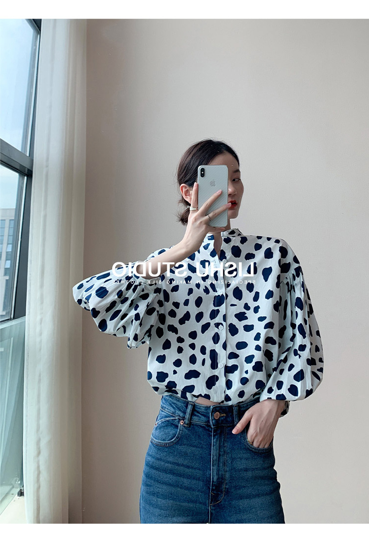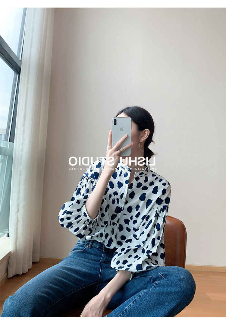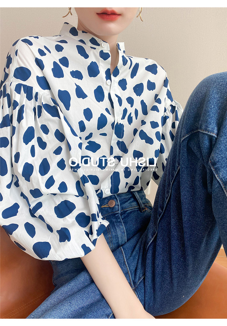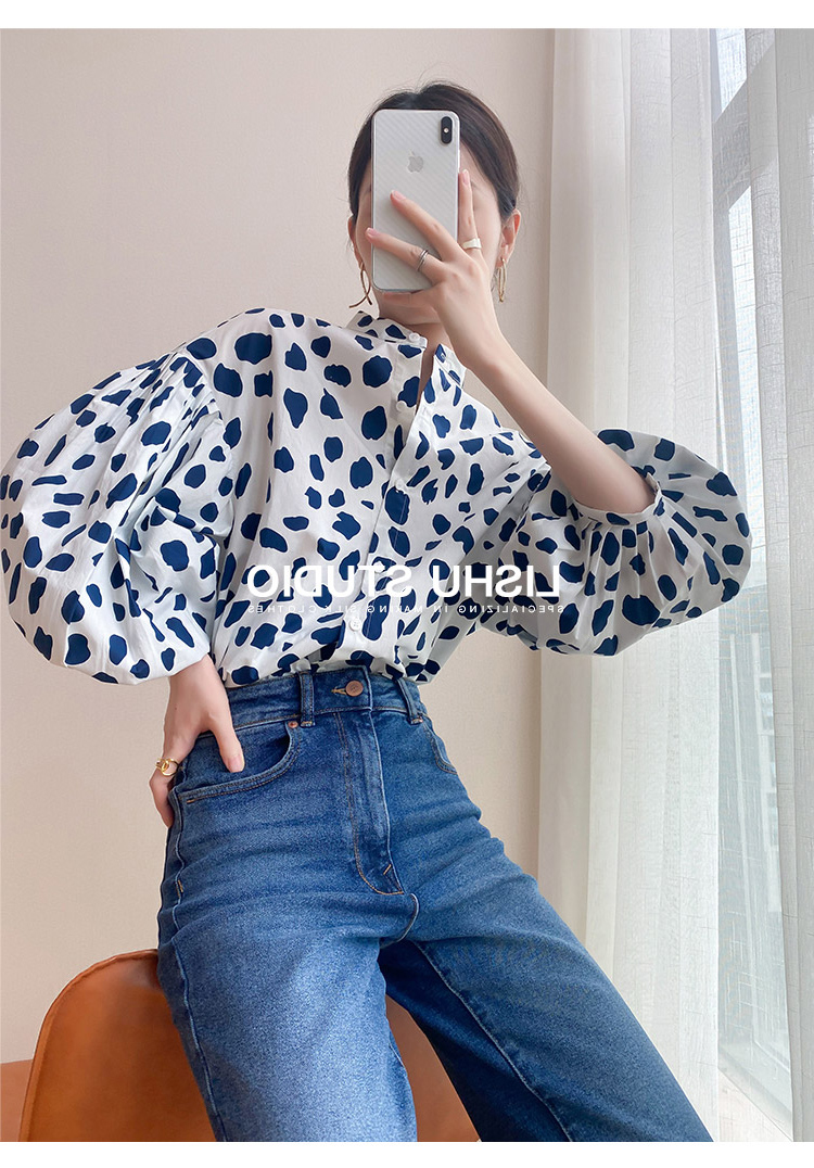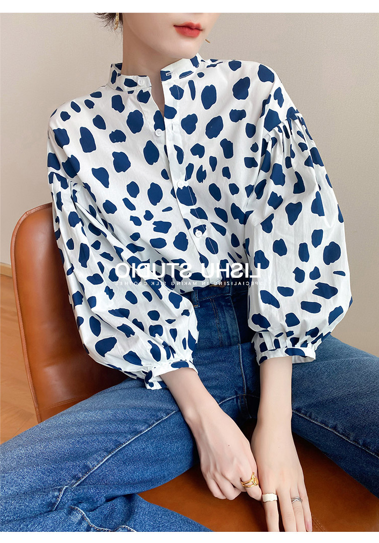 2023年早春复古不规则印花立领衬衫 女设计感灯笼袖时尚百搭上衣薄