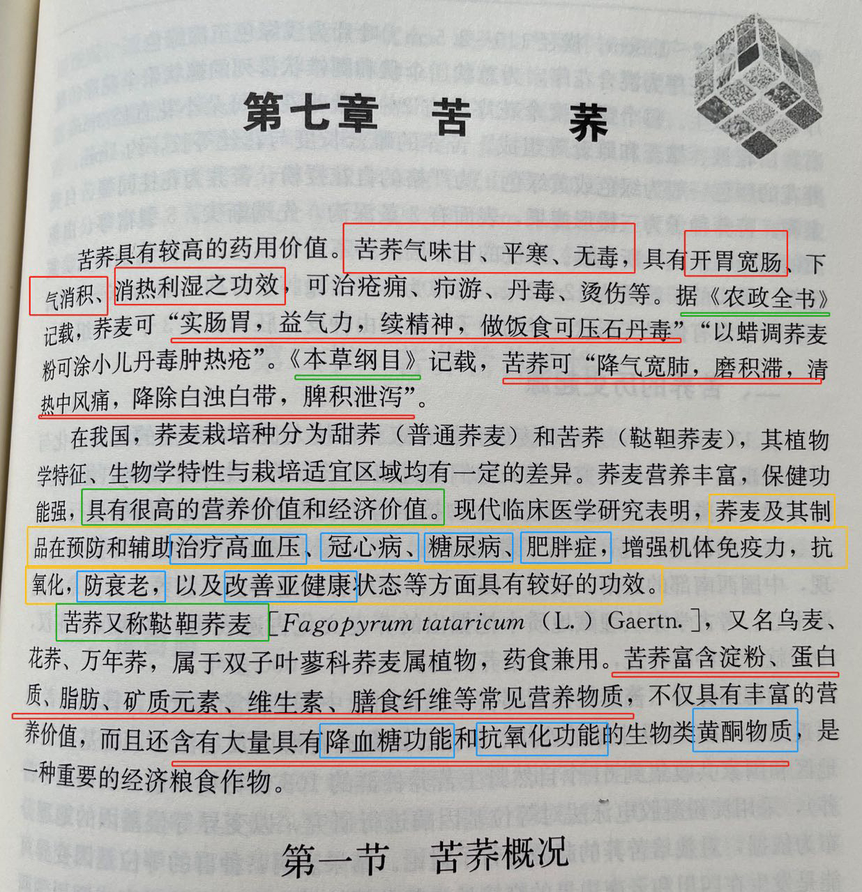 在《小杂粮营养价值》一书中,作者马挺军是国内权威农业营养专家,他在书中详细分析了苦荞药用价值,从几千年前,老祖宗就懂得用苦荞治疗疾病,并记载流传至今。其食用价值高,重点是苦荞本身含可改善现代人身体亚健康及逐年增多人群,高血压、冠心病、糖尿病、肥胖症等等功效。