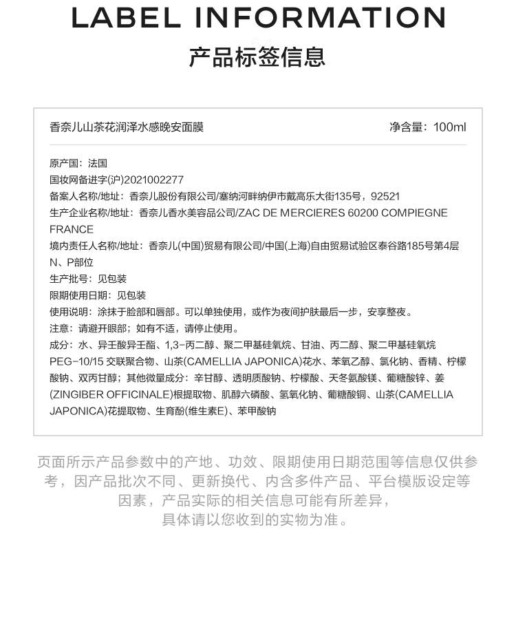 香奈儿 山茶花润泽水感晚安面膜 保湿抗皱