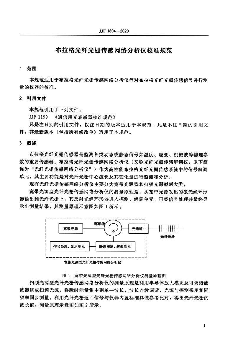 书名:JJF 1804-2020 布拉格光纤光栅传感网络分析仪校准规范
