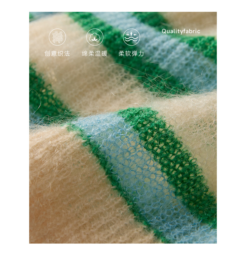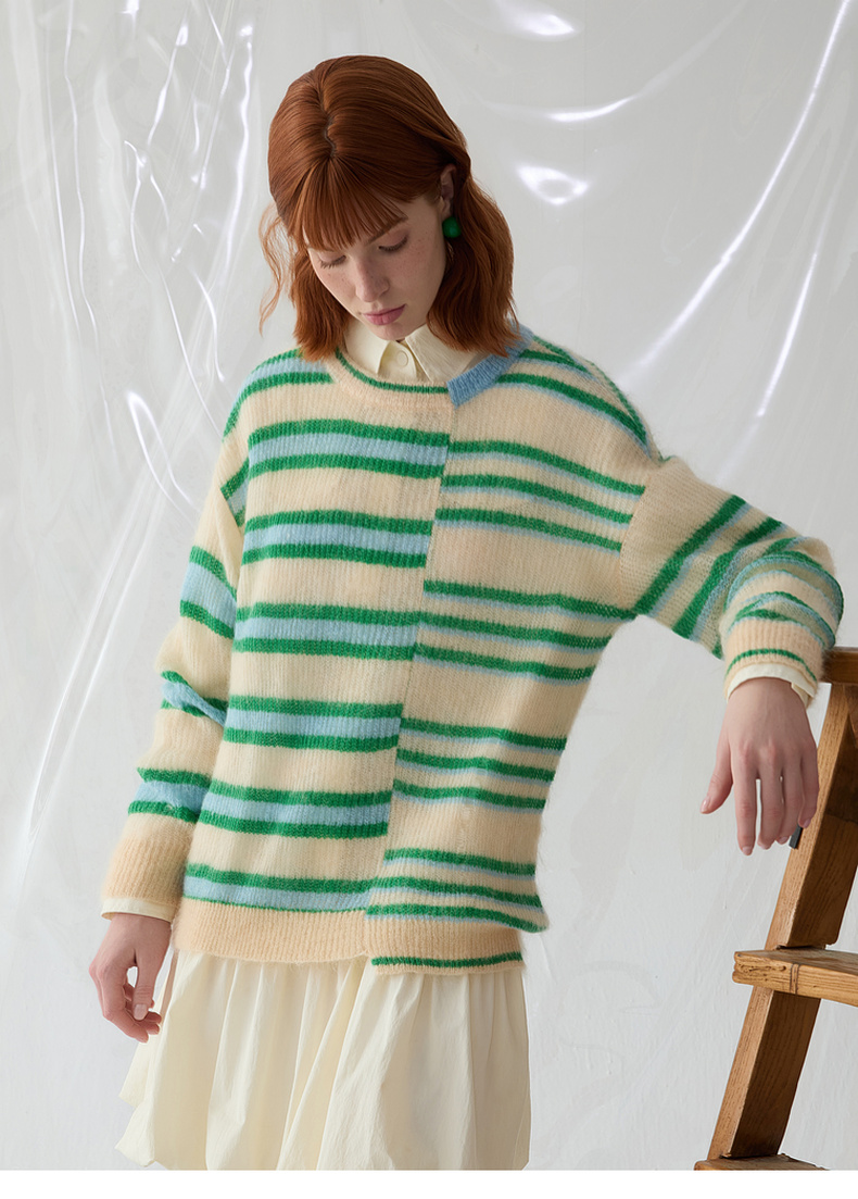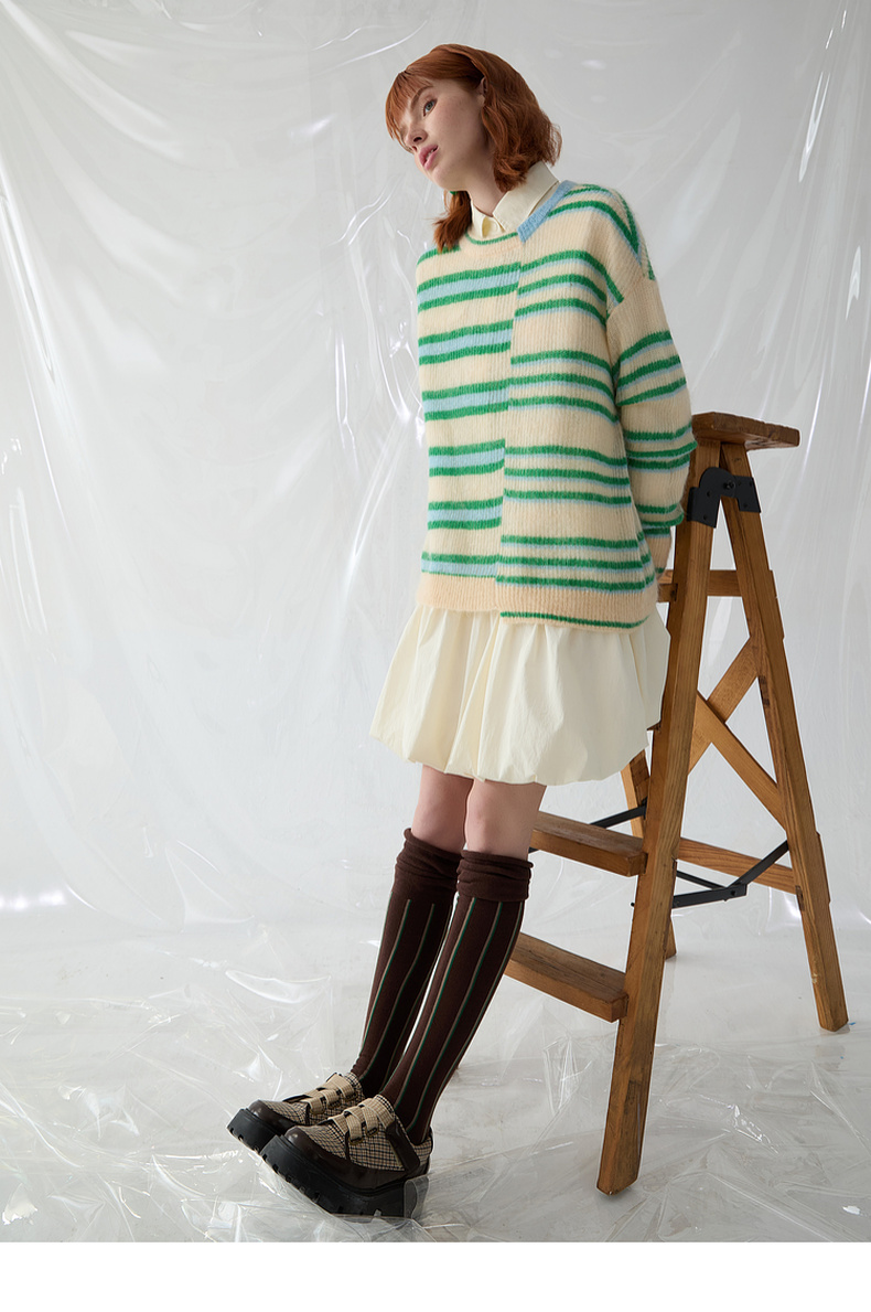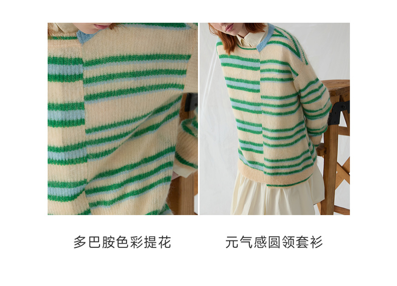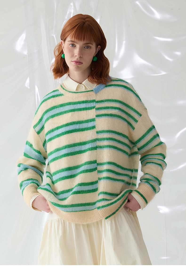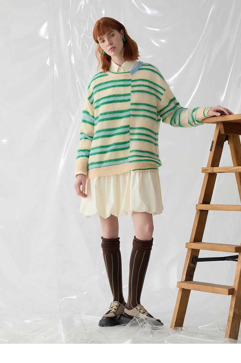 谜底圆领套头针织衫长袖2025春新品蓬松条纹宽松毛衫女251MZ0392
