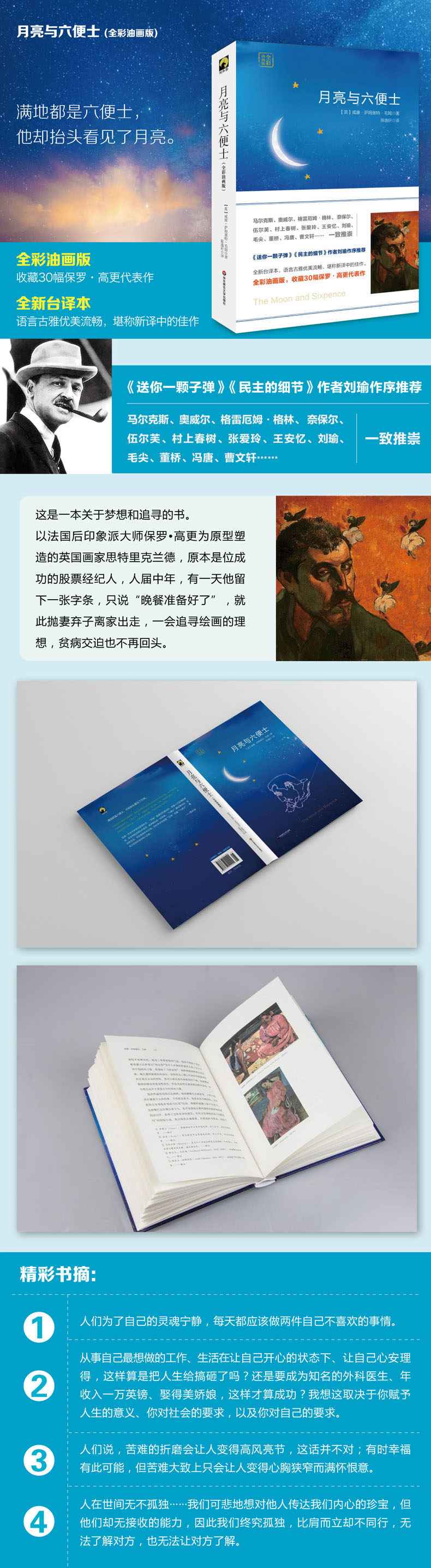 这是一本关于梦想与追寻的书,“月亮”是美好而遥远的,就像人们追寻的梦想,但追寻的过程也许孤苦,甚至最后会一无所得;“六便士”象征着世俗、琐碎的生活,但也有其存在价值。你的手中究竟是“月亮”还是“六便士”,看完之后也许你会陷入沉思。