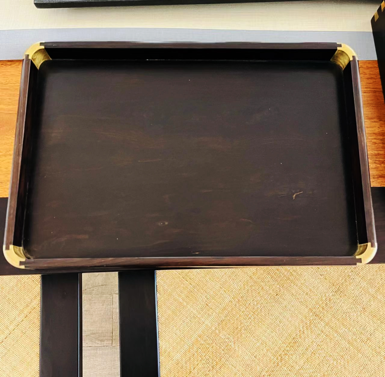 长方形紫光檀茶盘四周镶铜