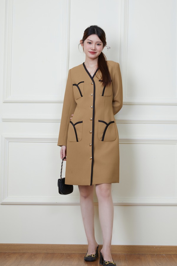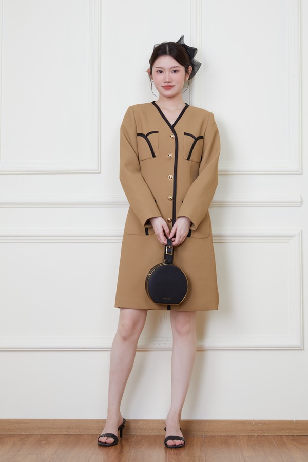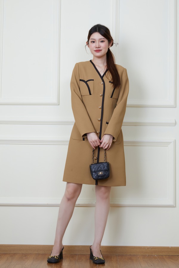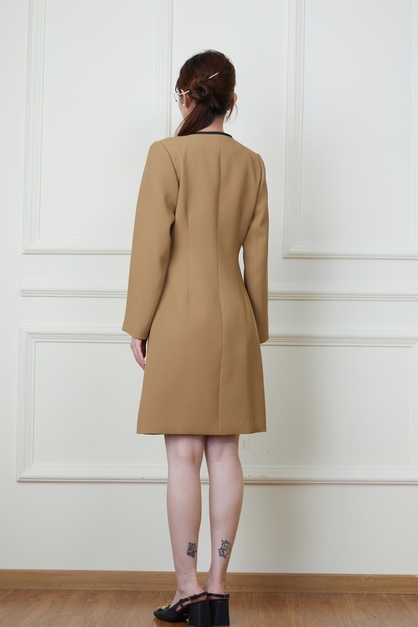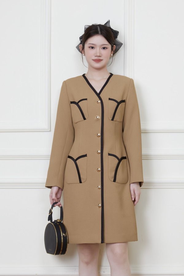 Le Malene 卡其色小香风明线收腰连衣裙 19878