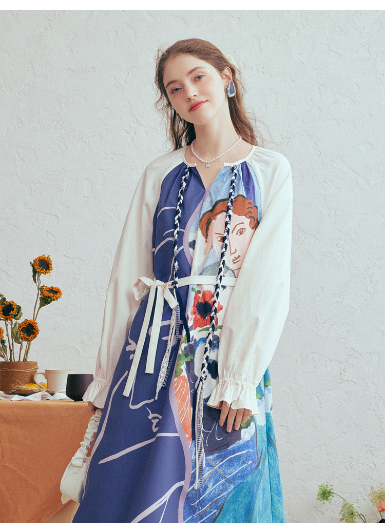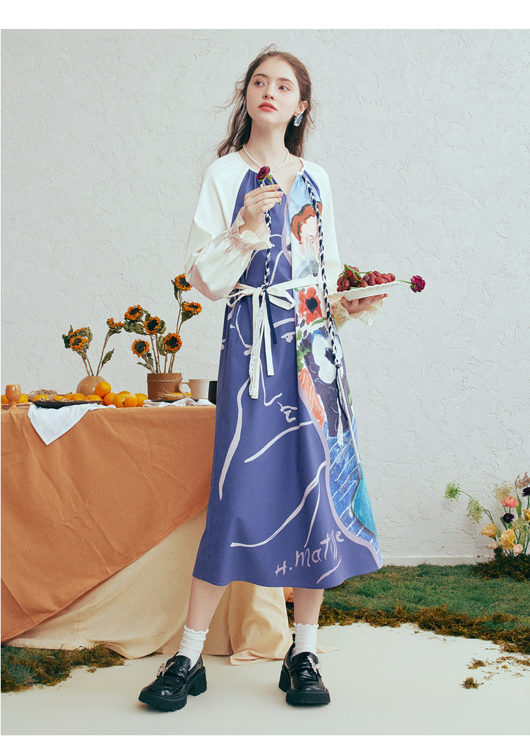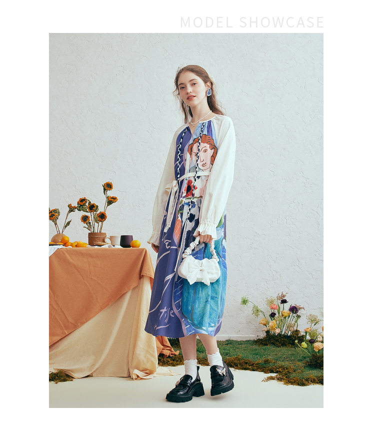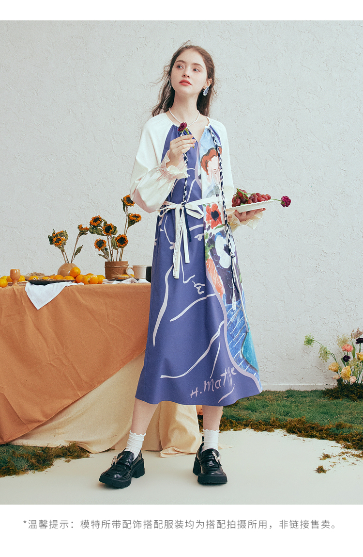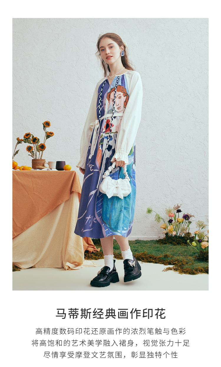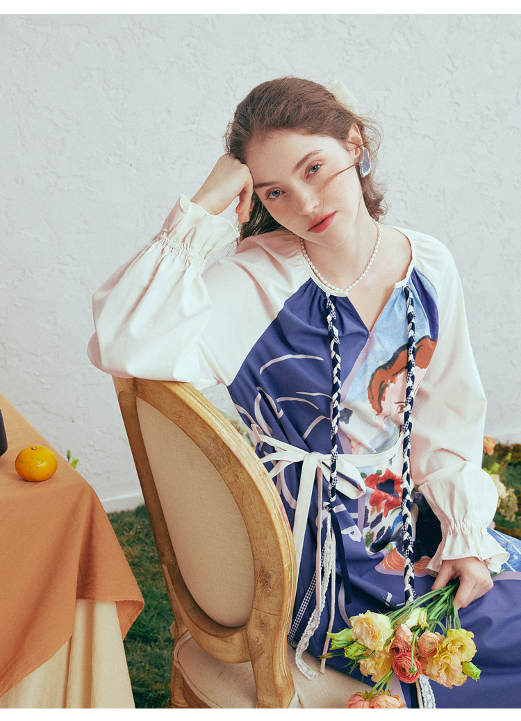 两三事 微光记忆 2026春季新款复古印花拼接绑带连衣裙气质长裙