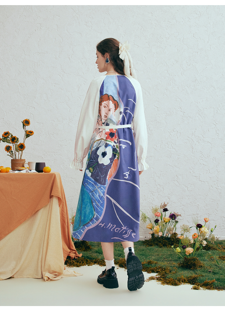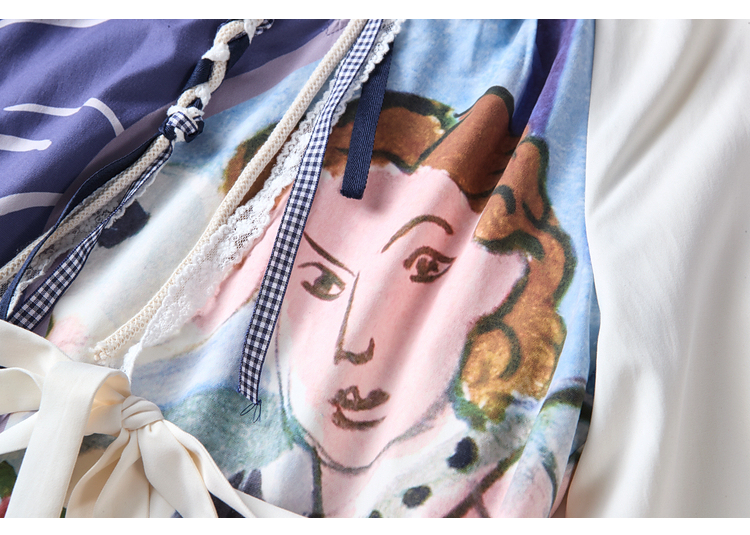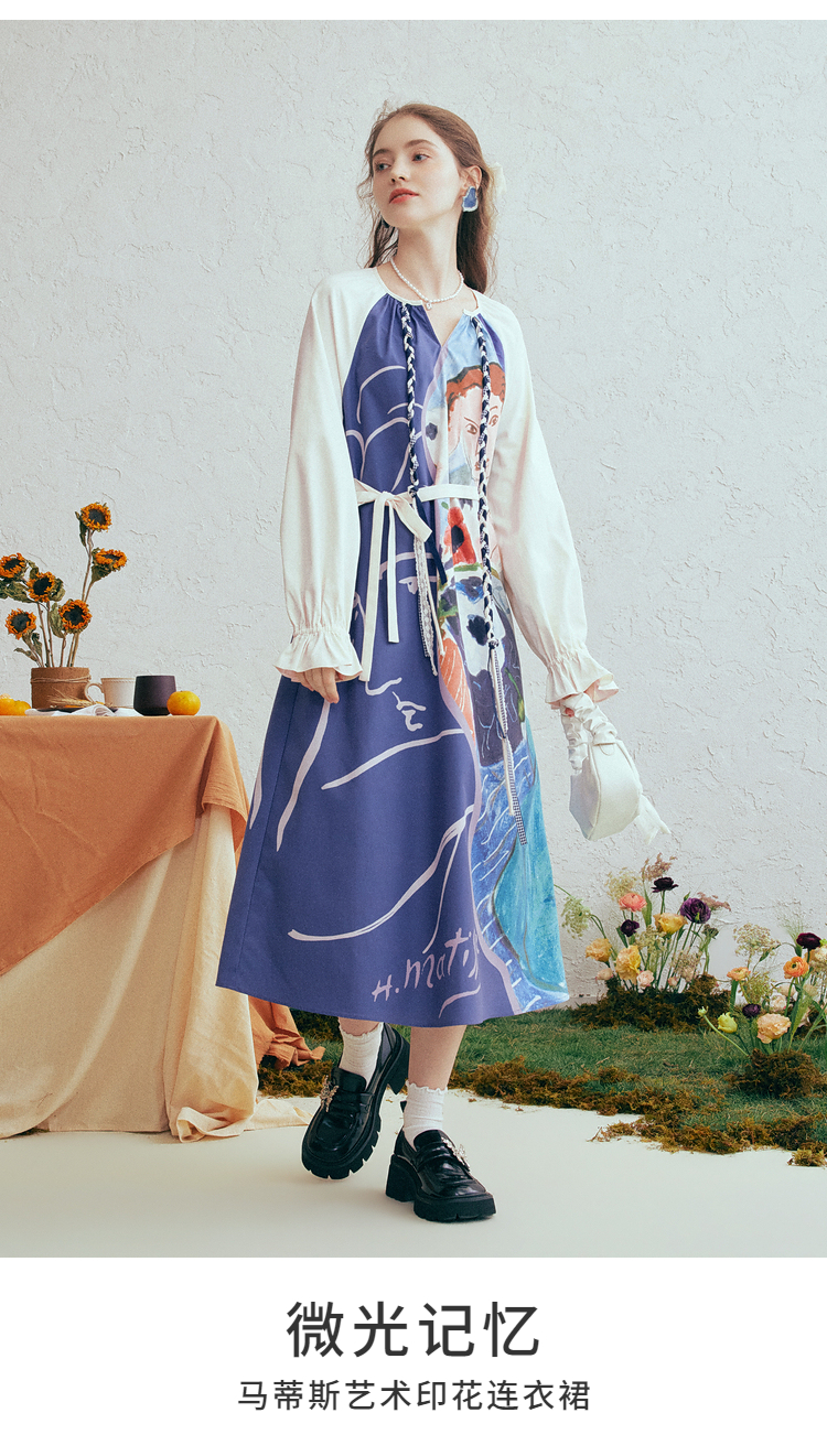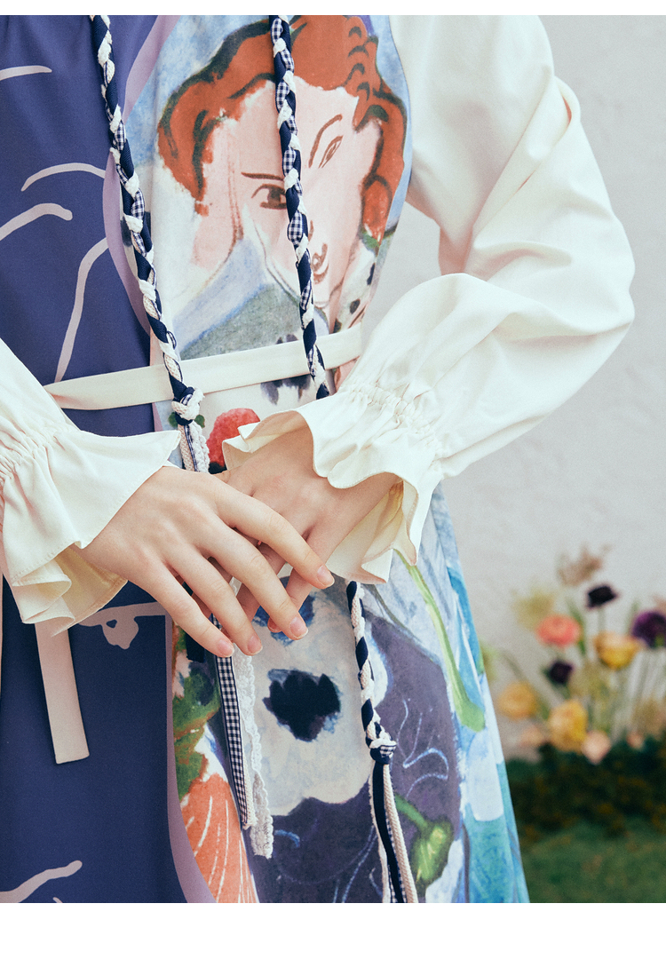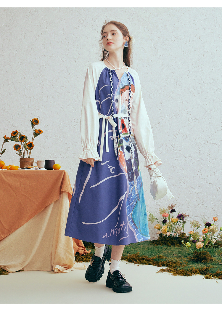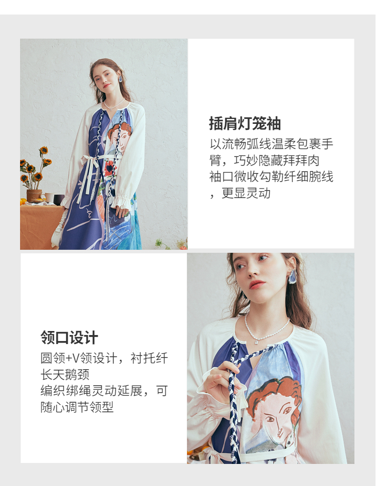 两三事 微光记忆 2026春季新款复古印花拼接绑带连衣裙气质长裙