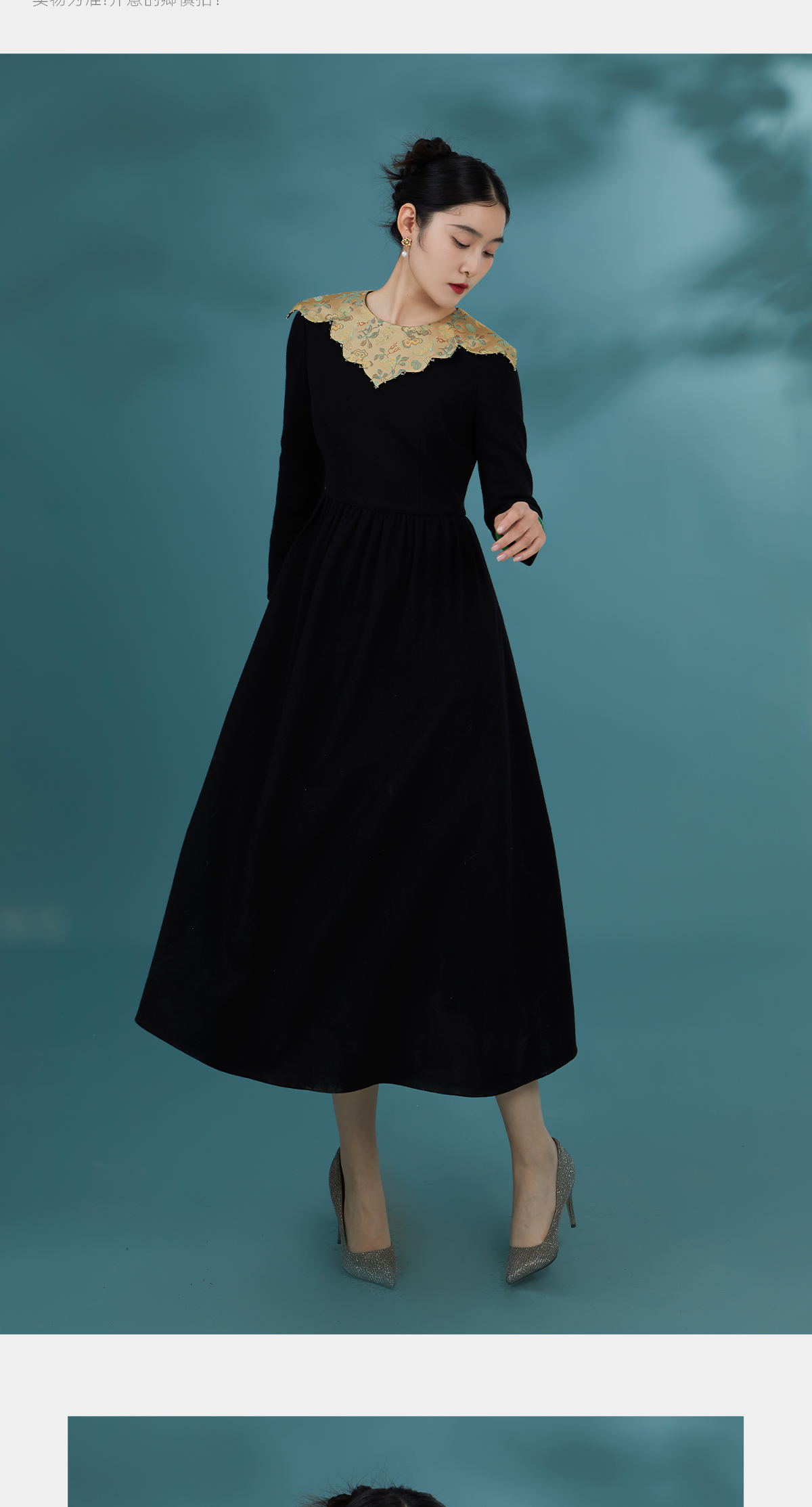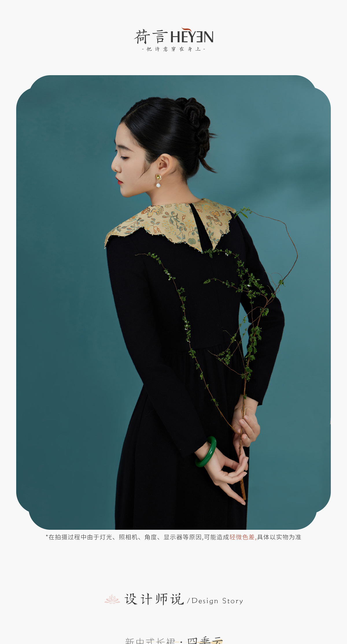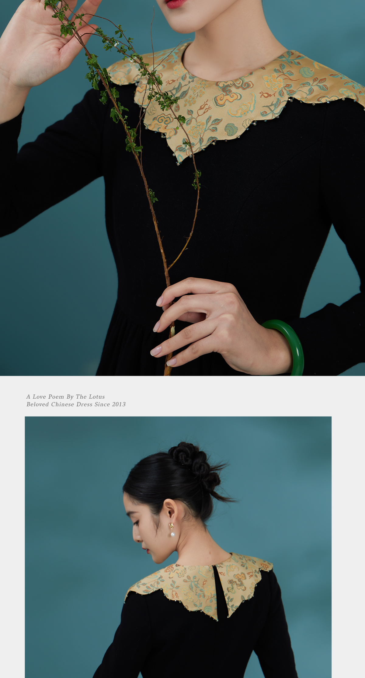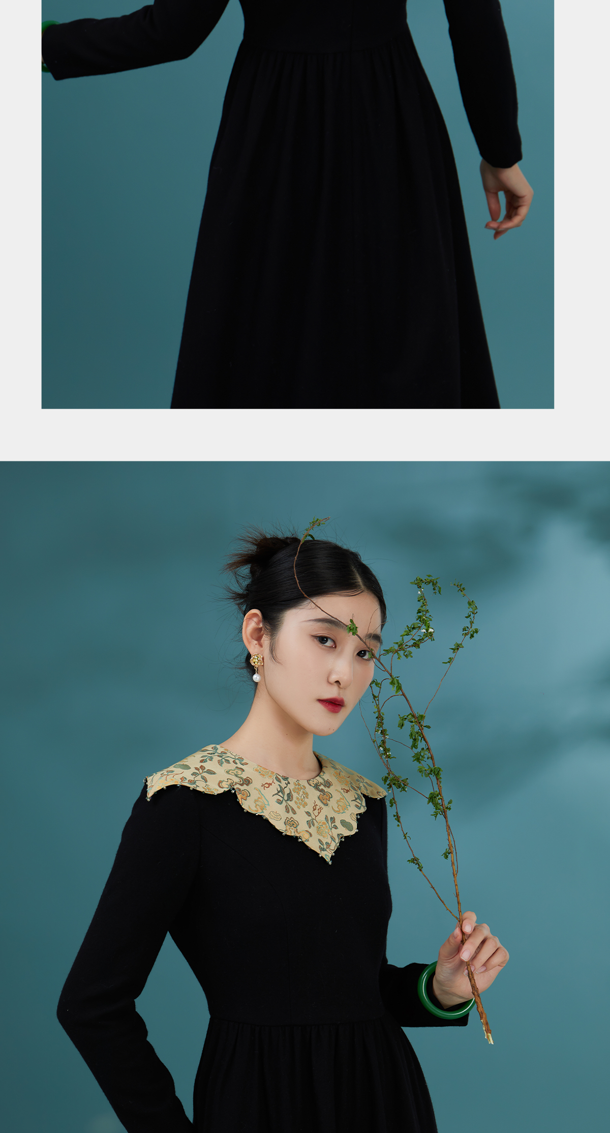 荷言GL 四垂云 非遗宋锦云肩假两件黑色羊毛连衣裙秋冬保暖