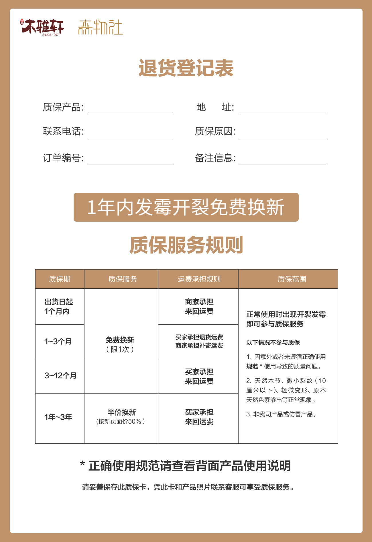 质保期:1年内发霉开裂免费换新出货日起1个月内:免费换新(限一次),商家承担来回运费1~3个月:免费换新(限一次),买家承担退货运费,商家承担补寄运费3~12个月:免费换新(限一次),买家承担来回运费1年~3年:半价换新(按新页面价50%)买家承担来回运费质保范围:正常使用时出现开裂发霉,即可参与质保服务以下情况不参与质保:1.因意外或者未遵循正确使用,规范*使用导致的质量问题。2.天然木节、微小裂纹(10厘米以下)、轻微变形、原木天然色素渗出等正常现象。3.非我司产品或仿冒产品!