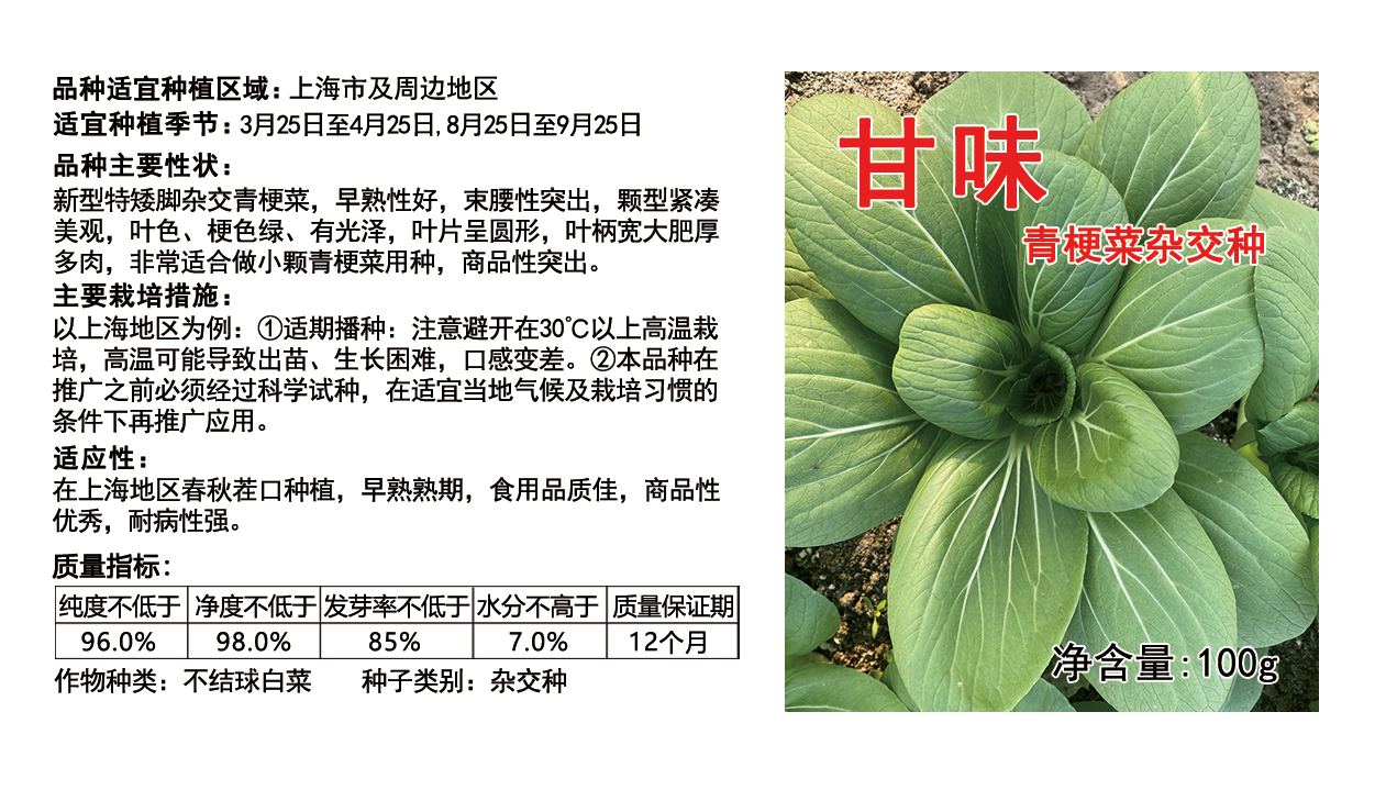 以上海地区为例:①适期播种:注意避开在30°C以上高温下栽培,高温可能导致出苗、生长困难,口感变差。②本品种在推广之前必须经过科学试种,在适宜当地气候及栽培习惯的条件下再推广应用。