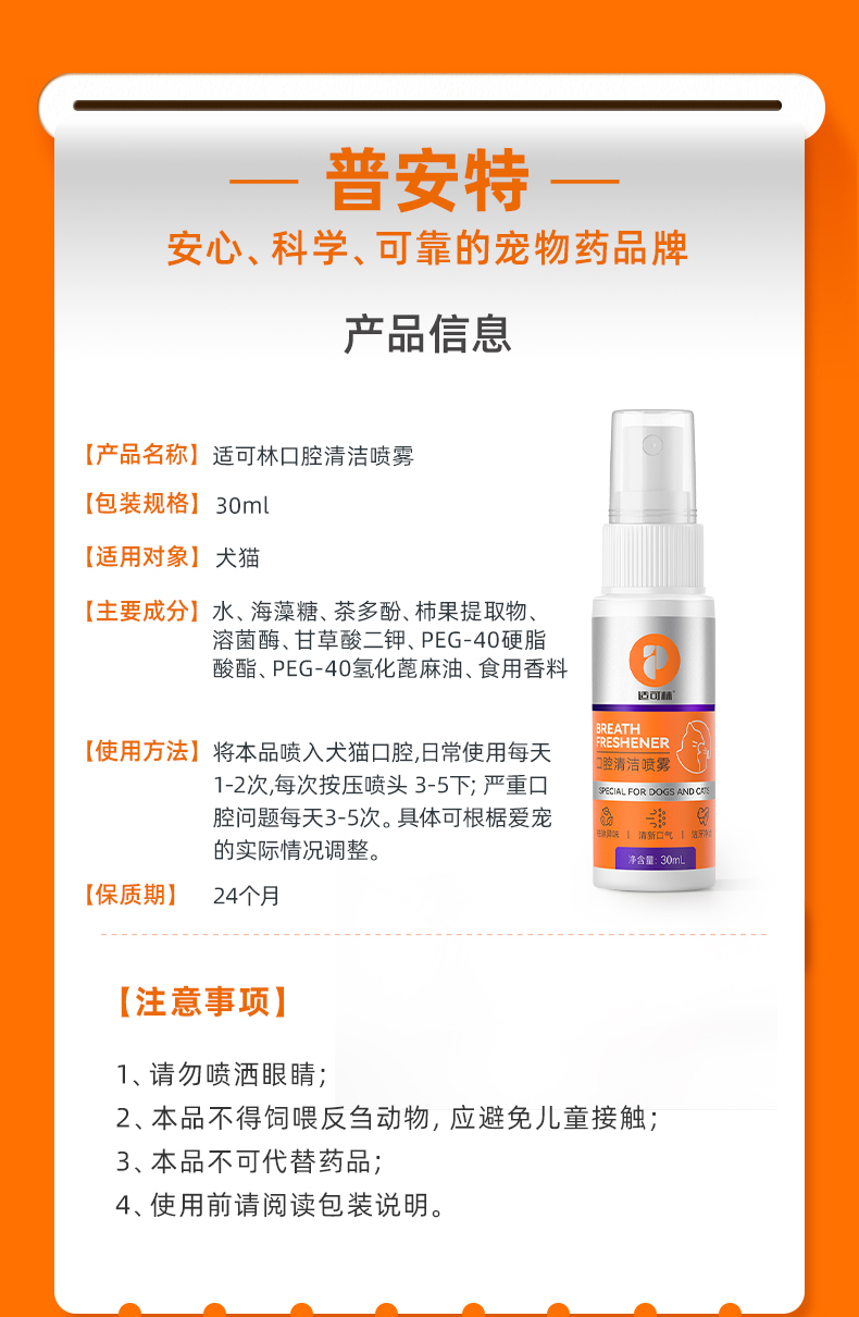 【26元任选2件】普安特猫咪口腔清洁口臭狗狗口水口气口腔清洁喷雾牙齿清洁喷剂适可林 1瓶