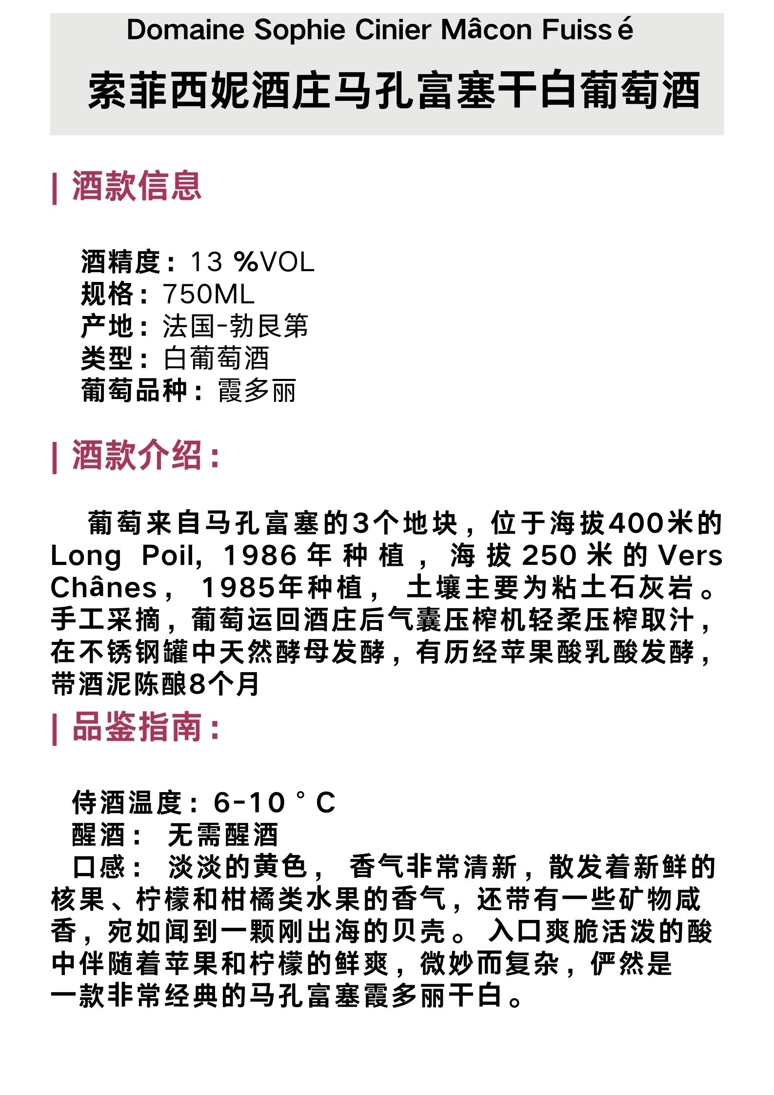 索菲西妮酒庄马孔富塞干白葡萄酒 Domaine Sophie Cinier MACON FUISSE