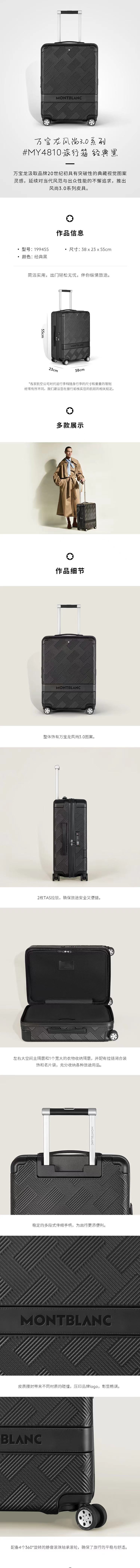 这款黑色旅行箱采用聚碳酸酯材料,印有经典的万宝龙风尚3.0图案,配有顺滑滚轮。内部包括两侧的拉链隔层和两个旅行收纳袋,方便整洁有序地收纳行李。尺寸与顶部行李架兼容(38x55x23厘米)。