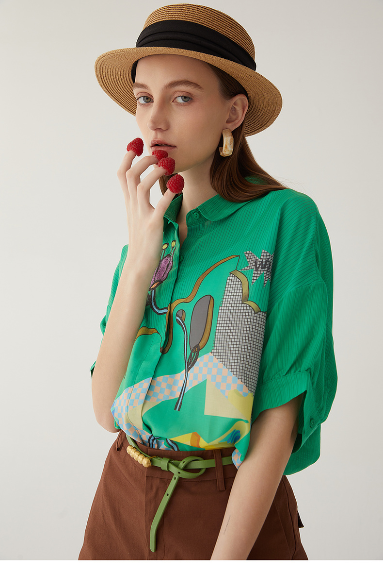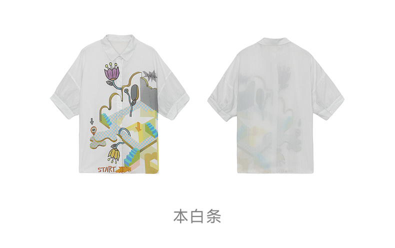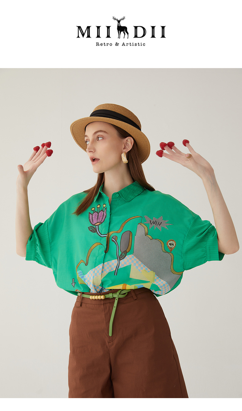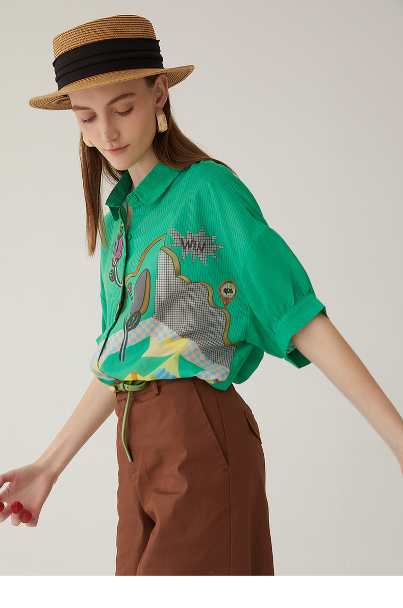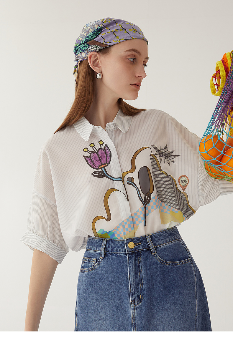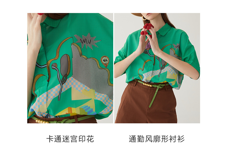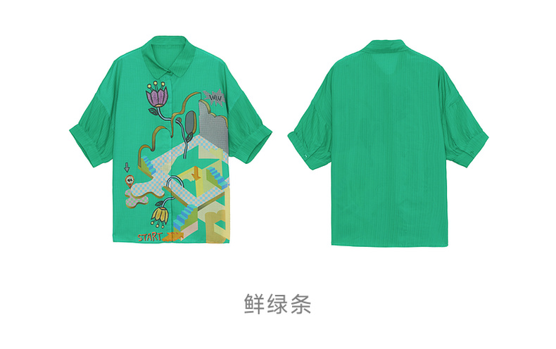 谜底大廓形印花衬衫五分袖女2024夏款oversize落肩衬衣246MC7008