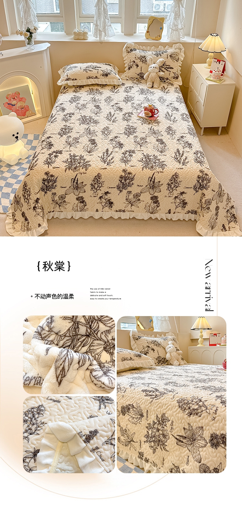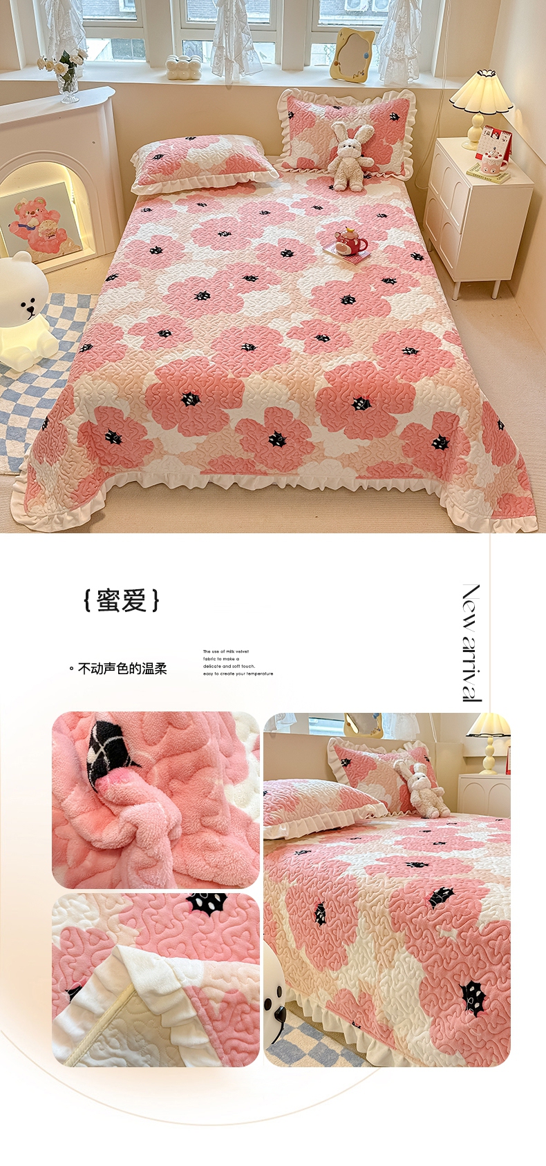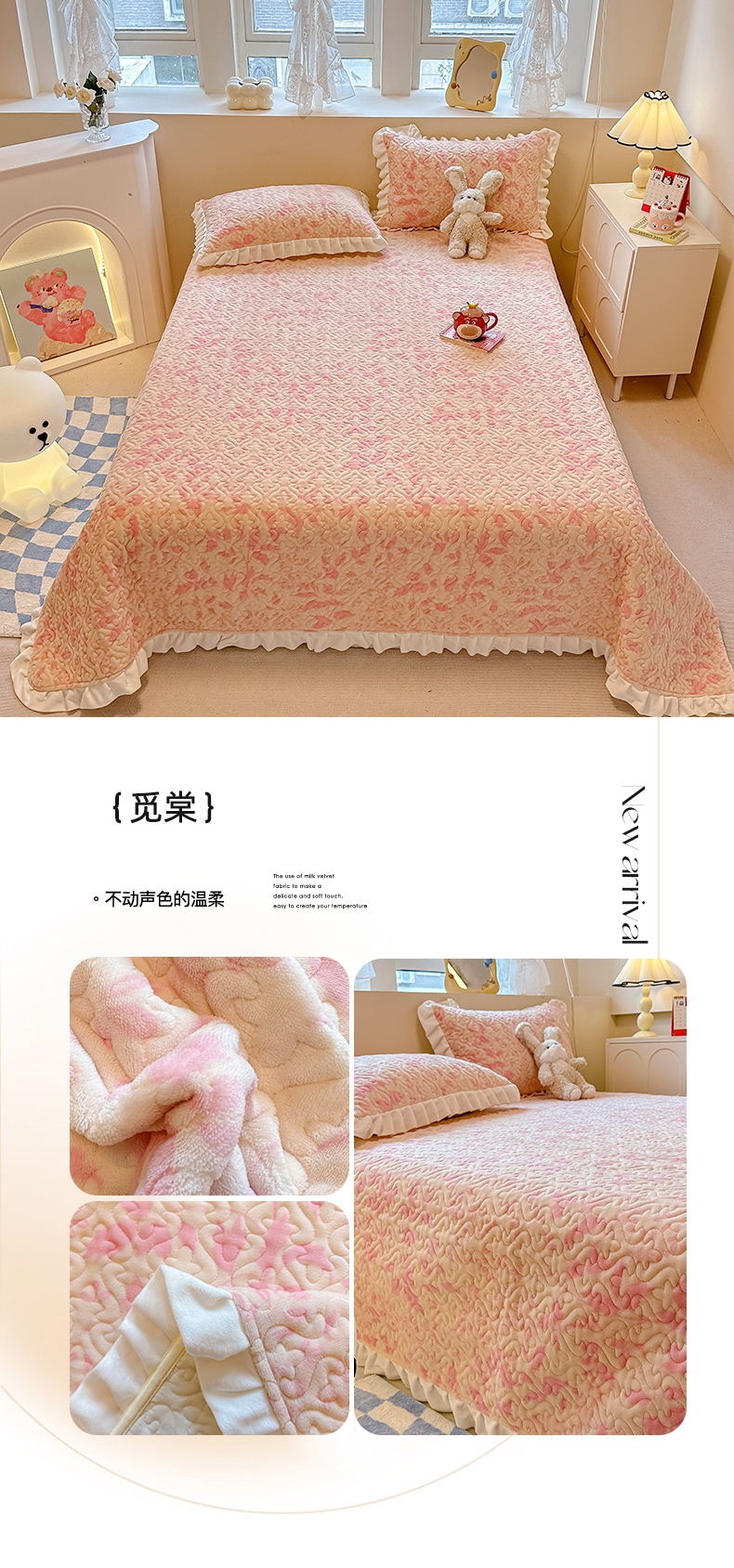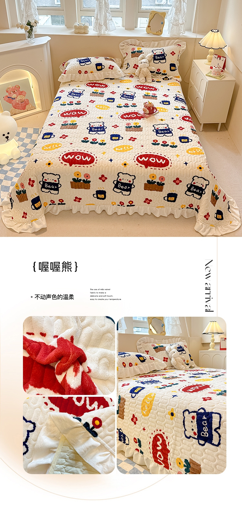 【下架】自然醒牛奶绒花边夹棉床盖冬季保暖珊瑚法兰绒榻榻米防滑加厚床单三件套炕单JY