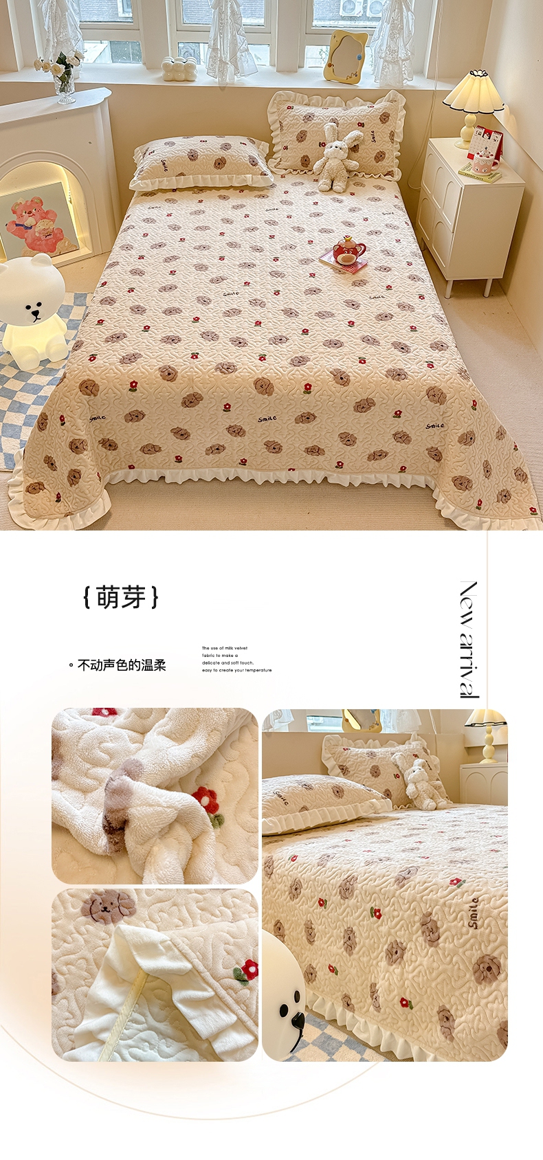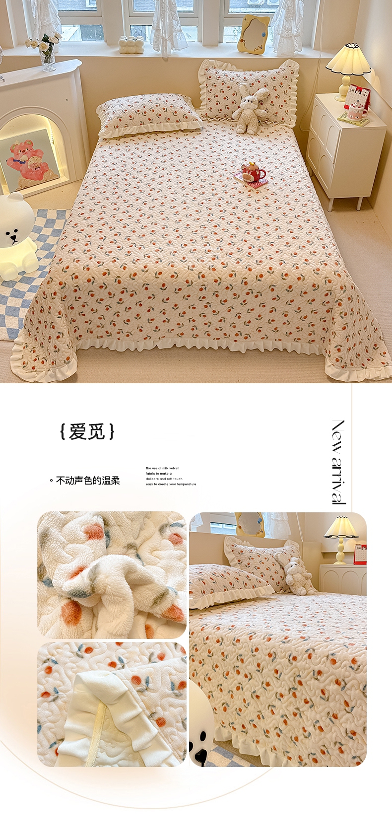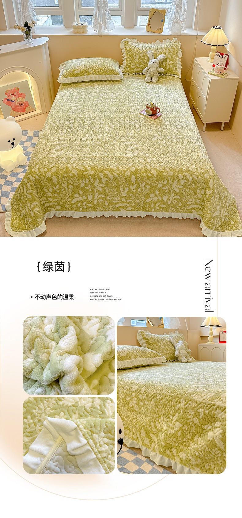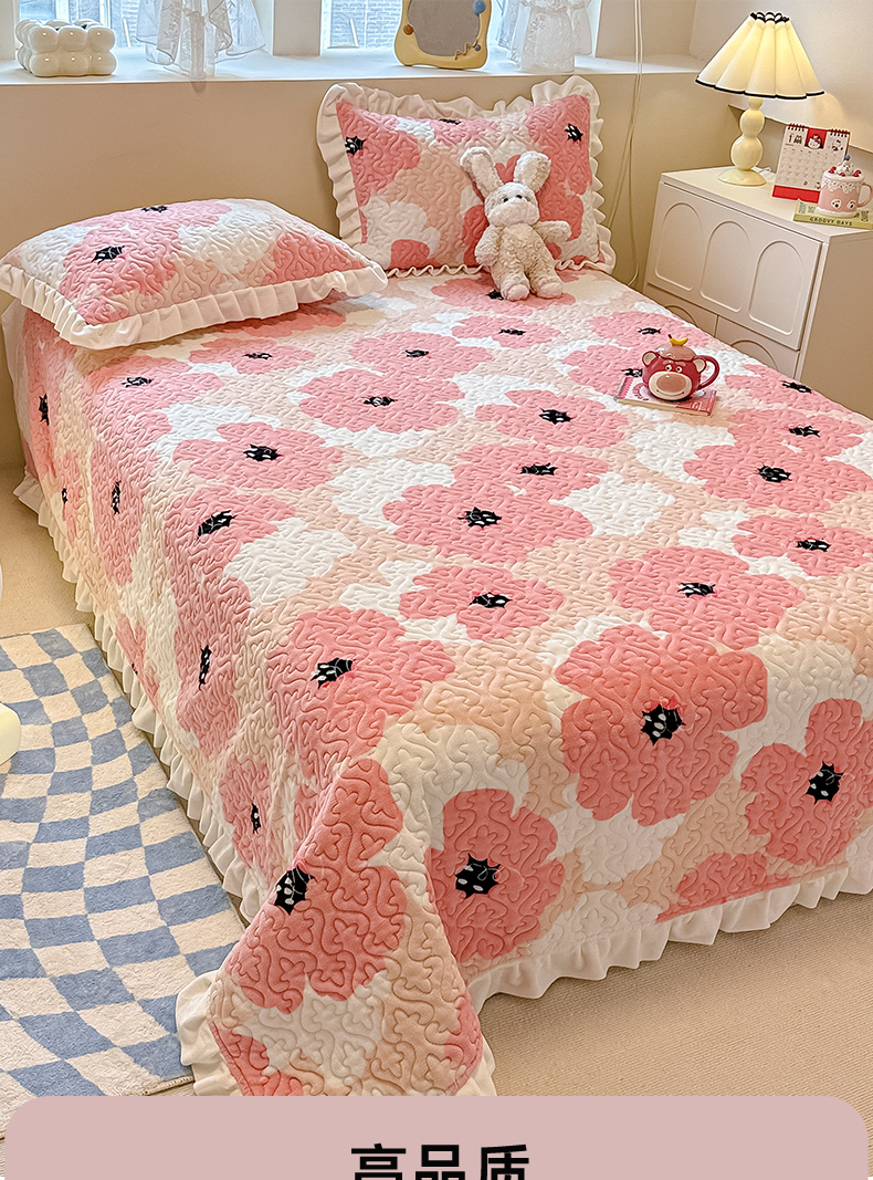 【下架】自然醒牛奶绒花边夹棉床盖冬季保暖珊瑚法兰绒榻榻米防滑加厚床单三件套炕单JY