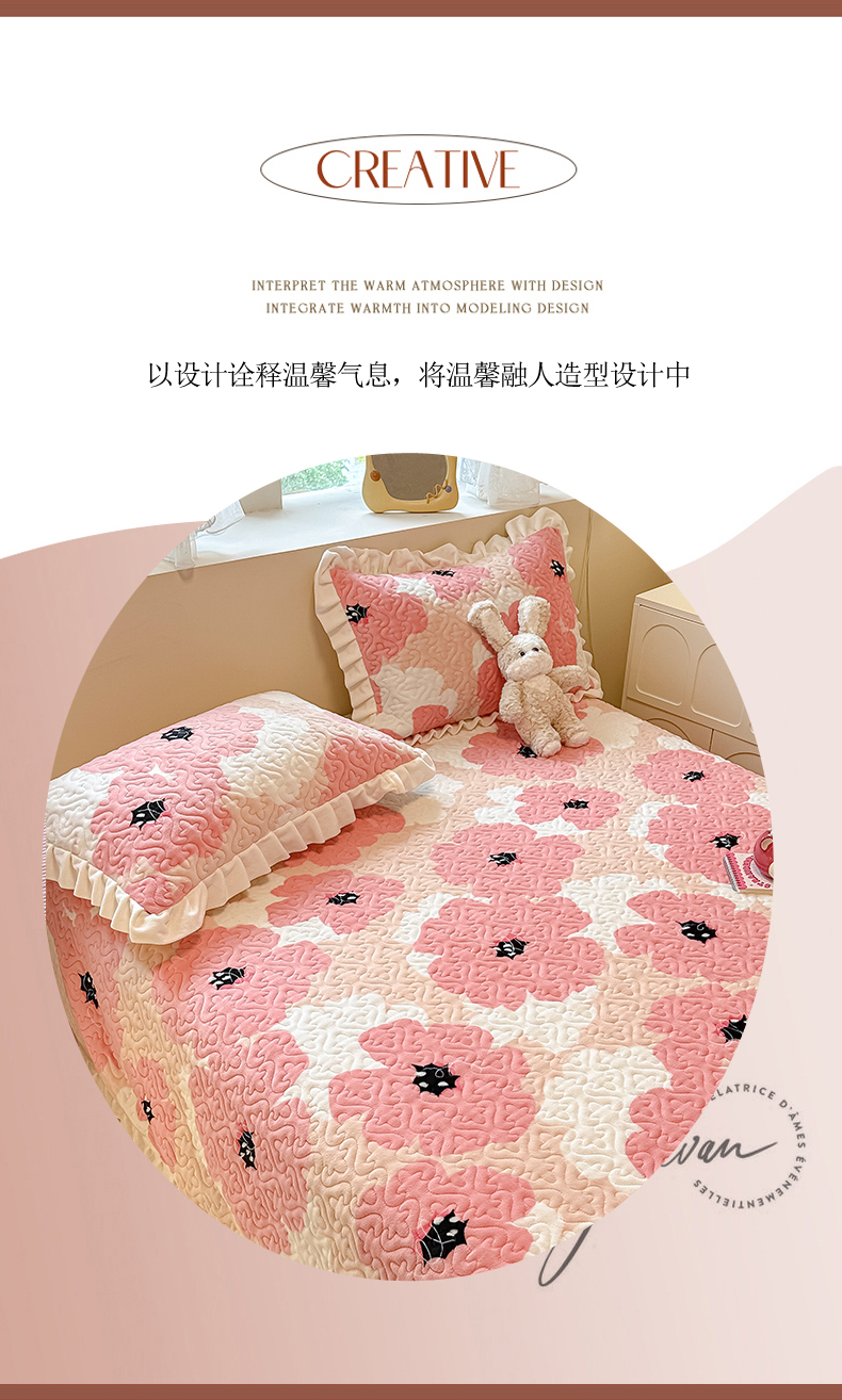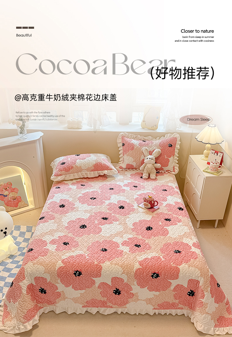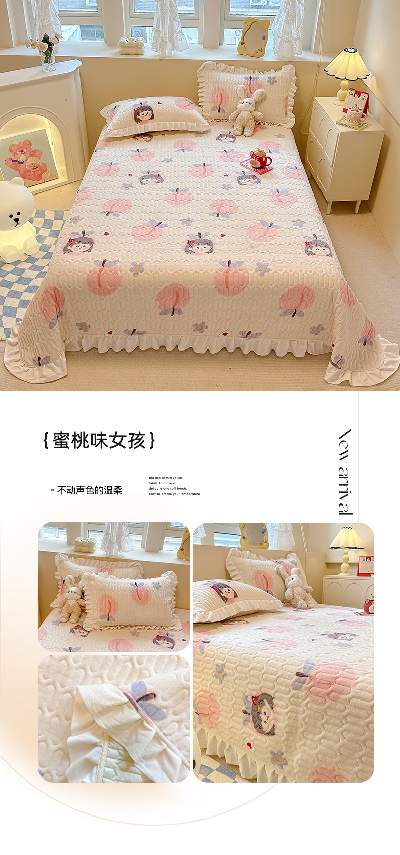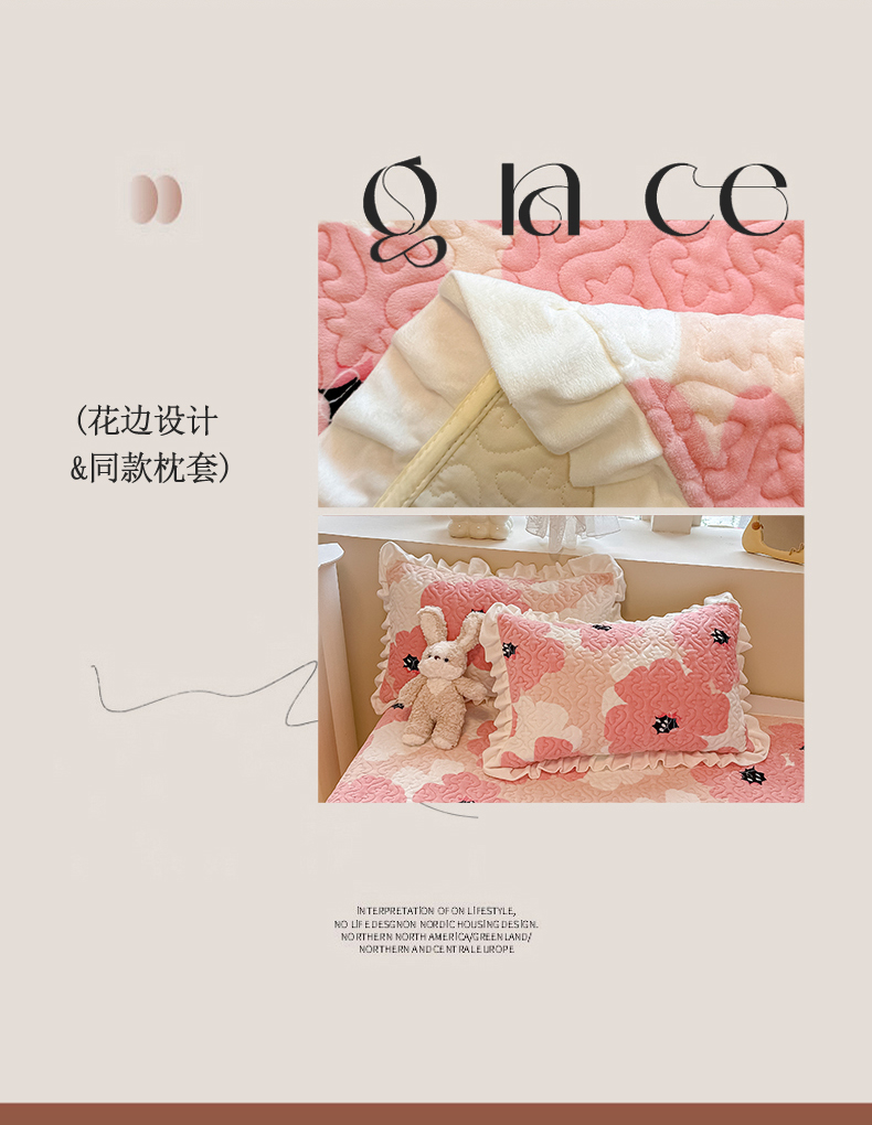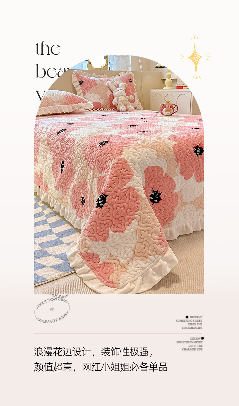 【下架】自然醒牛奶绒花边夹棉床盖冬季保暖珊瑚法兰绒榻榻米防滑加厚床单三件套炕单JY