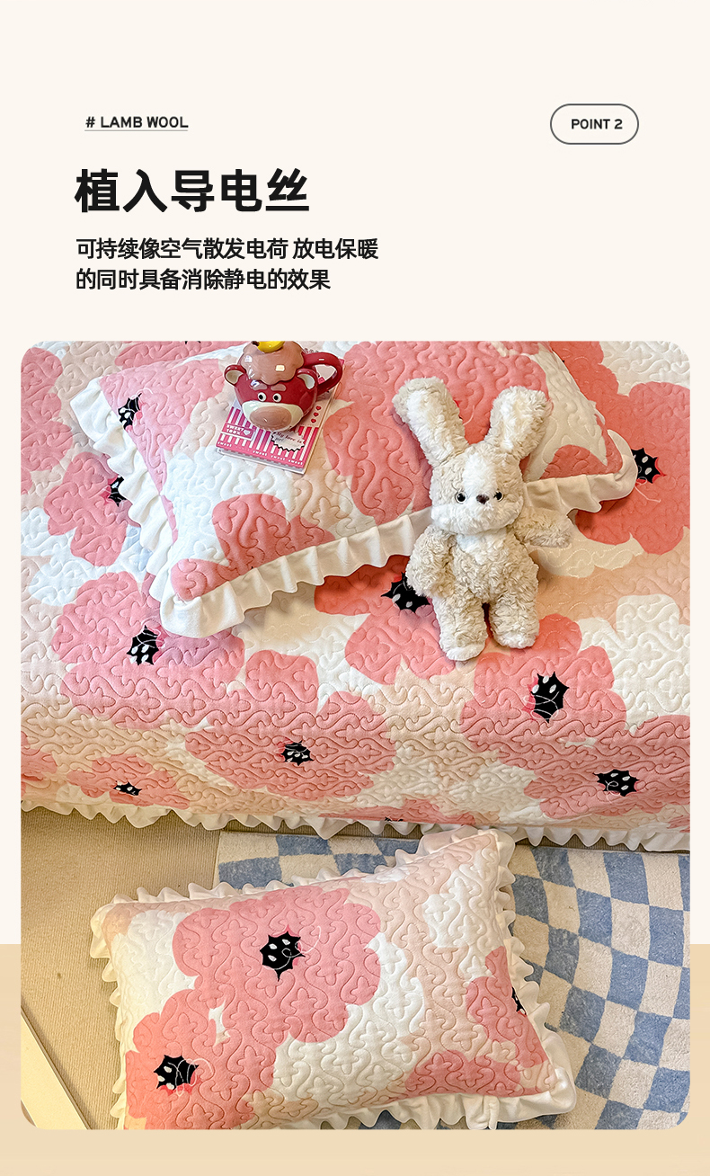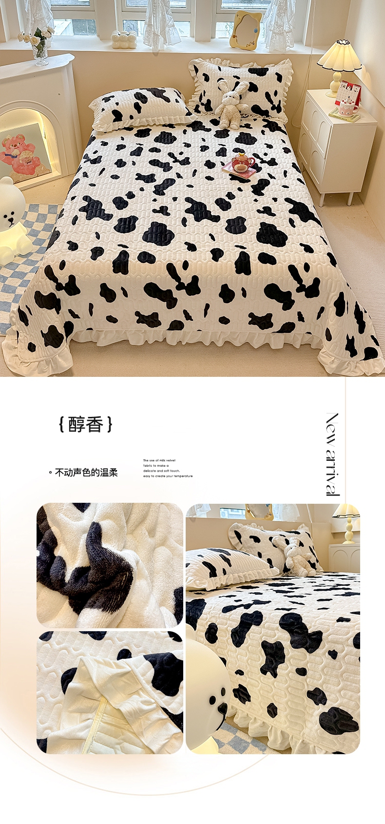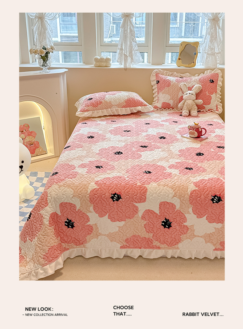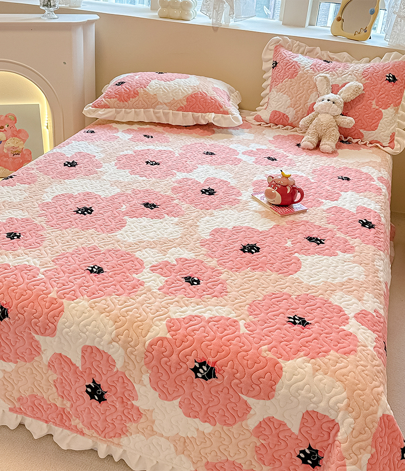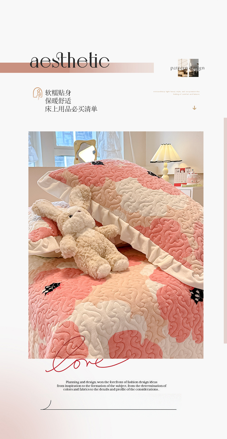 【下架】自然醒牛奶绒花边夹棉床盖冬季保暖珊瑚法兰绒榻榻米防滑加厚床单三件套炕单JY