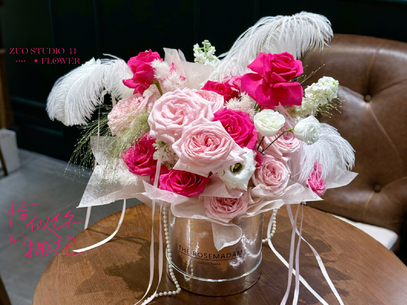 仙奢款鲜花抱抱桶【恰似你的拥抱】粉荔枝玫瑰9支/弗洛伊德玫瑰6支/洋桔梗8朵/苏菲宝贝玫瑰4朵/白罗兰3支/蓬莱松4支/鸵鸟毛3支/氛围感仪式感鲜花/