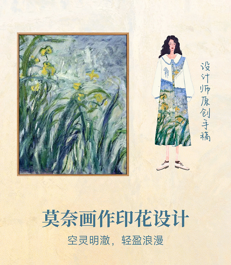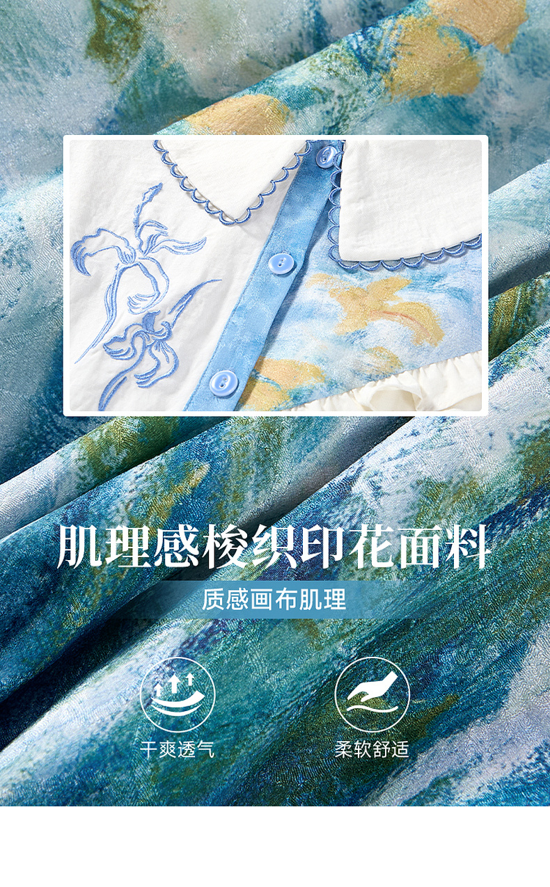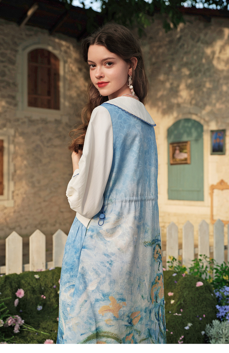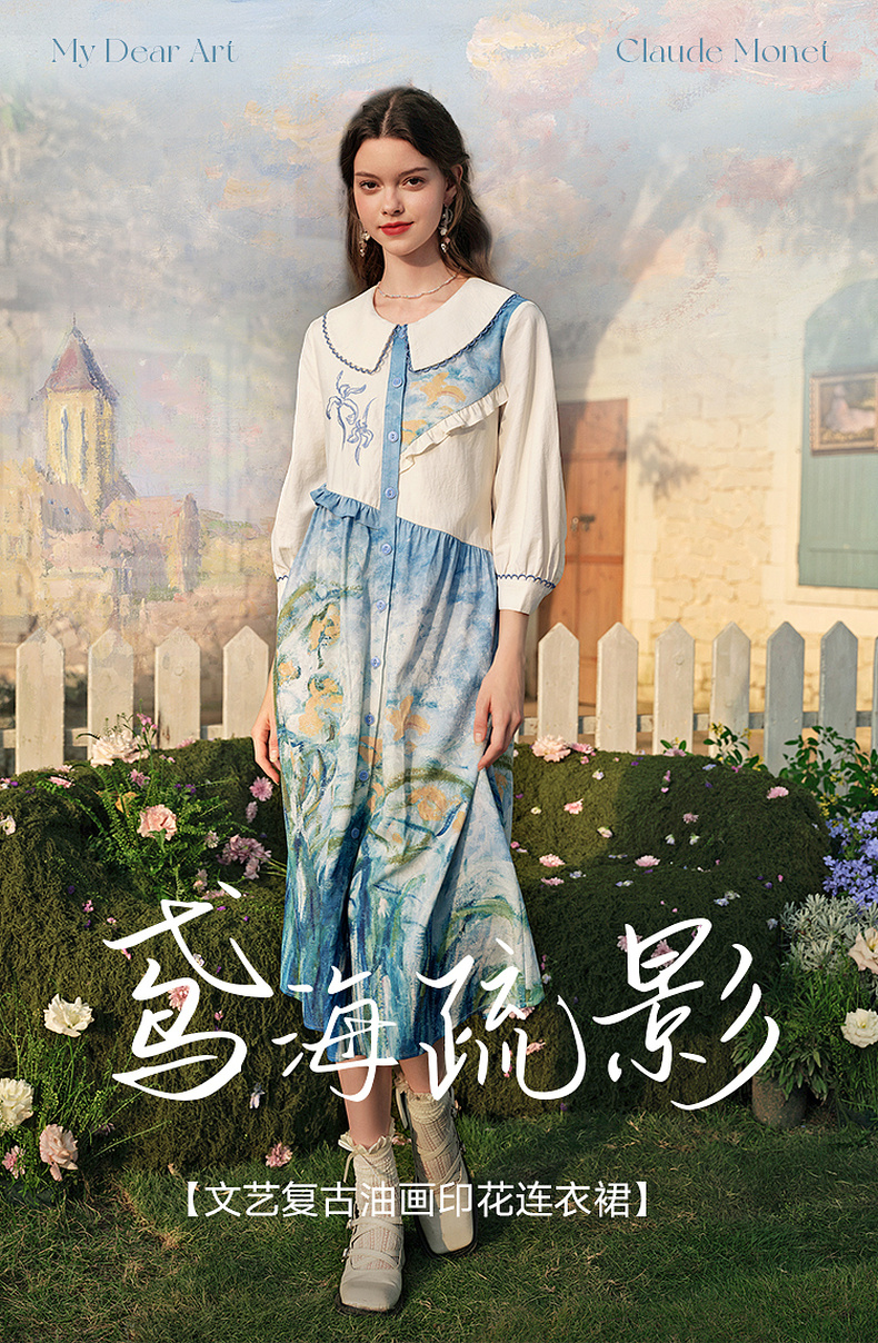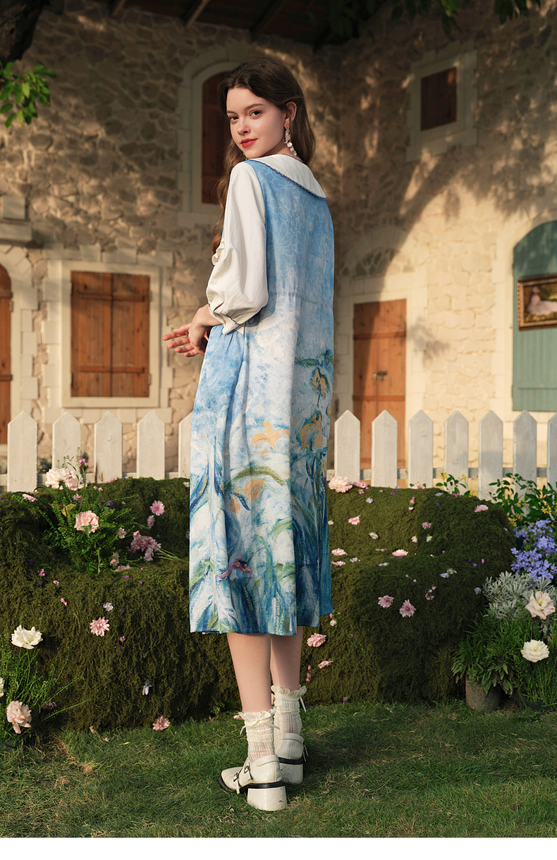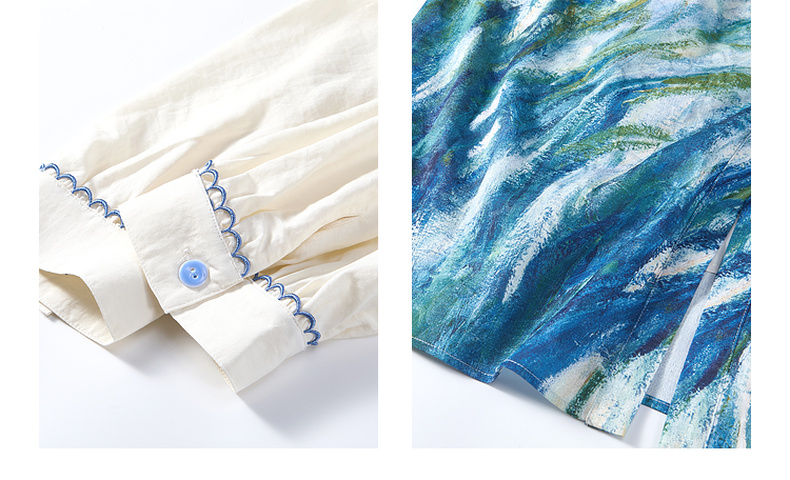 两三事心向莫奈 夏季新款文艺风油画印花口袋长袖衬衫女宽松