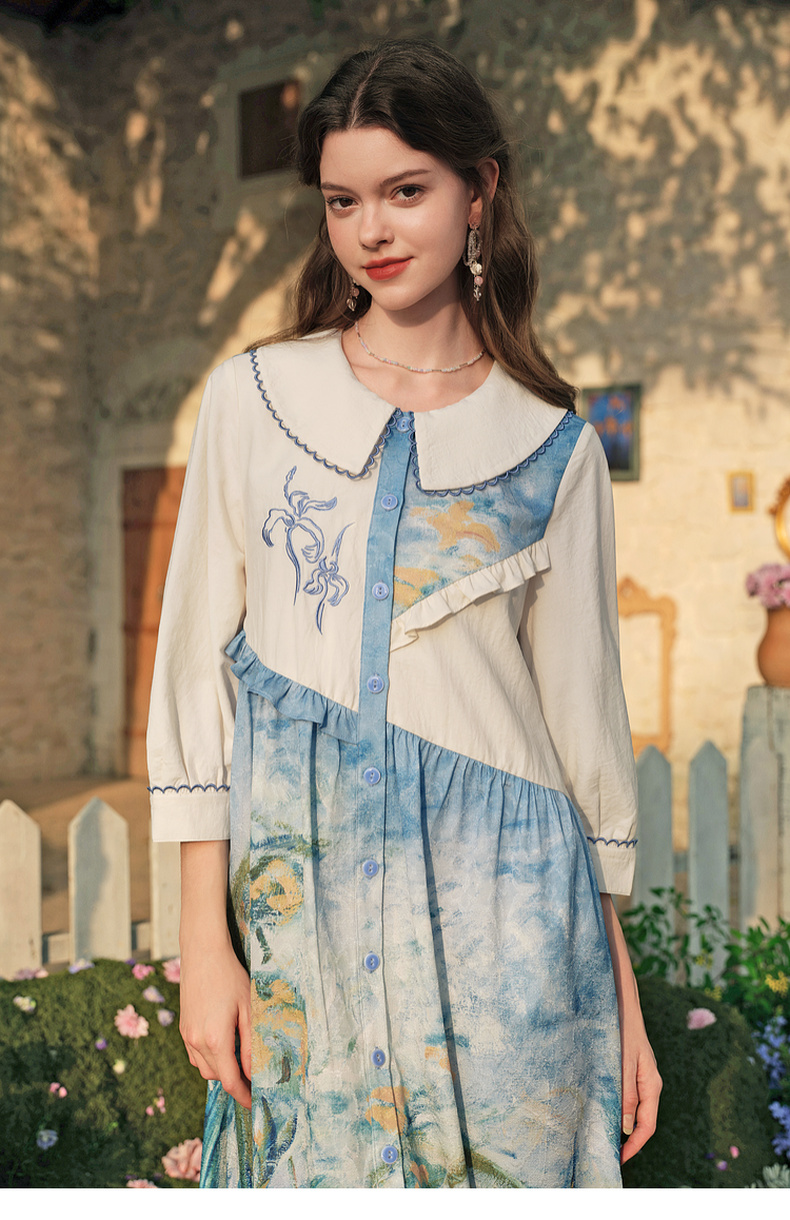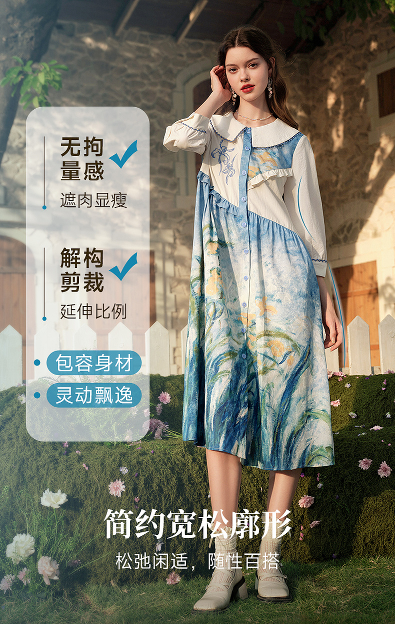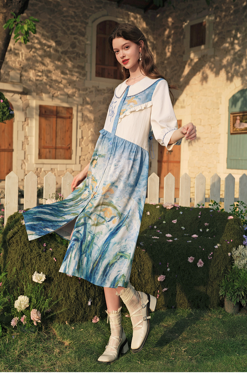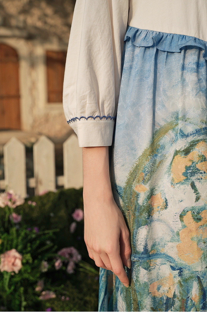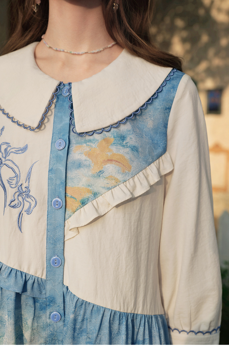 两三事 鸢海疏影 2025春季新款甜美荷叶边拼接绣花印花连衣裙