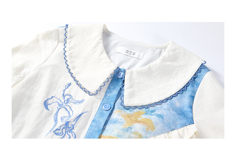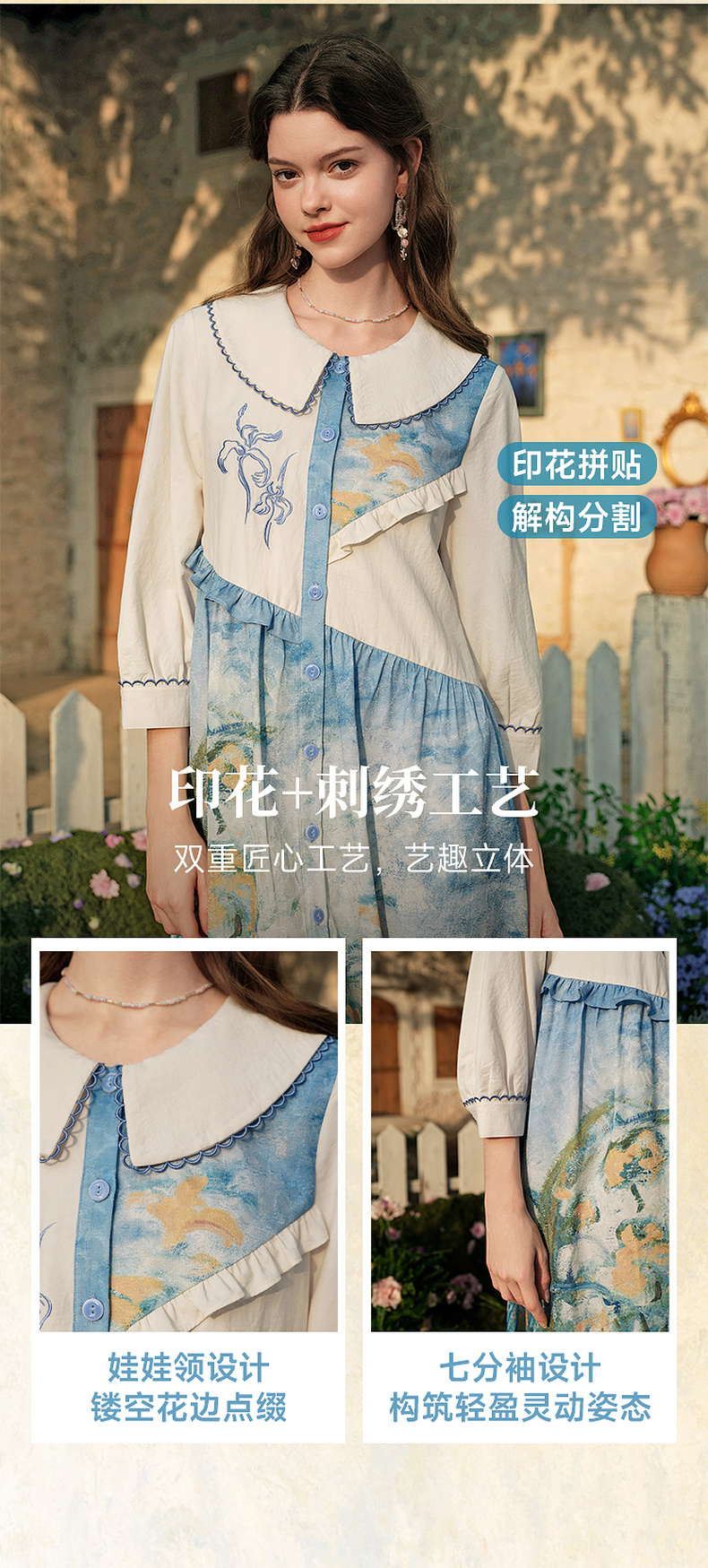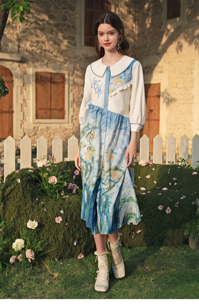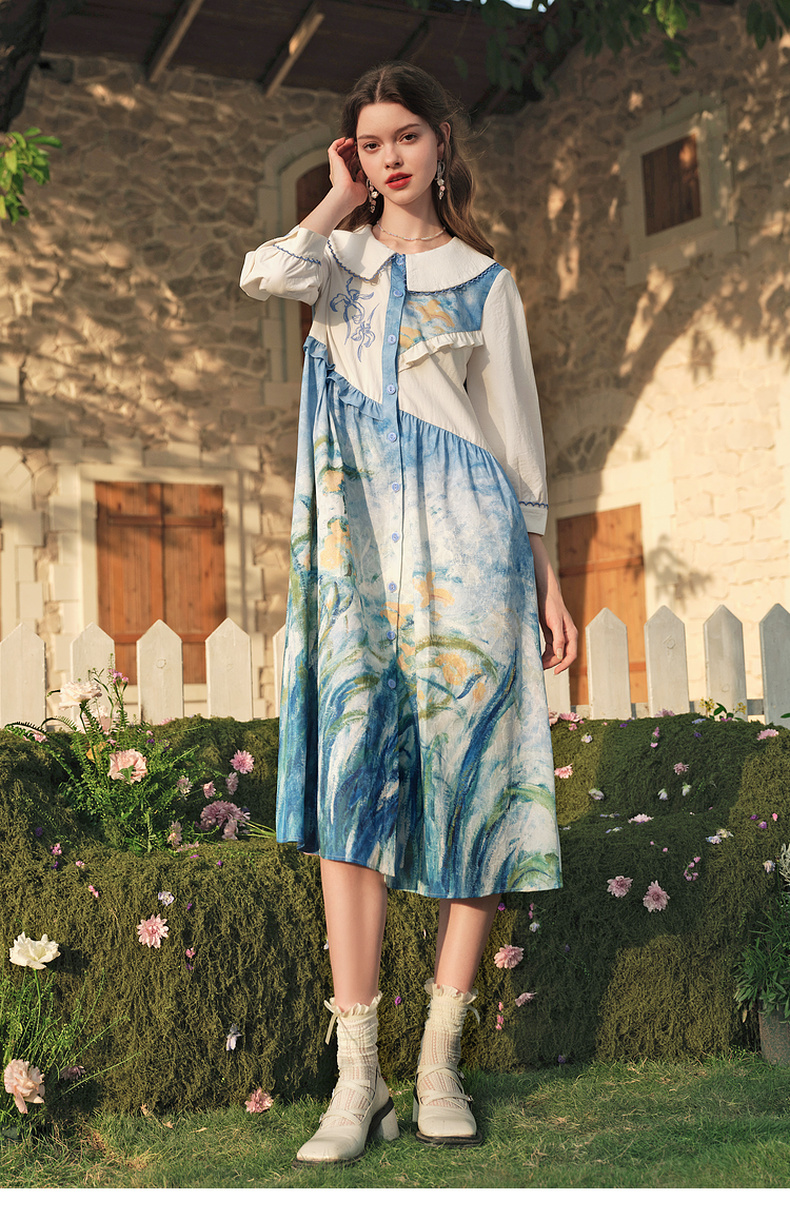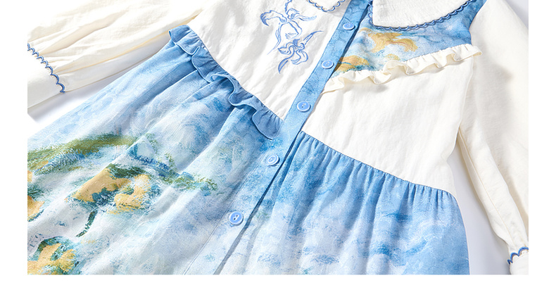 两三事 鸢海疏影 2025春季新款甜美荷叶边拼接绣花印花连衣裙
