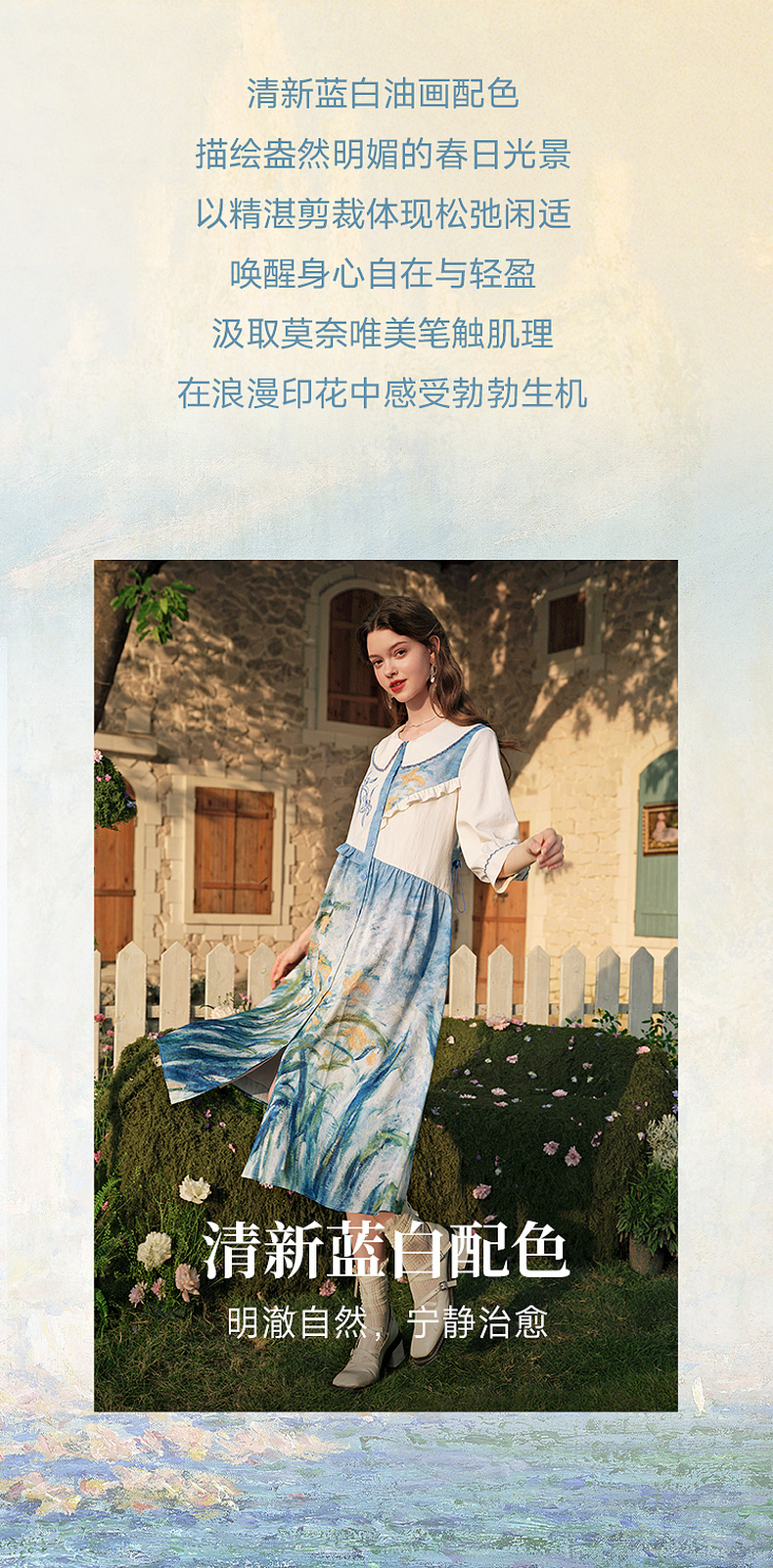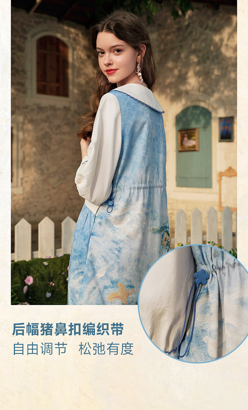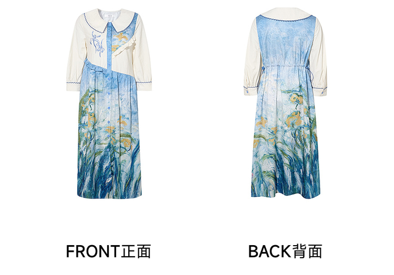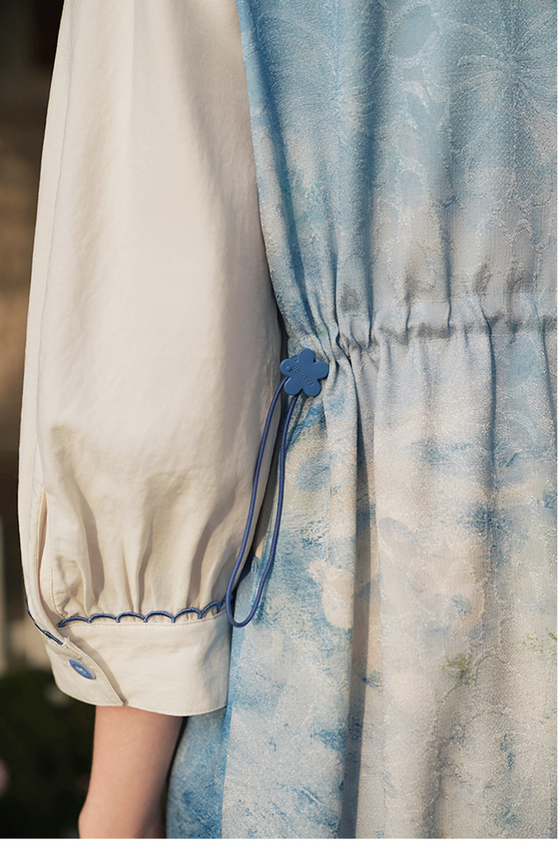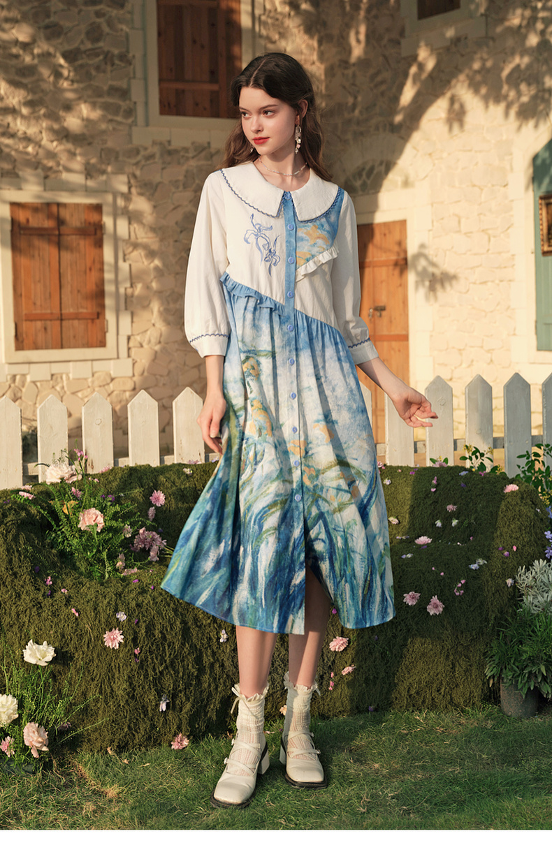 两三事 鸢海疏影 2025春季新款甜美荷叶边拼接绣花印花连衣裙